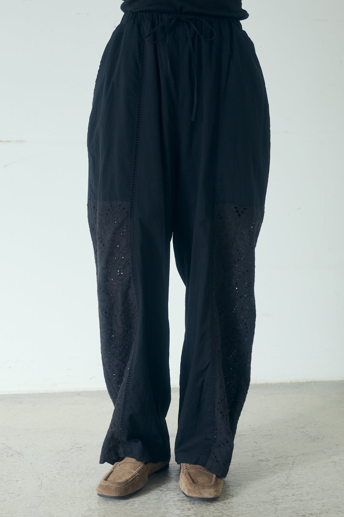 軽やかな透け感が、装いにやわらかなニュアンスを添える一本。 繊細なローンレースを切り替えにあしらったイージーパンツ。さりげない透け感と立体的な柄が動きに合わせて表情を生み、シンプルなスタイリングにも奥行きを加えてくれます。 ウエストはドローストリング仕様で調整しやすく、リラックスした穿き心地も魅力。ほどよくゆとりのあるシルエットが自然な落ち感を生み、ラフになりすぎないバランスに仕上がっています。 シャツやニットと合わせた軽やかな装いはもちろん、ワンピースとのレイヤードにも好相性。日常使いからお出かけまで幅広く取り入れやすい、着回し力の高いアイテムです。