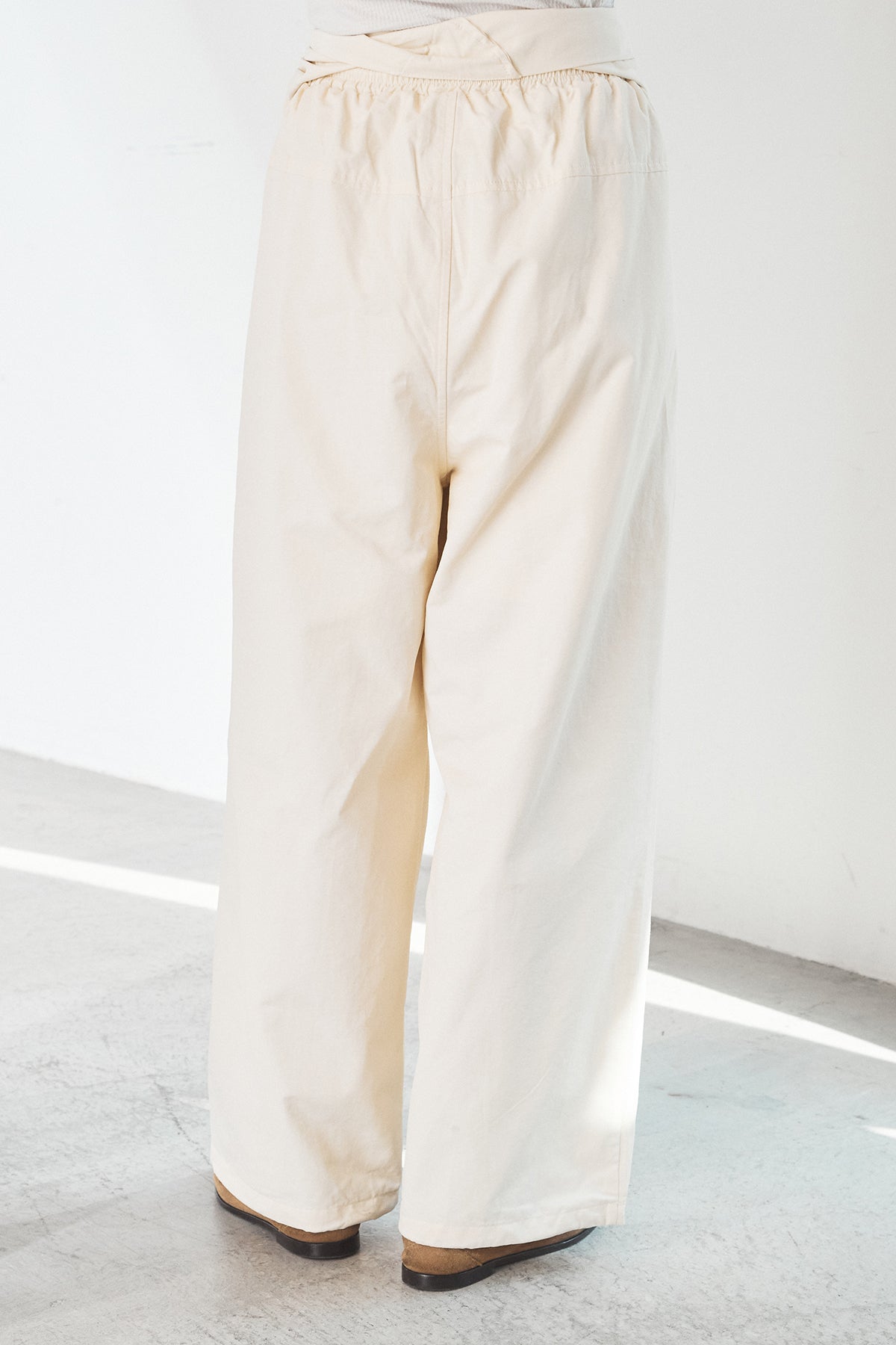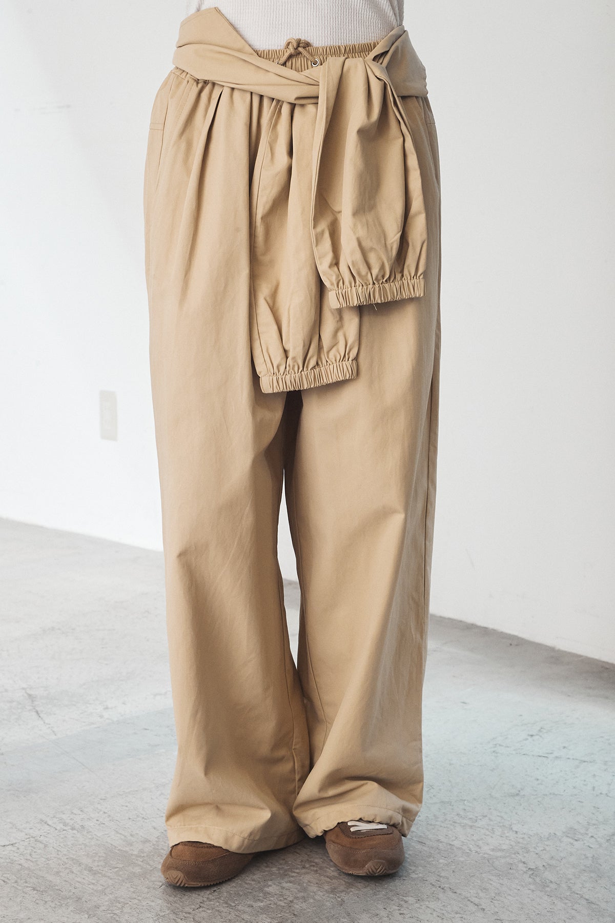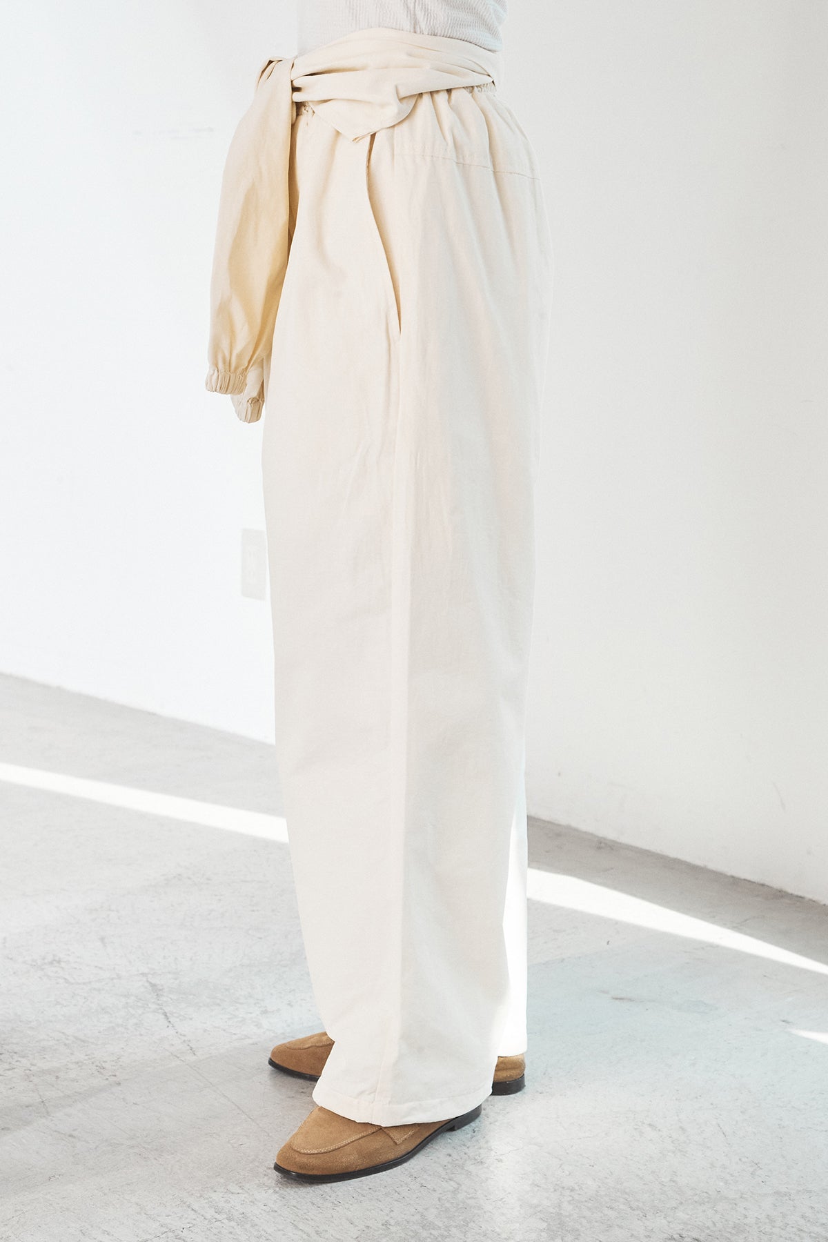 合繊ツイル素材を使用した、スタンドウエストデザインが印象的な巻き仕様のジョガーパンツ。程よいハリと落ち感のある生地が、リラックス感ときれいめな表情を両立します。ウエスト部分は巻きデザインを取り入れ、立体的で存在感のあるアクセントに。裾はゴム仕様でシルエットにメリハリを加え、足元をすっきりと演出します。シンプルなトップスを合わせるだけでスタイリングが決まる、デザイン性と実用性を兼ね備えた一本です。