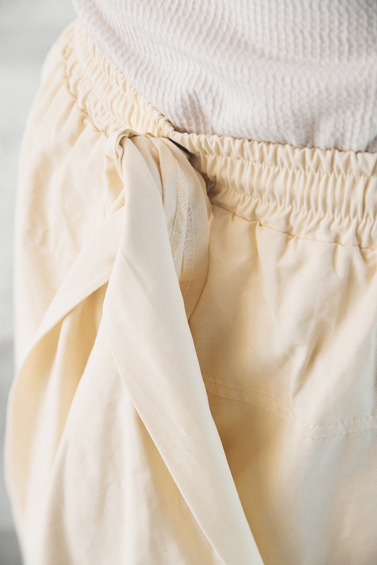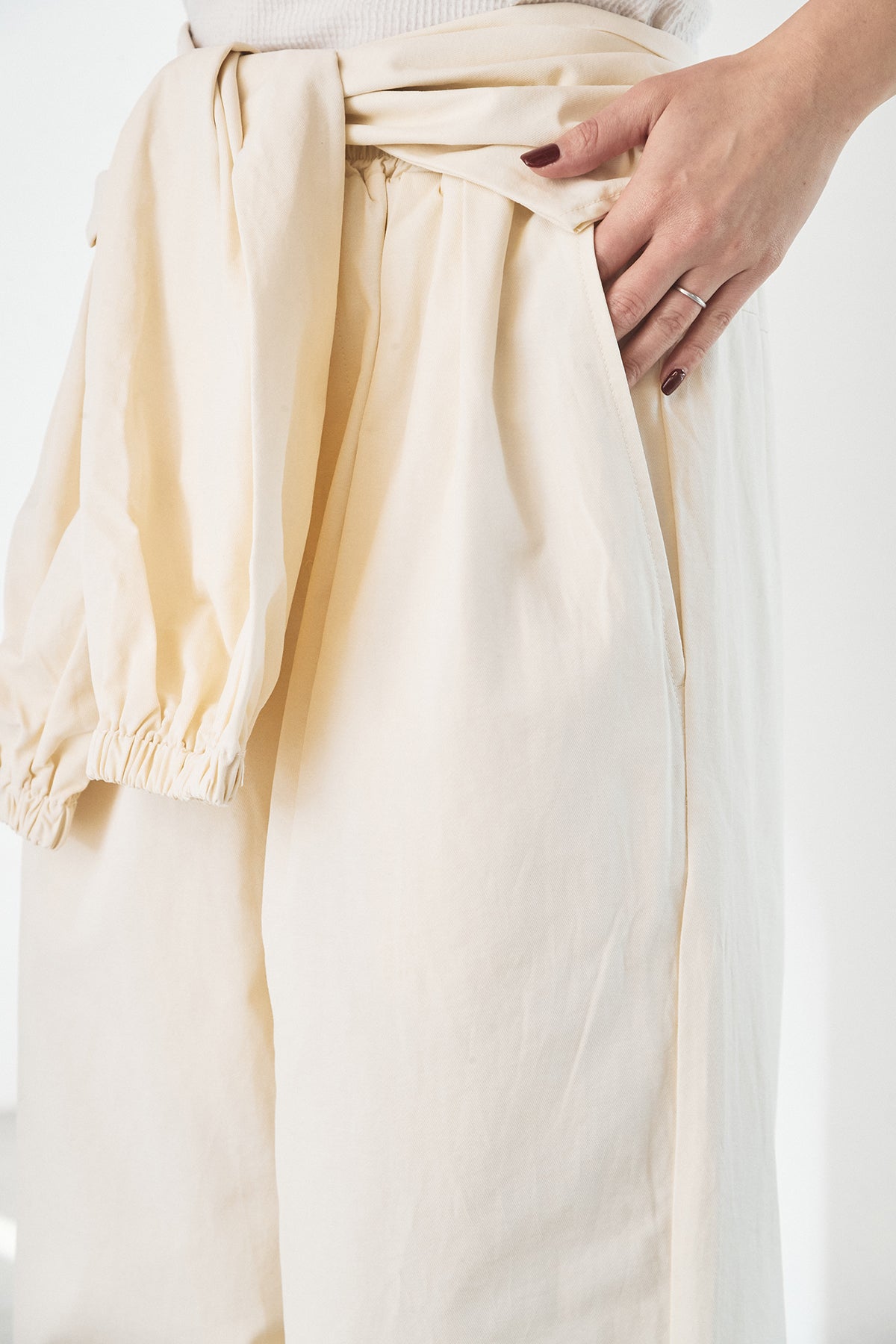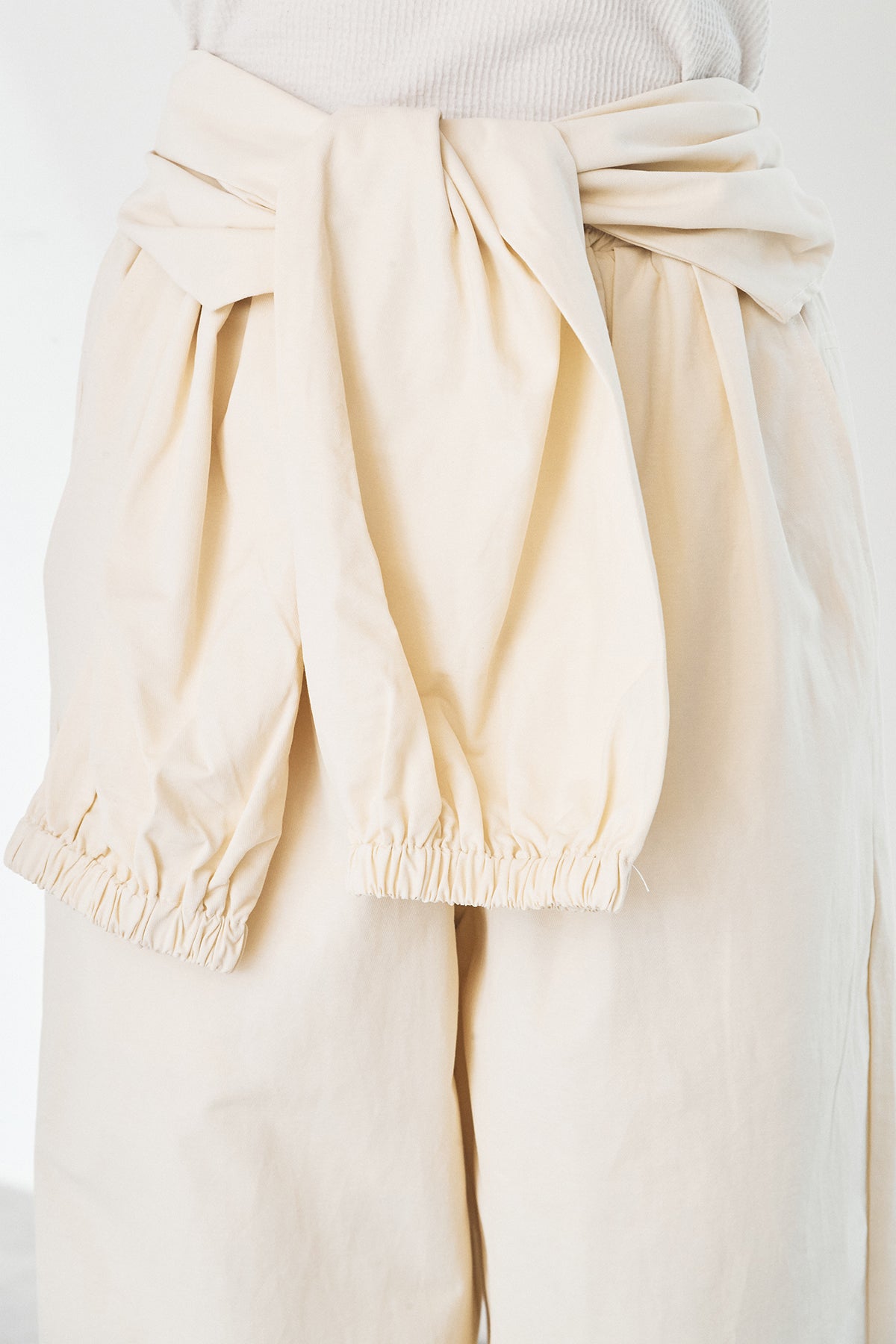 合繊ツイル素材を使用した、スタンドウエストデザインが印象的な巻き仕様のジョガーパンツ。程よいハリと落ち感のある生地が、リラックス感ときれいめな表情を両立します。ウエスト部分は巻きデザインを取り入れ、立体的で存在感のあるアクセントに。裾はゴム仕様でシルエットにメリハリを加え、足元をすっきりと演出します。シンプルなトップスを合わせるだけでスタイリングが決まる、デザイン性と実用性を兼ね備えた一本です。