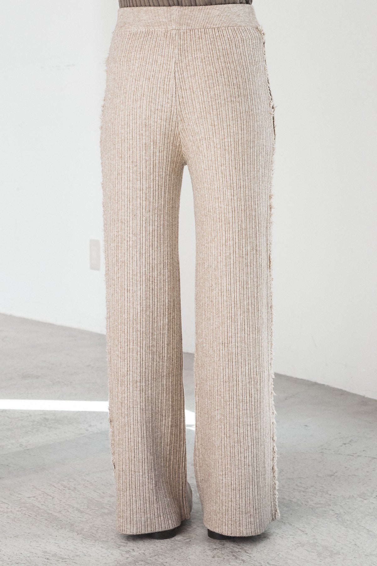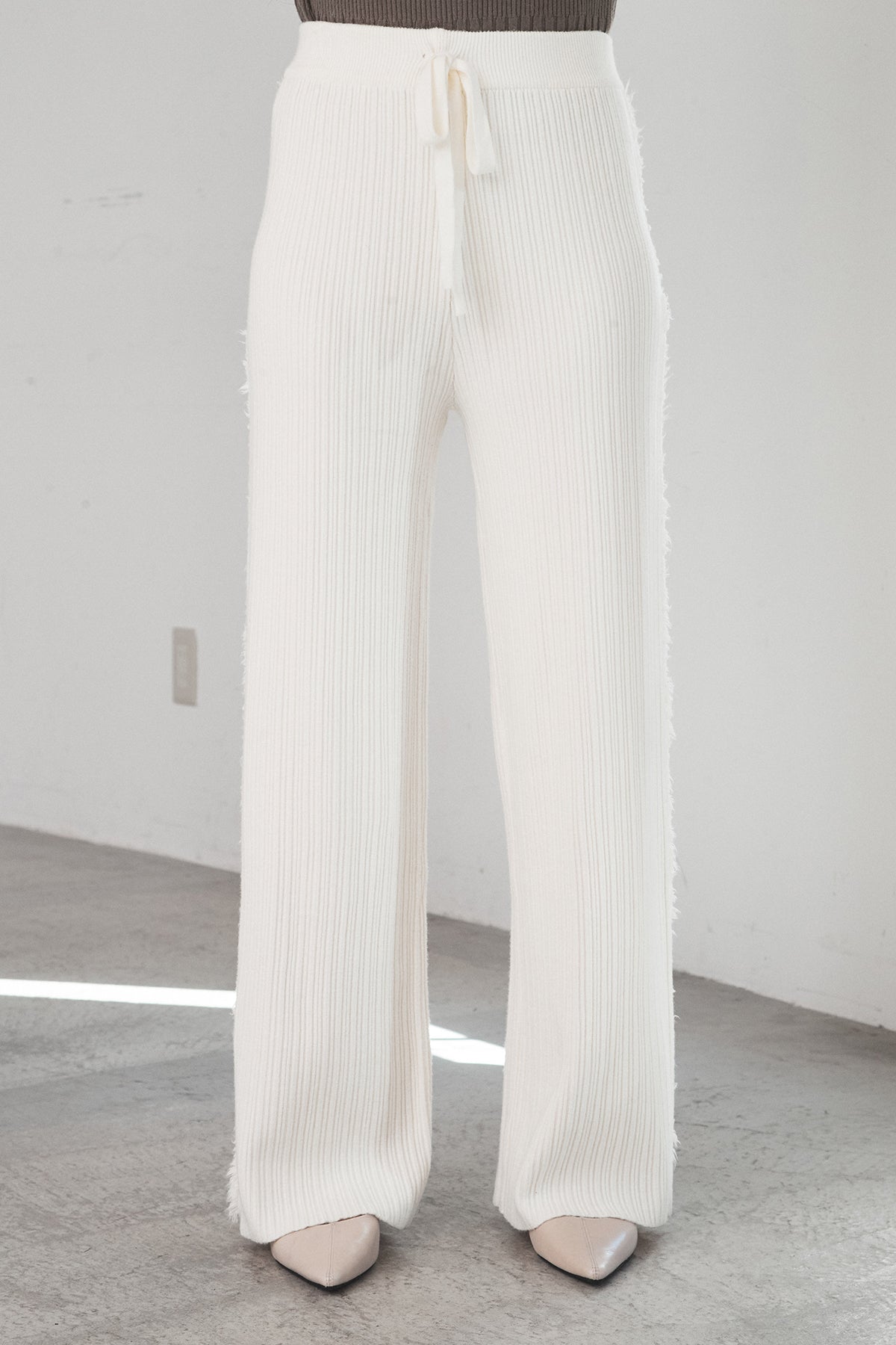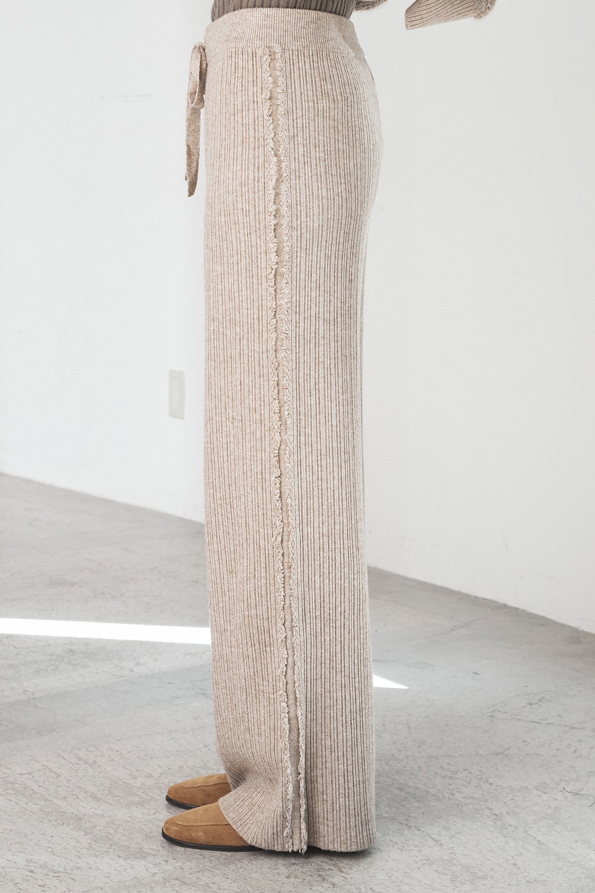 サイドにあしらったフリンジが、動くたびにさりげないアクセントを添えるニットパンツ。縦ラインを意識したデザインで、リラックス感がありながらもすっきりとした印象に仕上げています。柔らかな素材感で穿き心地もよく、同素材のトップスと合わせたセットアップ風の着こなしもおすすめ。シンプルなコーディネートに表情をプラスしてくれる一本です。