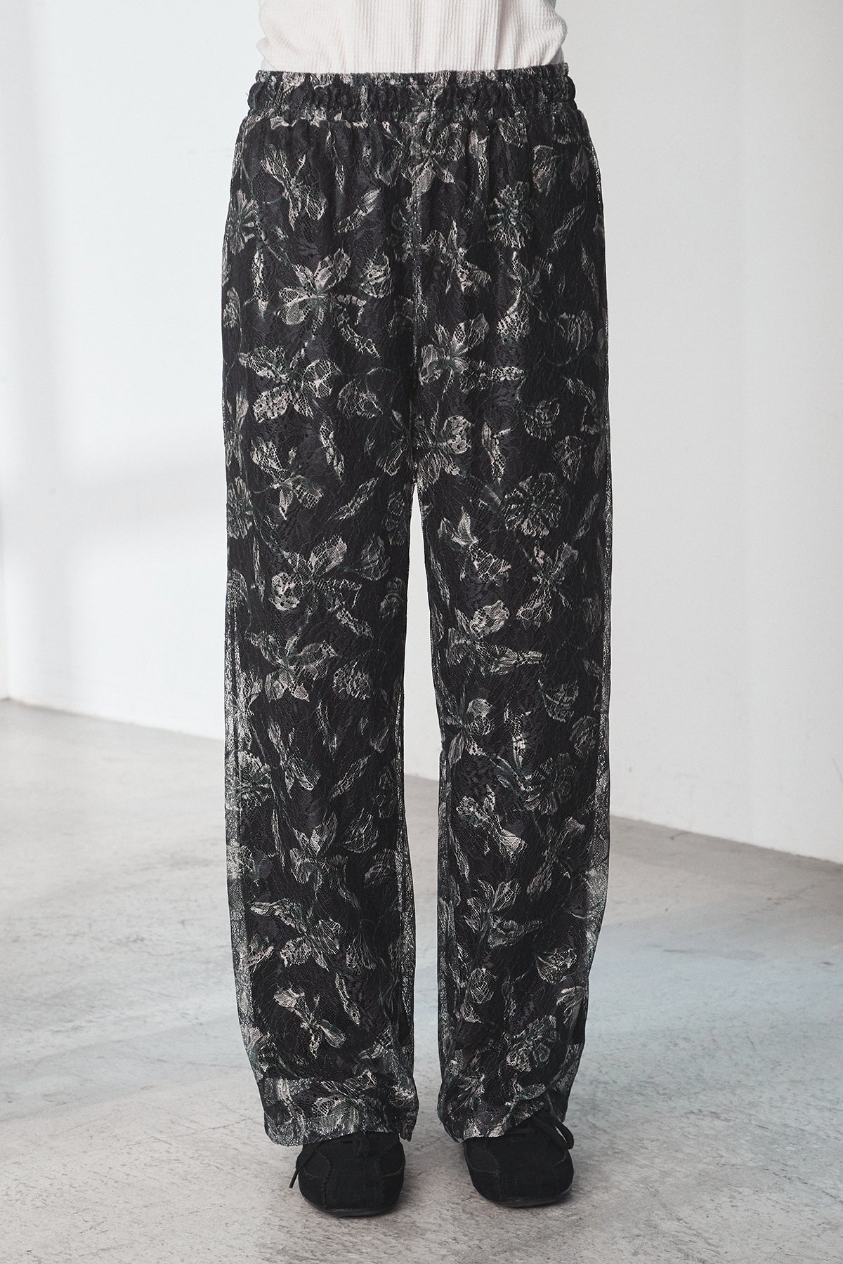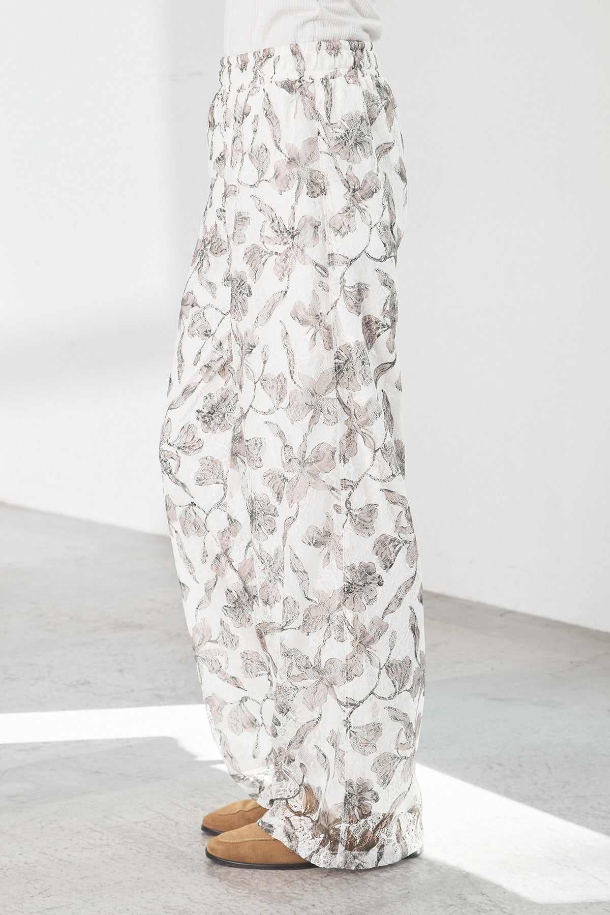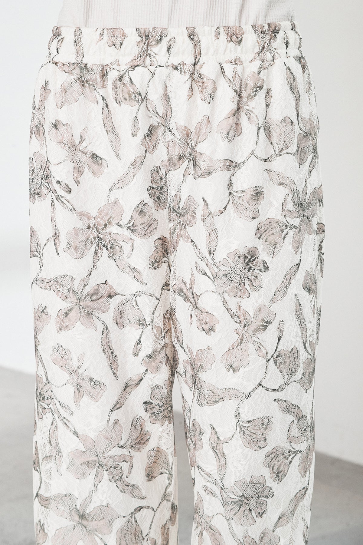 フラワープリントを施したレース素材のパンツ。 軽やかな透け感があり、コーデにさりげない表情を加えます。 ストンと落ちるシルエットで、柄アイテムでも取り入れやすいデザイン。 シンプルなトップスと合わせるだけで、デイリーに活躍します。