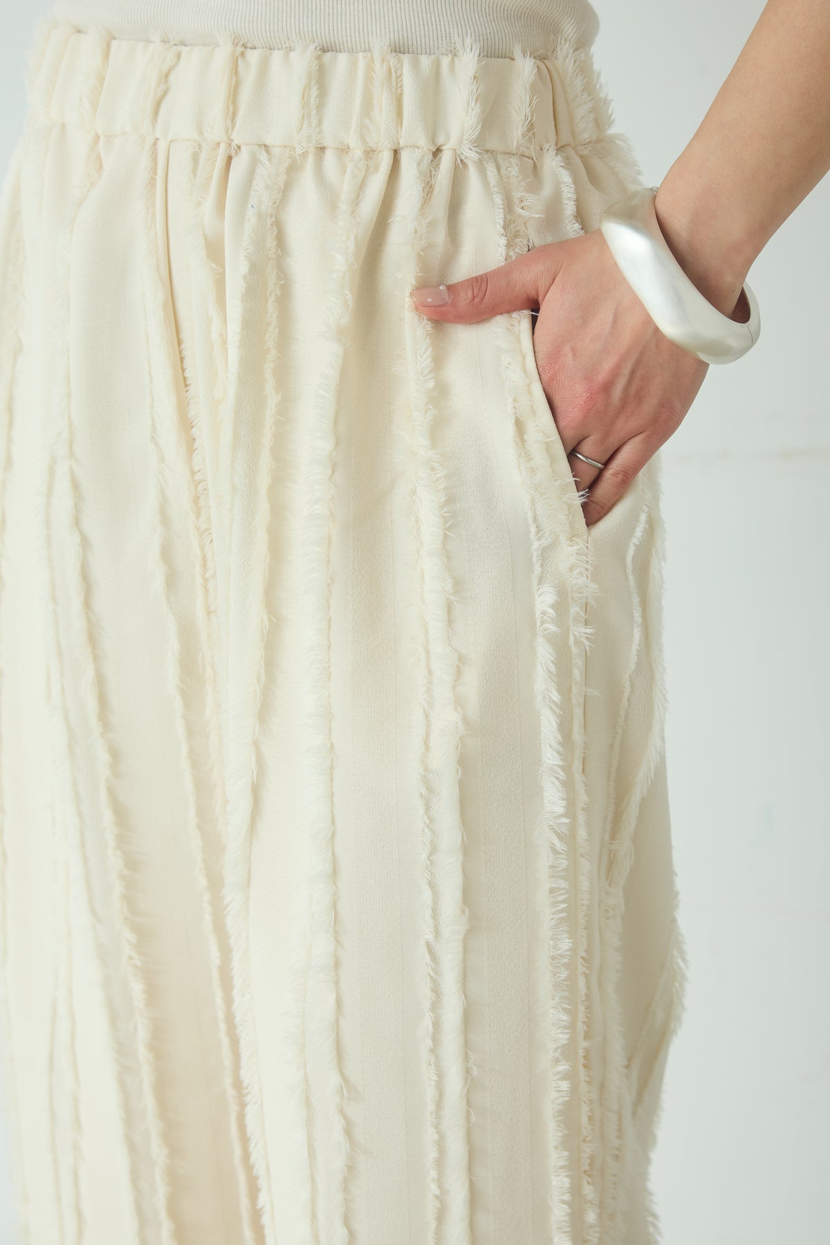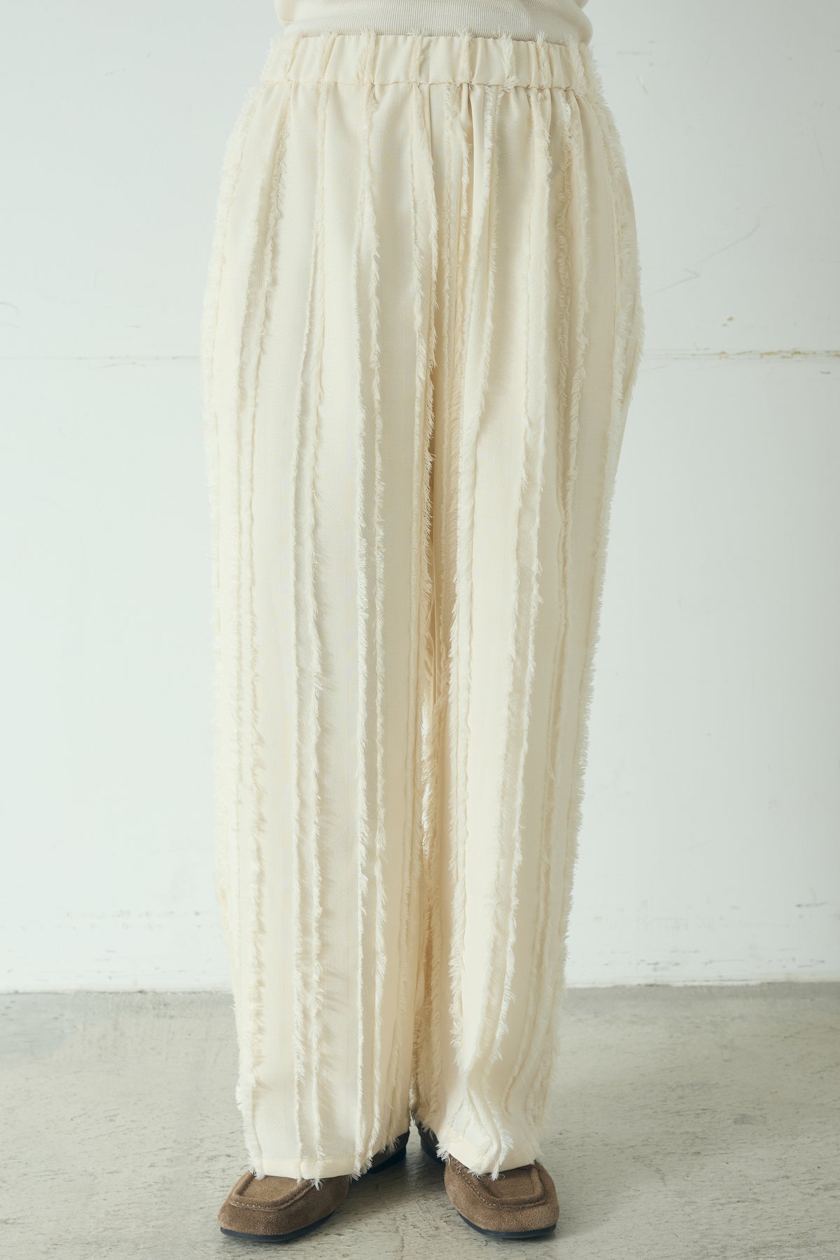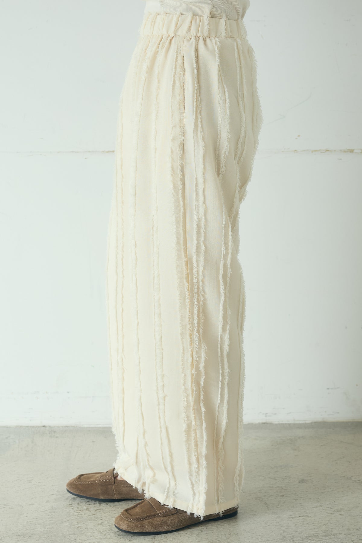 全体に施されたフリンジ加工が目を引く、存在感たっぷりのイージーワイドパンツ。 ナチュラルなアイボリーカラーに、立体的な縦ラインのフリンジが加わることで、シンプルなトップスと合わせるだけで様になる、主役級のアイテムです。 ウエストは総ゴム仕様で、穿き心地はリラクシーそのもの。ヒップラインを拾わないゆったりとしたストレートシルエットと、フリンジの縦長効果で、スタイルアップも叶えます。柔らかな素材感で動きやすく、リラックス感とおしゃれを両立できる一着です。