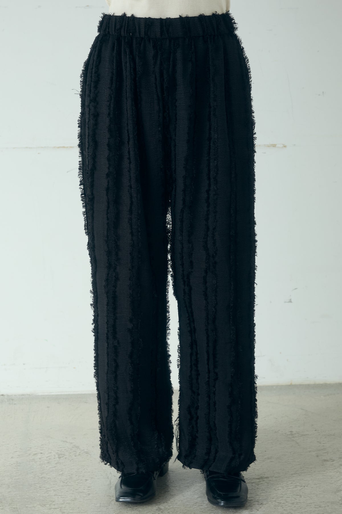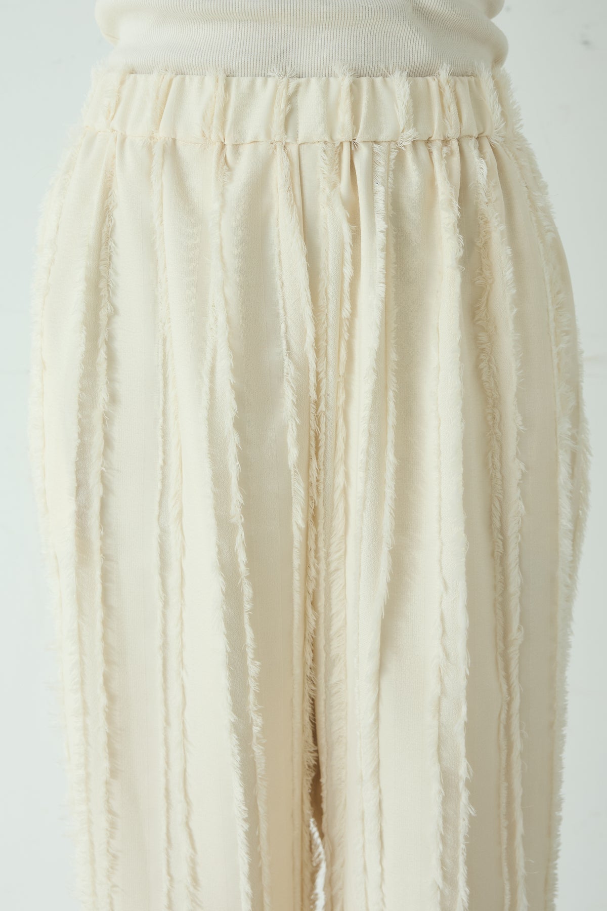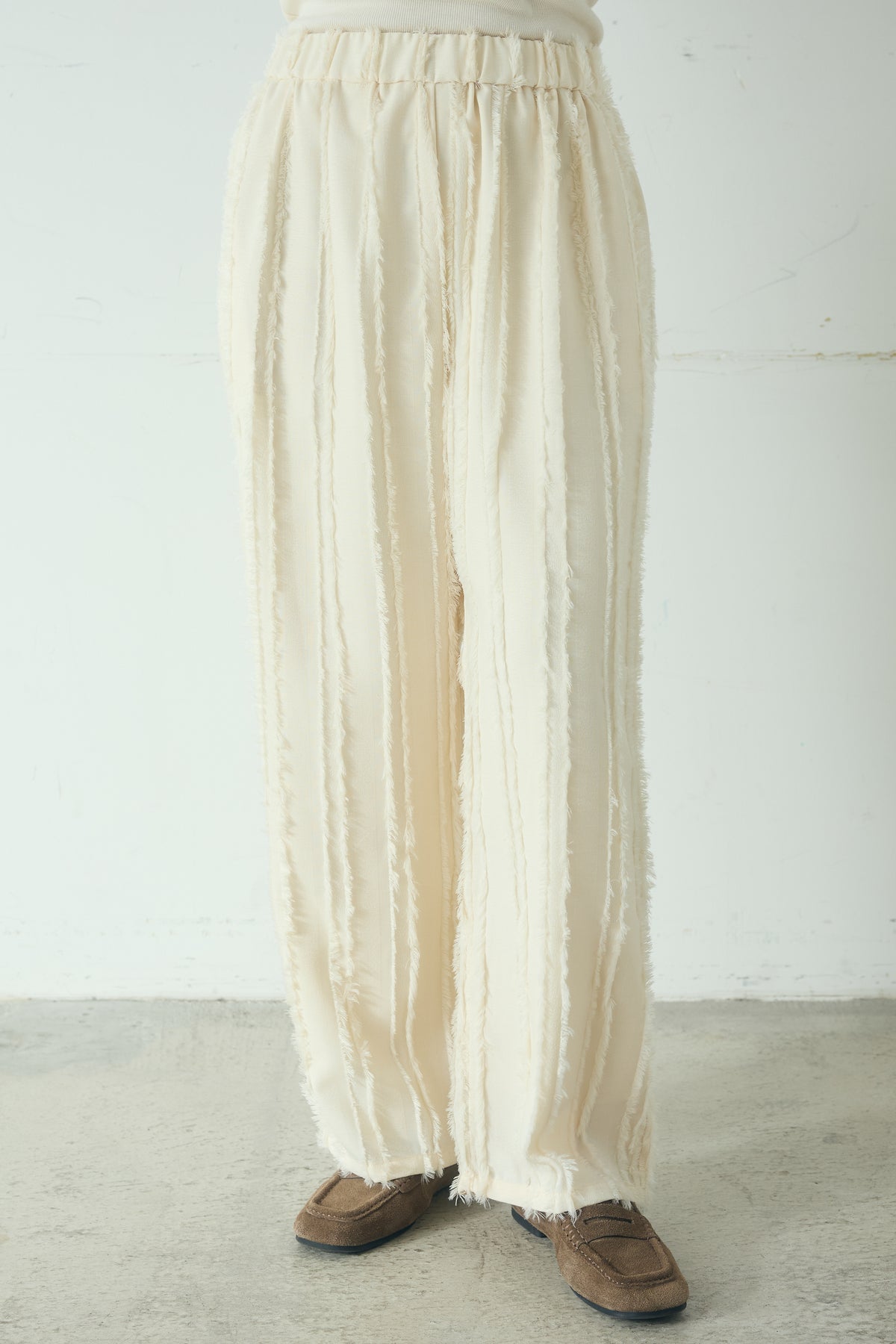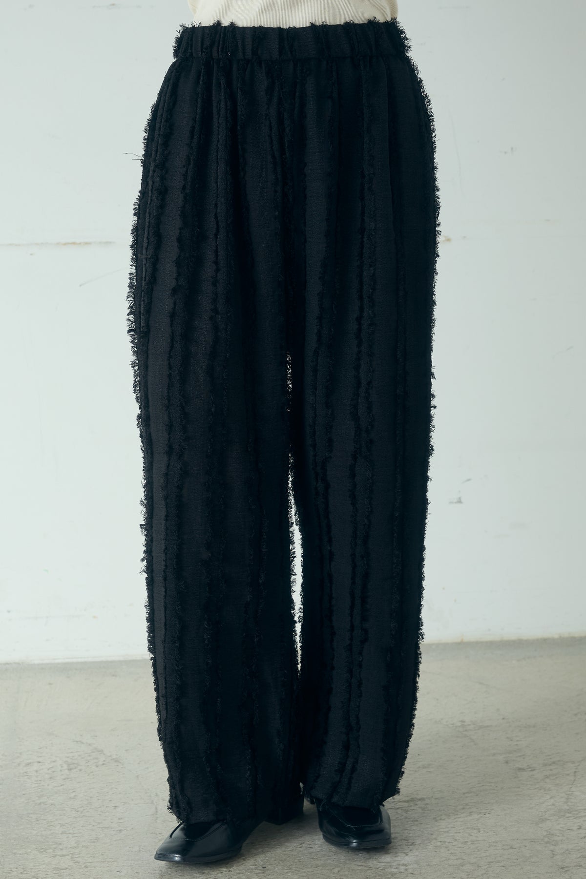 全体に施されたフリンジ加工が目を引く、存在感たっぷりのイージーワイドパンツ。 ナチュラルなアイボリーカラーに、立体的な縦ラインのフリンジが加わることで、シンプルなトップスと合わせるだけで様になる、主役級のアイテムです。 ウエストは総ゴム仕様で、穿き心地はリラクシーそのもの。ヒップラインを拾わないゆったりとしたストレートシルエットと、フリンジの縦長効果で、スタイルアップも叶えます。柔らかな素材感で動きやすく、リラックス感とおしゃれを両立できる一着です。