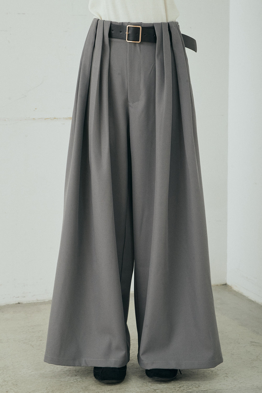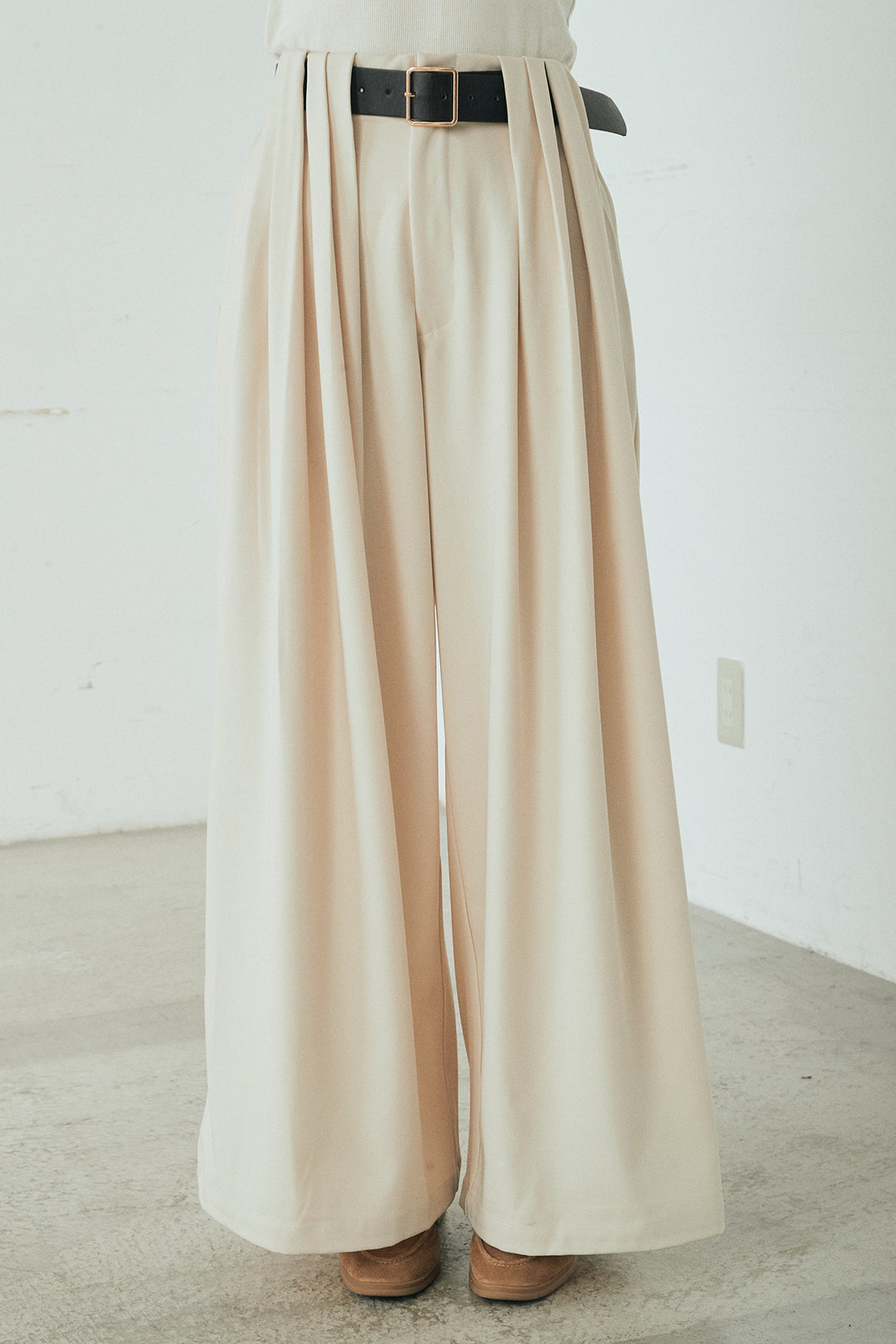 細フェイクレザーベルト付きワイドタックパンツ