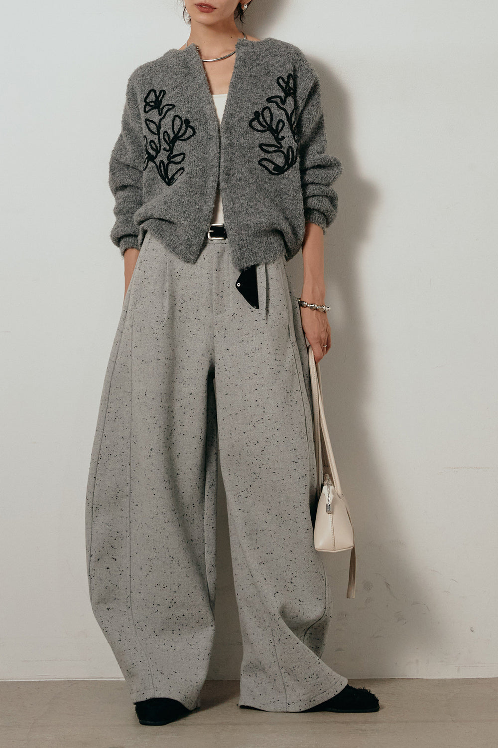 【即納】ベルト付きネップツイードカーブパンツ/グレー