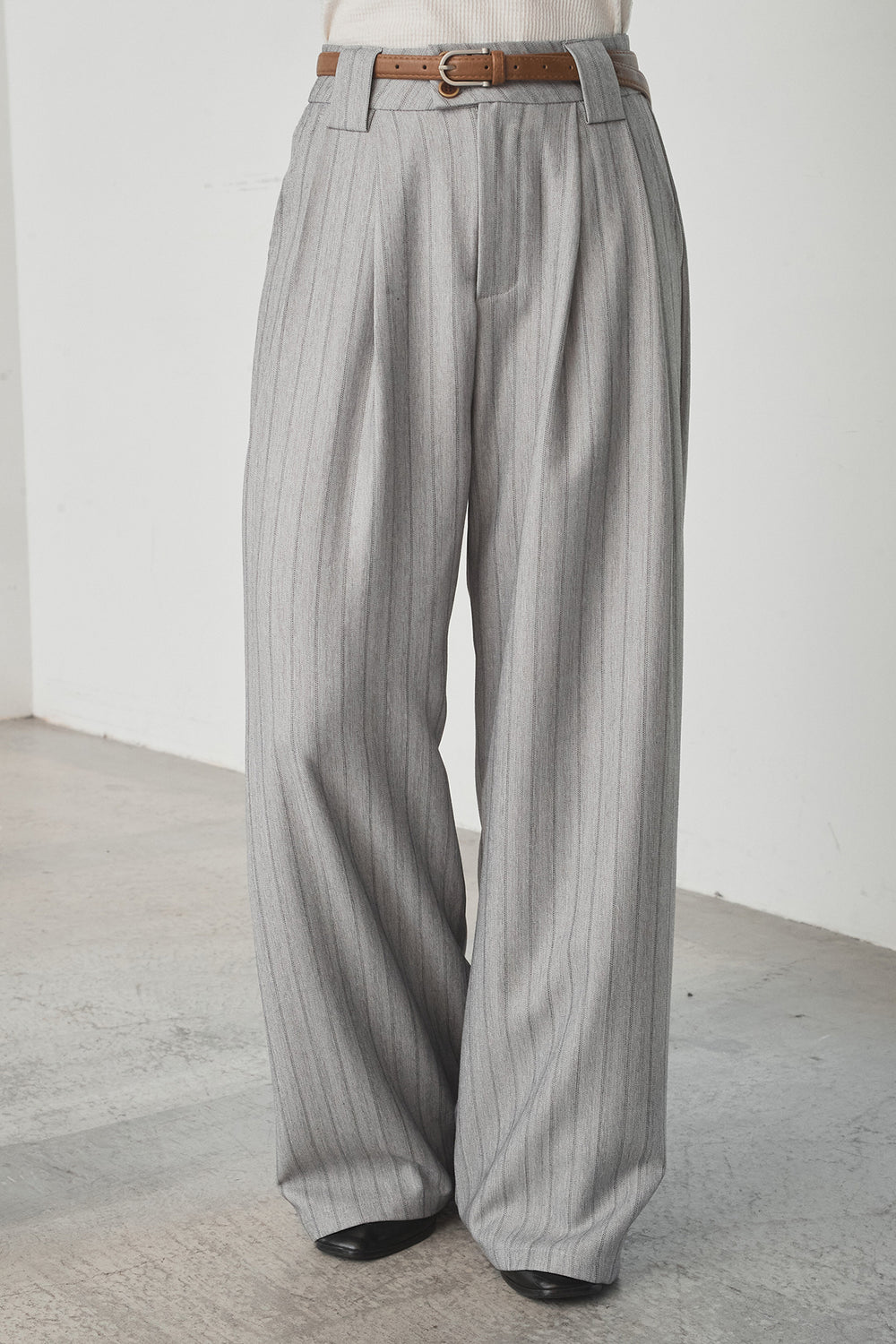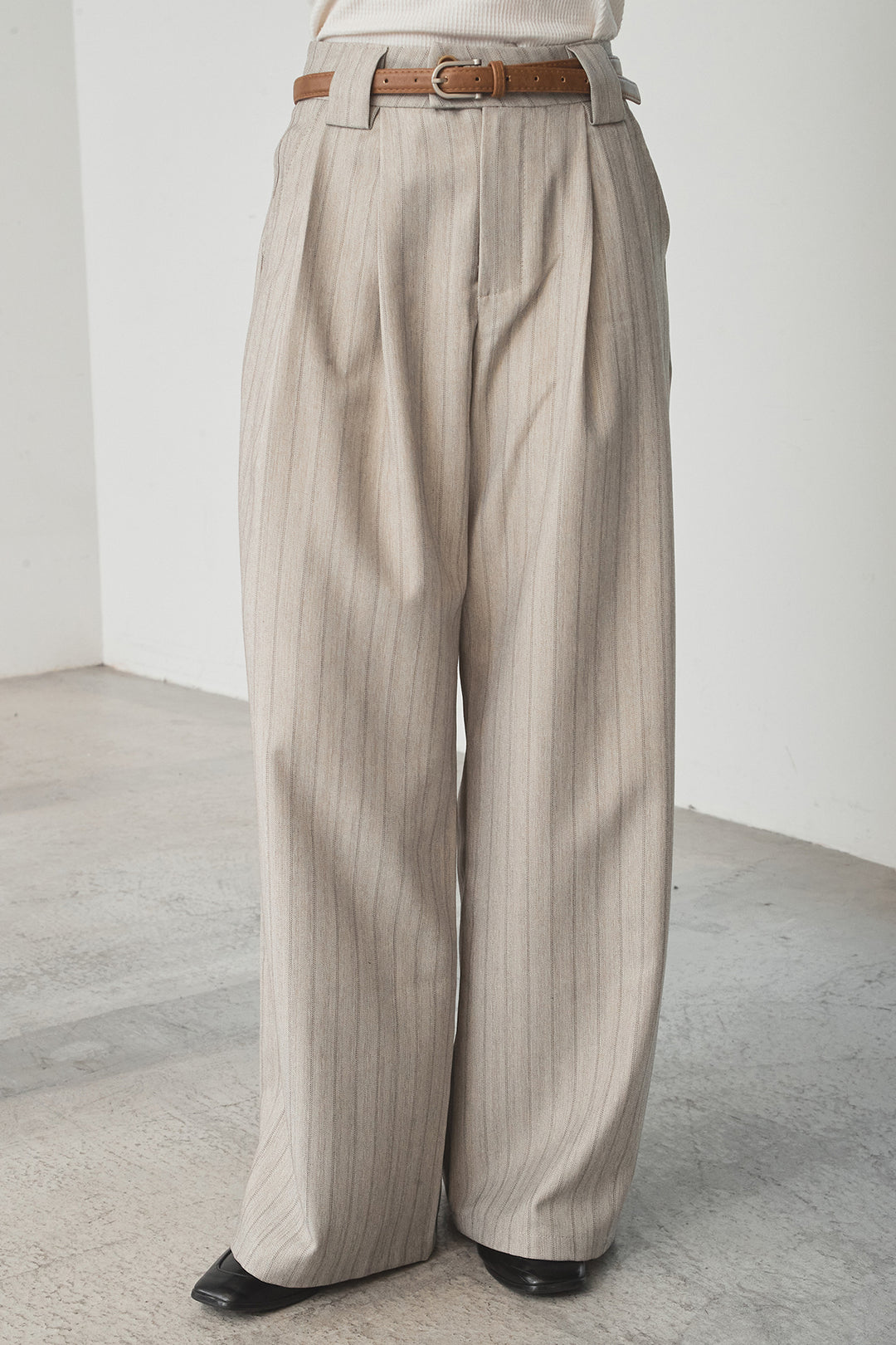 細ベルト付きピンストライプワイドパンツ