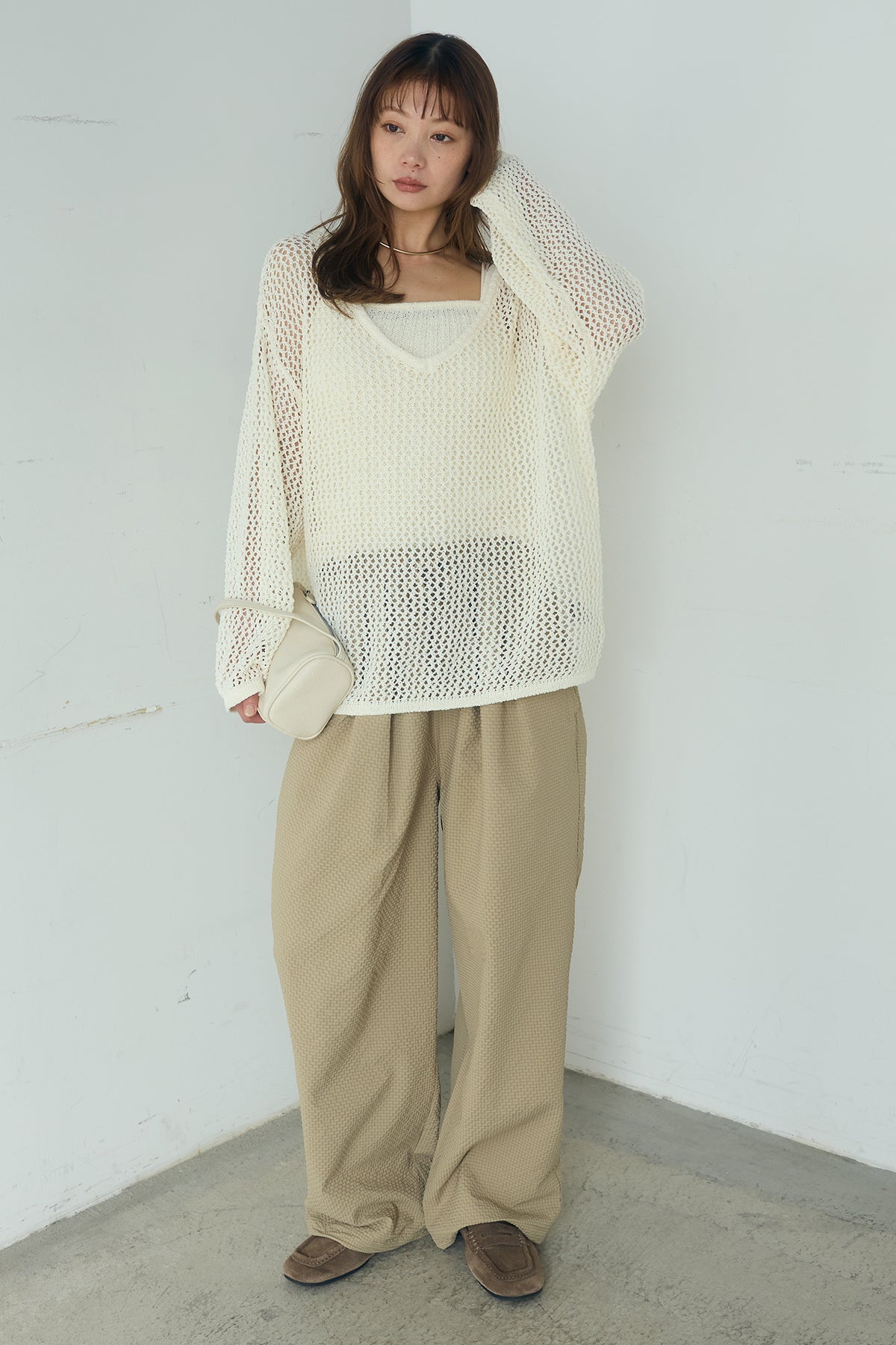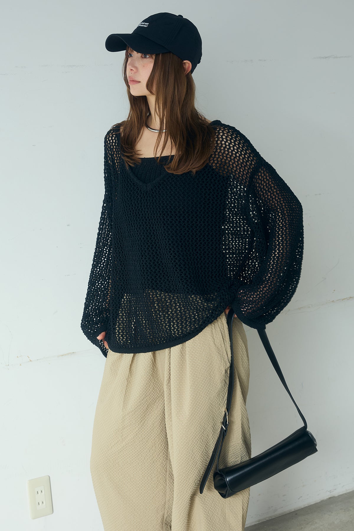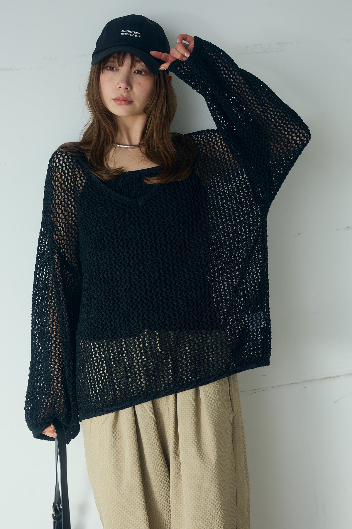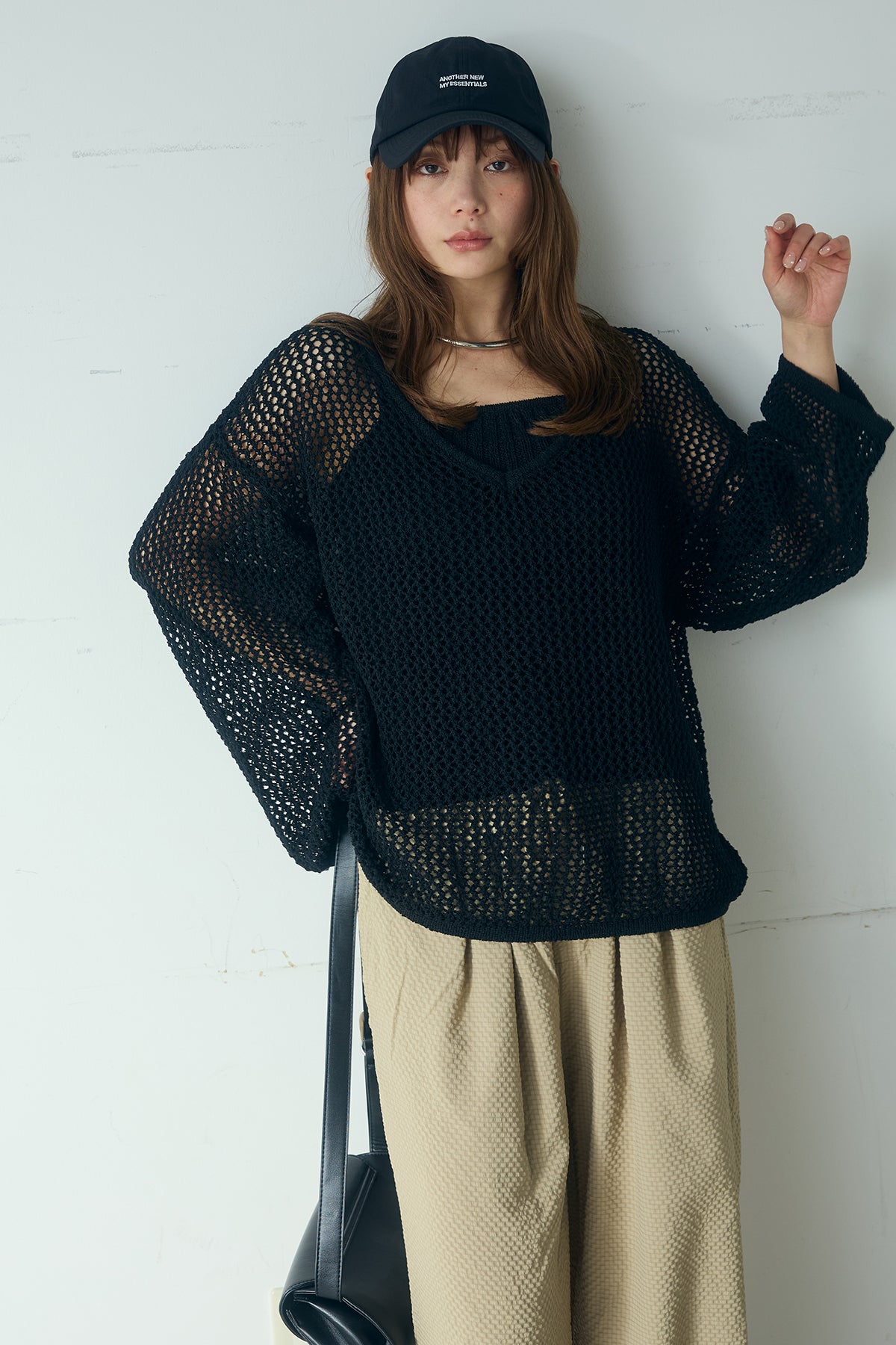 ナチュラルな透け感が魅力のメッシュニットプルオーバー。軽やかな編み地が涼しげな印象を与え、程よい抜け感のあるスタイリングを演出します。柔らかな風合いで、リラックス感のある着心地もポイントです。 ゆとりのあるシルエットと深めのVネックデザインが、顔まわりをすっきりとした印象に。インナーとのレイヤードを楽しめるデザインで、キャミソールやタンクトップと合わせることで、さまざまな表情のコーディネートが完成します。 パンツやスカートなど幅広いボトムスと相性が良く、カジュアルからナチュラルスタイルまで活躍。季節の変わり目にも取り入れやすく、デイリーコーデに抜け感をプラスしてくれる一着です。