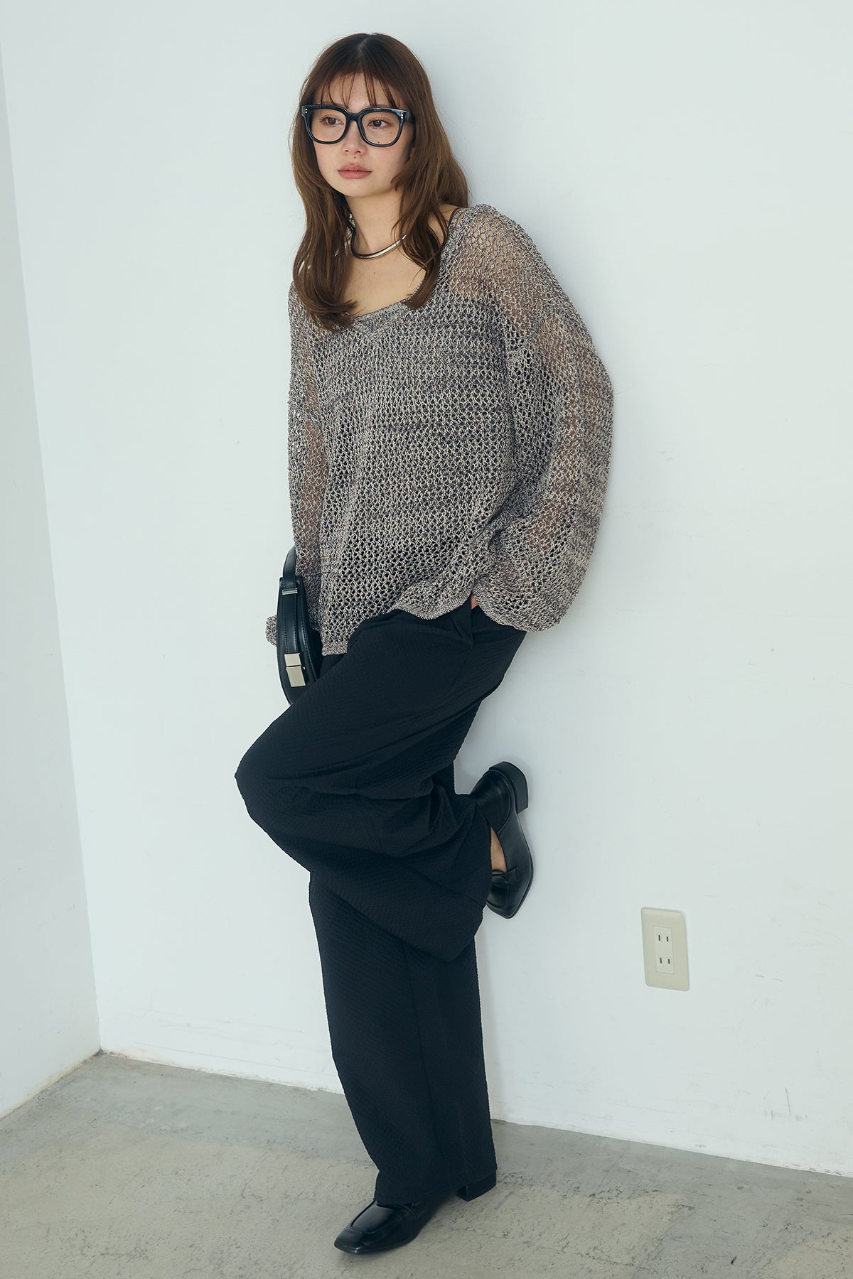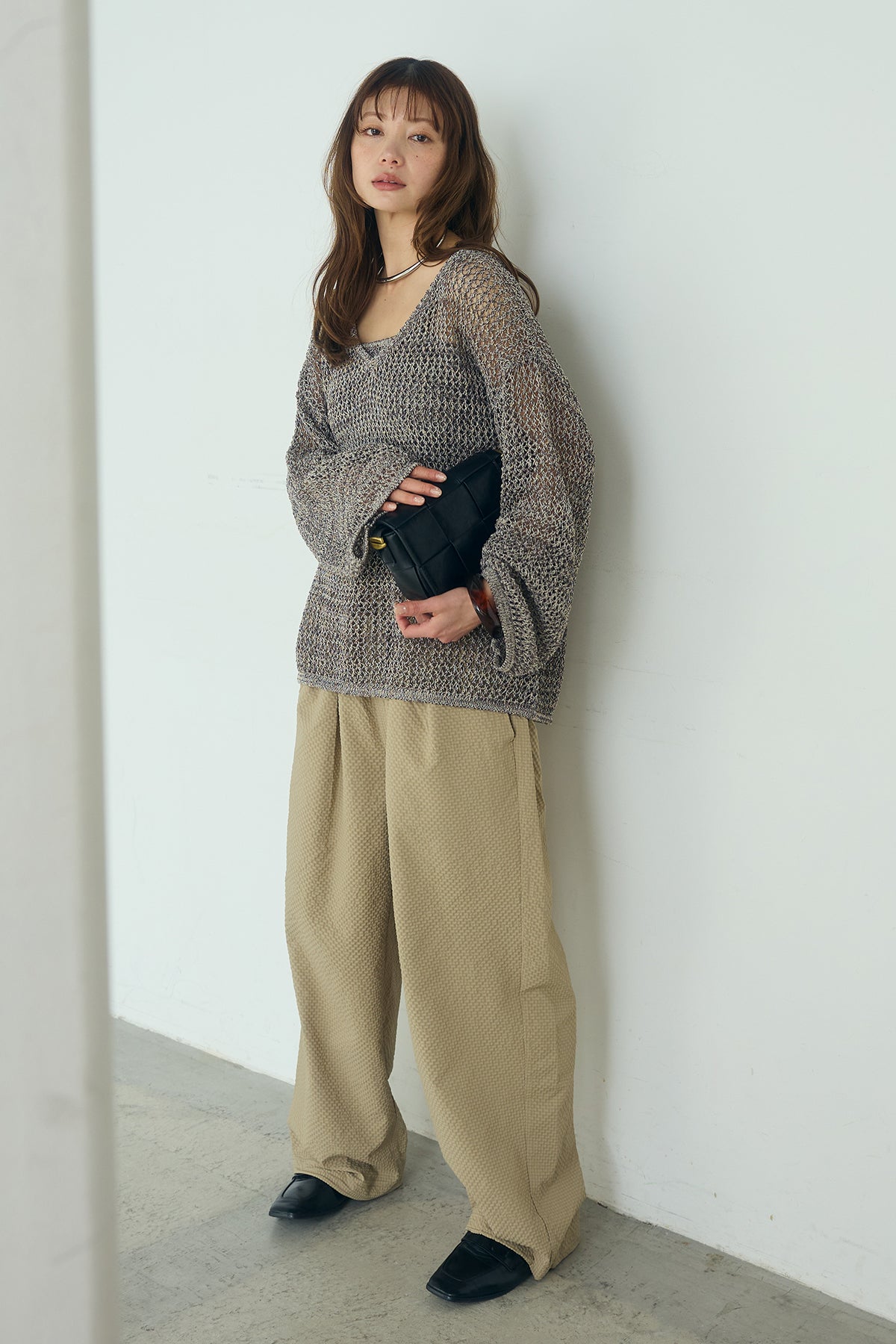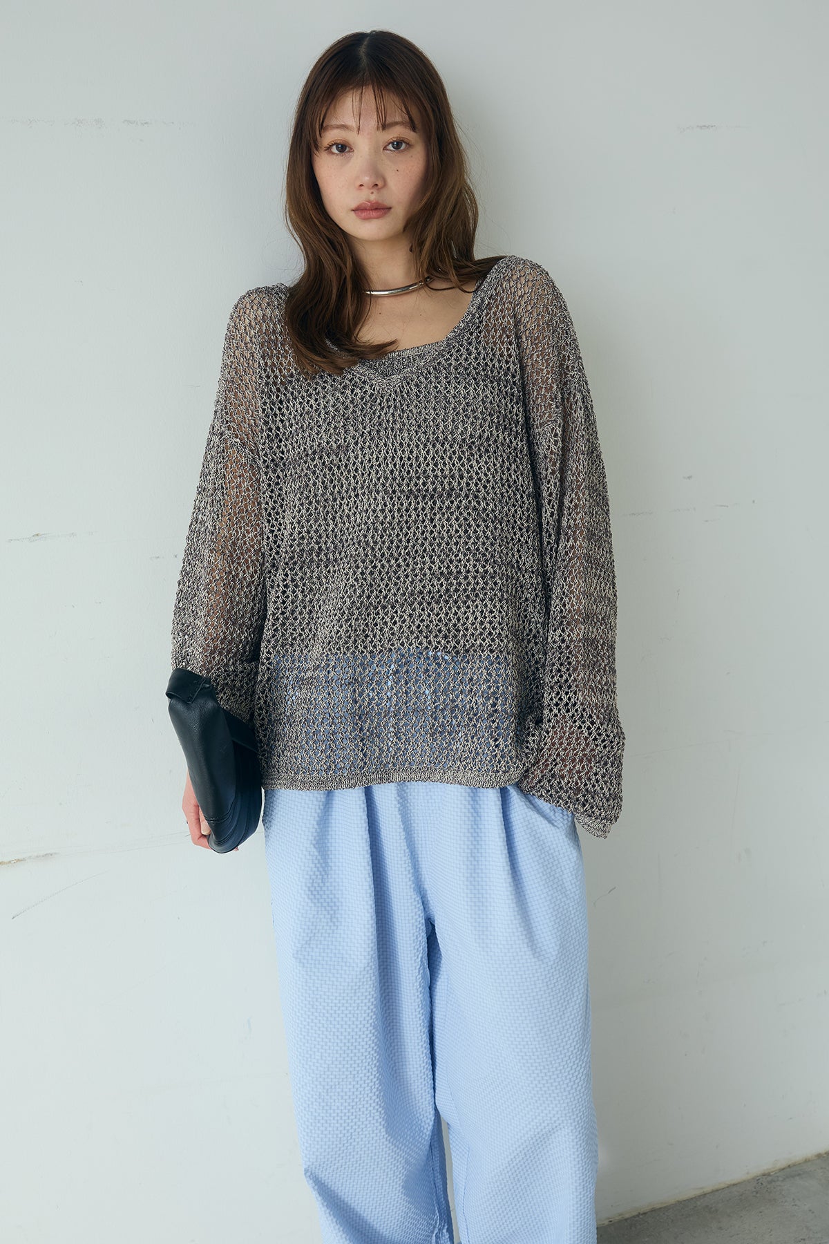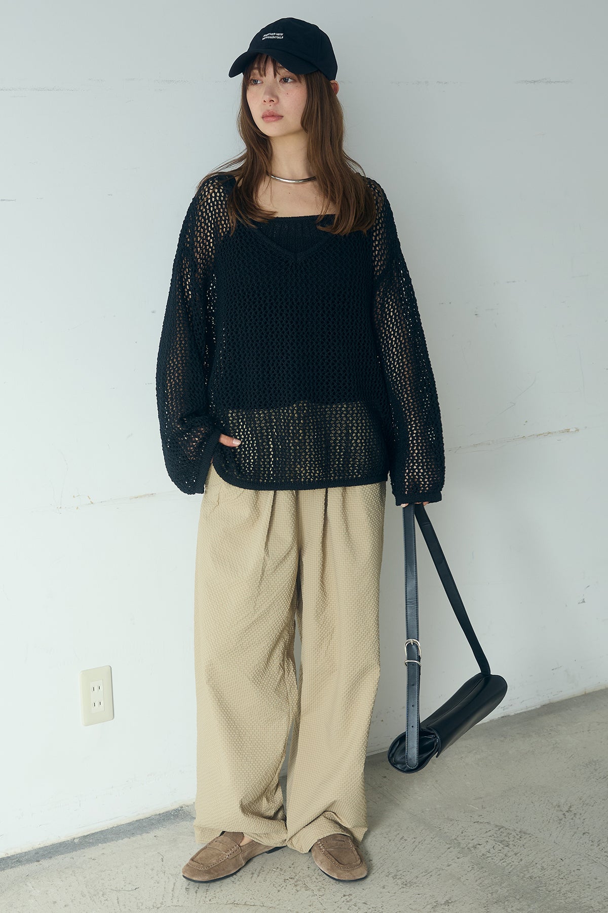 ナチュラルな透け感が魅力のメッシュニットプルオーバー。軽やかな編み地が涼しげな印象を与え、程よい抜け感のあるスタイリングを演出します。柔らかな風合いで、リラックス感のある着心地もポイントです。 ゆとりのあるシルエットと深めのVネックデザインが、顔まわりをすっきりとした印象に。インナーとのレイヤードを楽しめるデザインで、キャミソールやタンクトップと合わせることで、さまざまな表情のコーディネートが完成します。 パンツやスカートなど幅広いボトムスと相性が良く、カジュアルからナチュラルスタイルまで活躍。季節の変わり目にも取り入れやすく、デイリーコーデに抜け感をプラスしてくれる一着です。