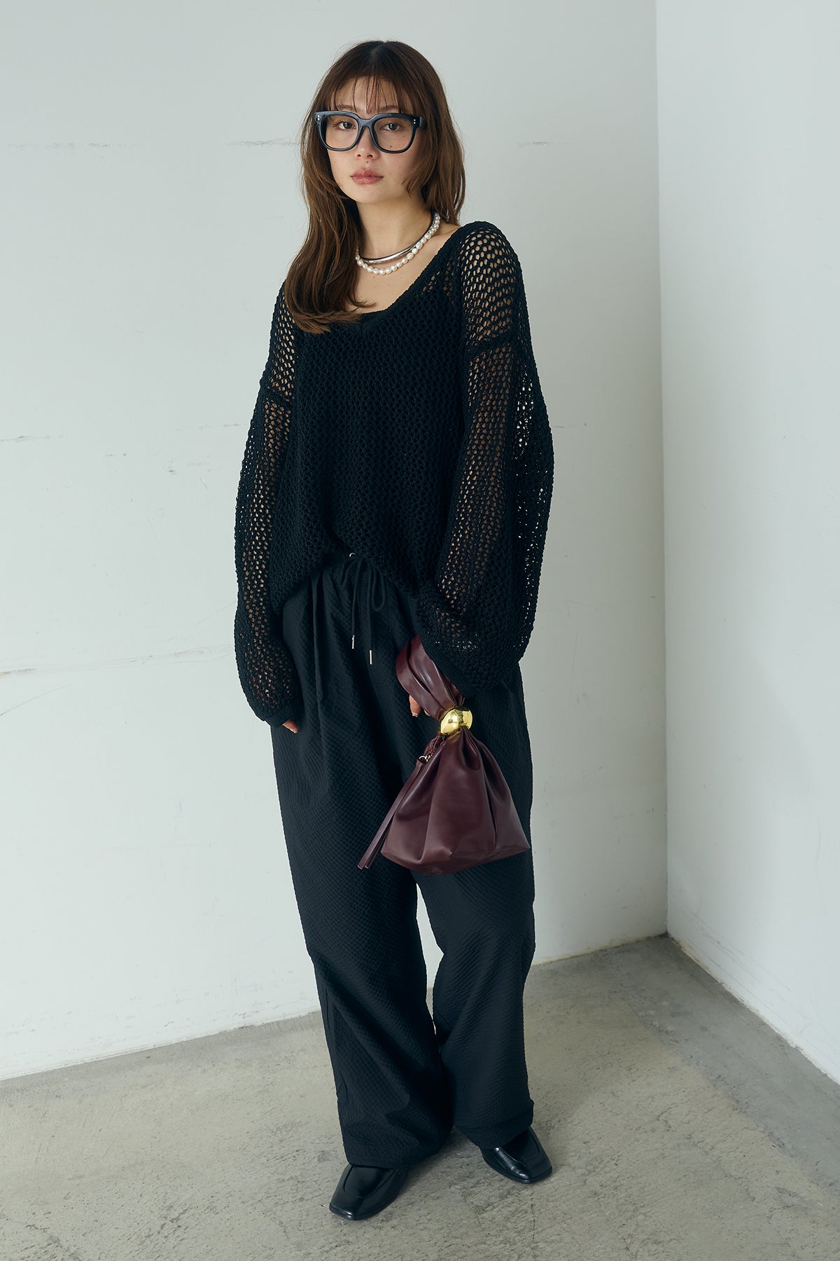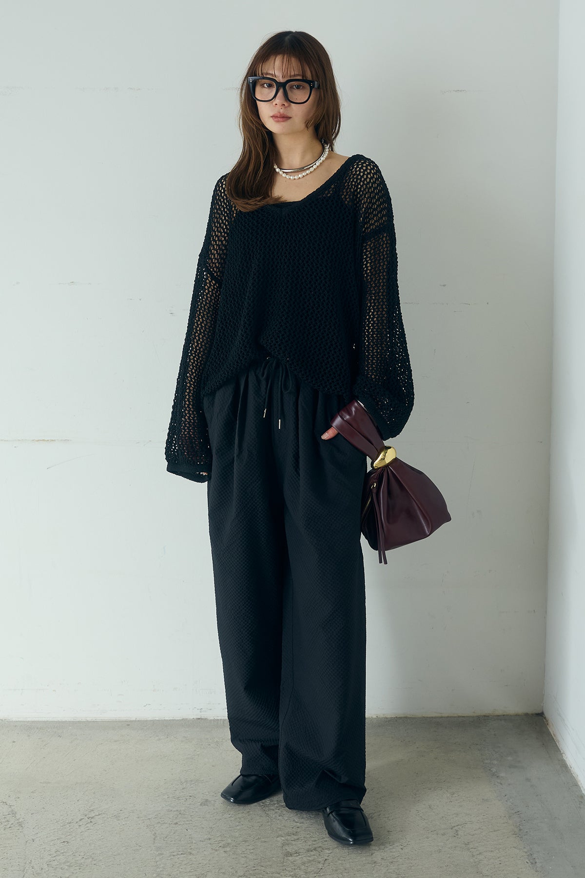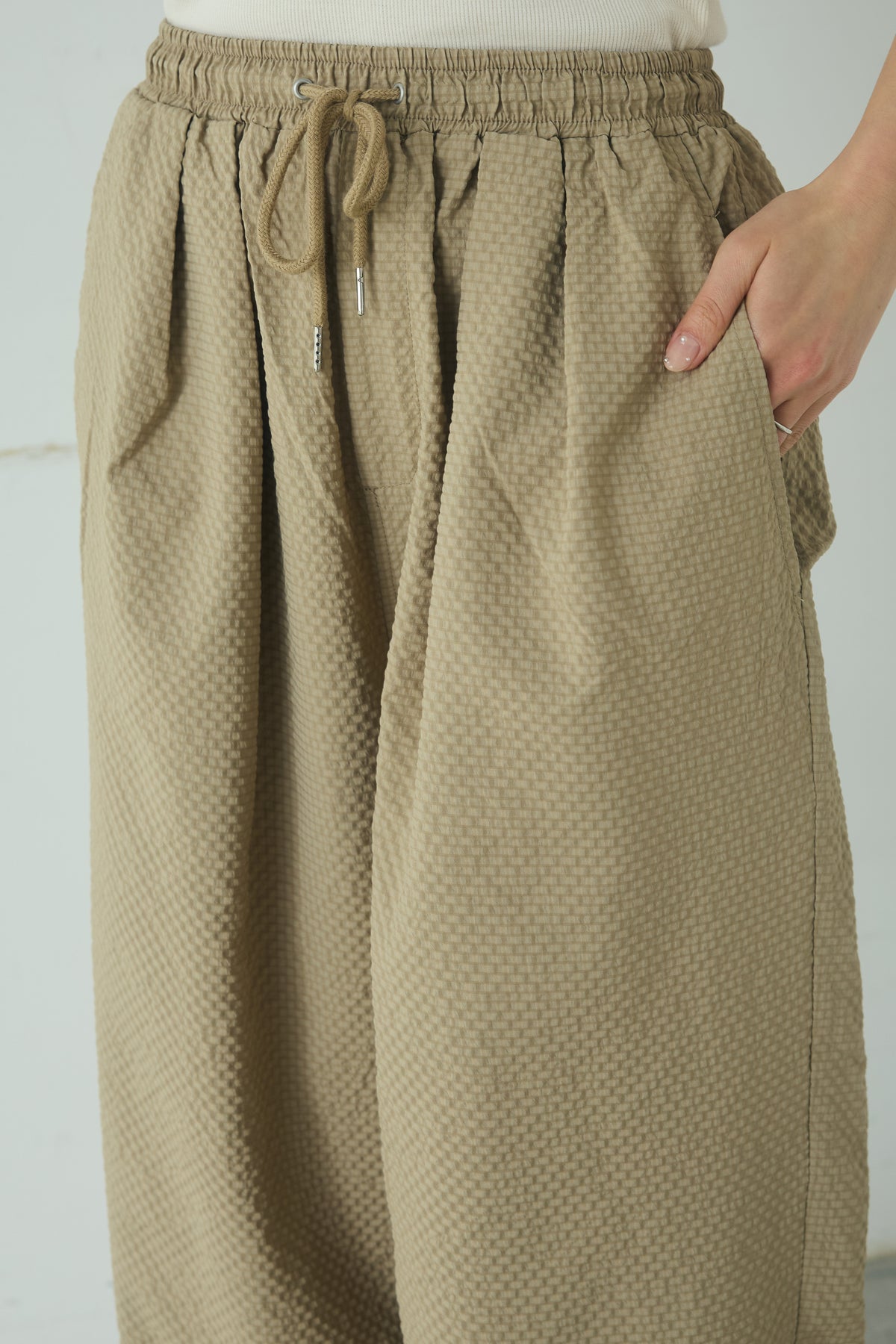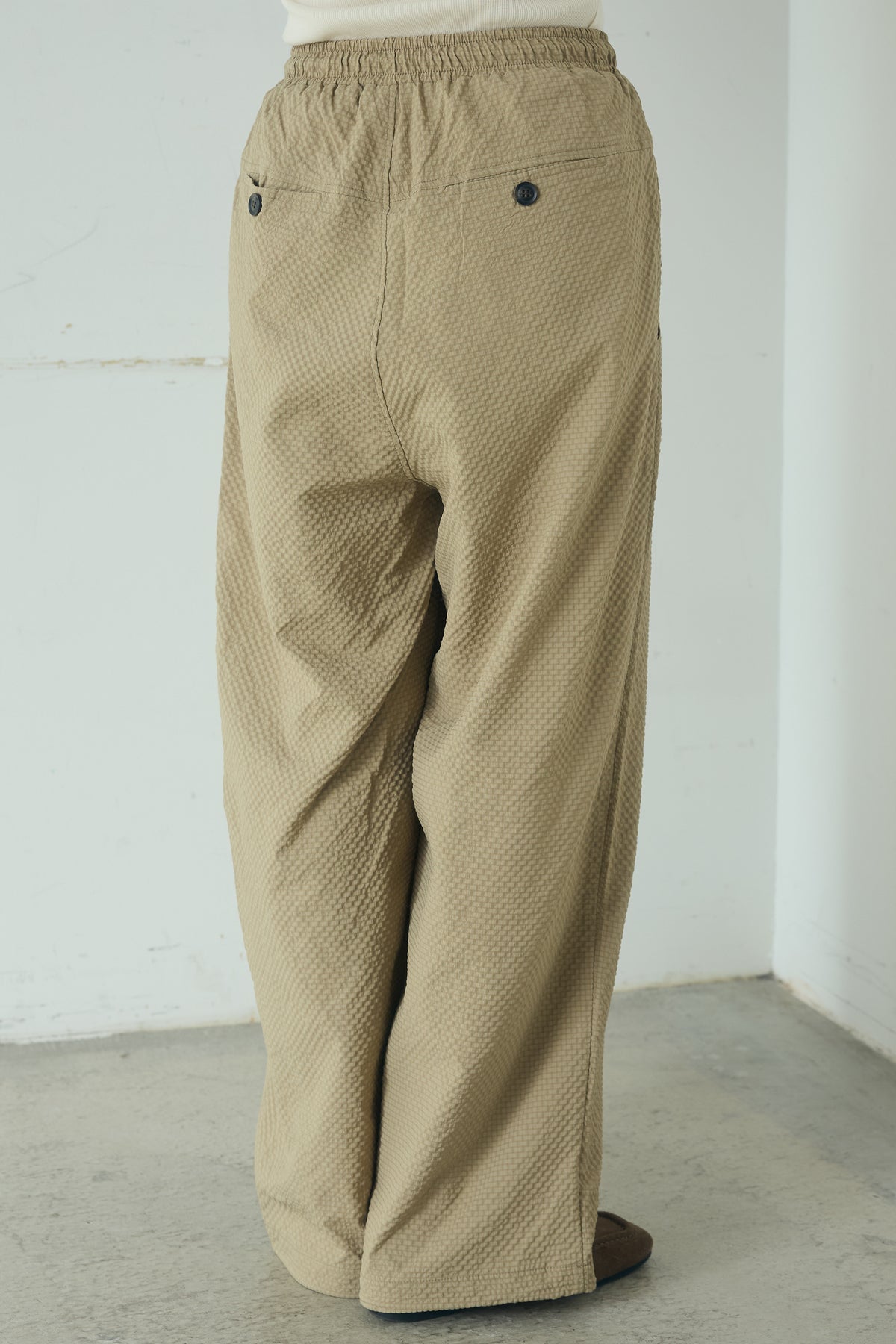 表面に細やかな表情がある、立体的なワッフル調のワイドパンツ。 肌離れの良い柔らかな風合いと、美しい落ち感が特徴で、カジュアルになりすぎず上品な印象を与えます。 ウエストは総ゴム仕様でストレスフリーな穿き心地を叶えながら、共生地のドローストリングがアクセントに。フロントに入ったタックが腰回りに程よいゆとりを生み出し、気になるラインを自然にカバーします。すとんと落ちるセミワイドなストレートシルエットで、脚長効果も期待できる一着です。