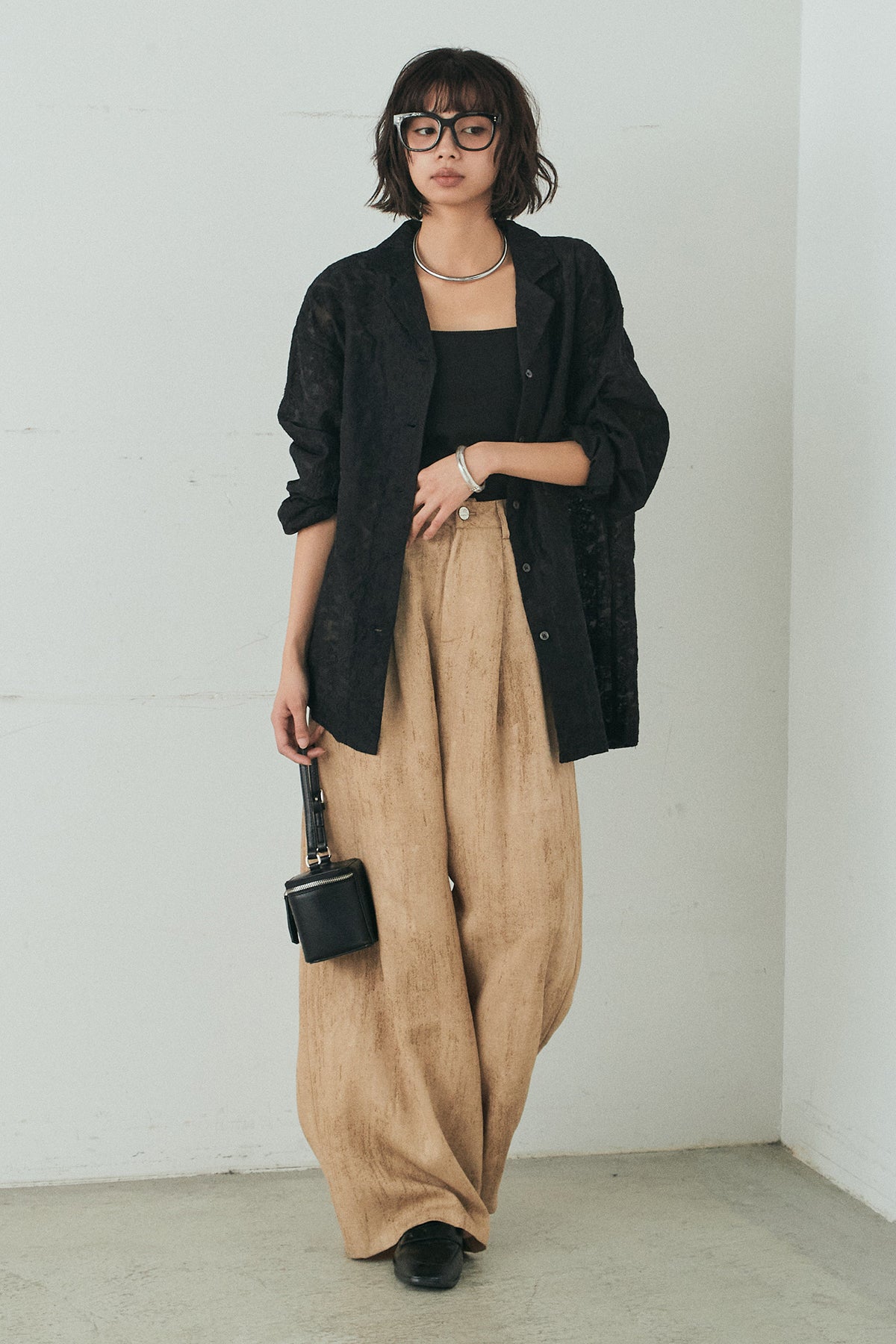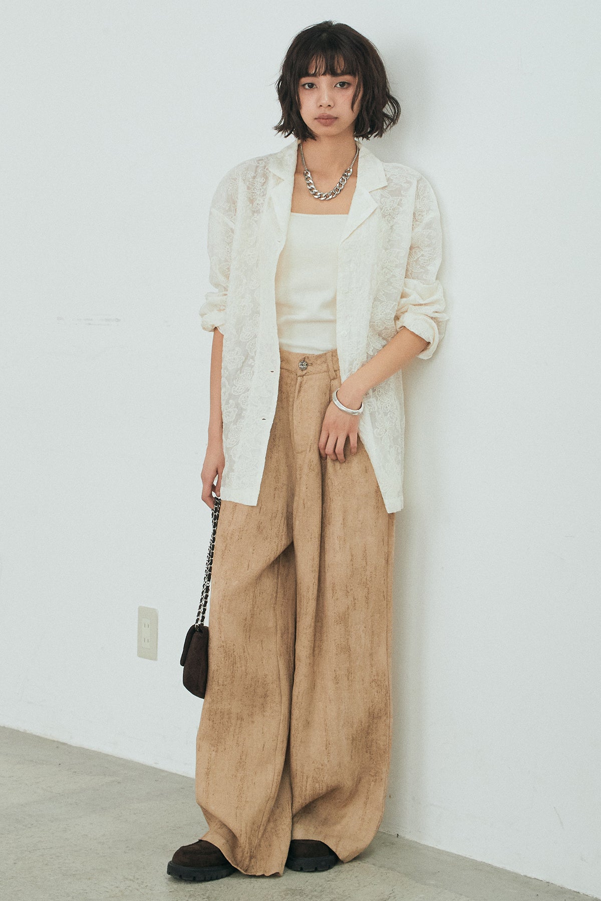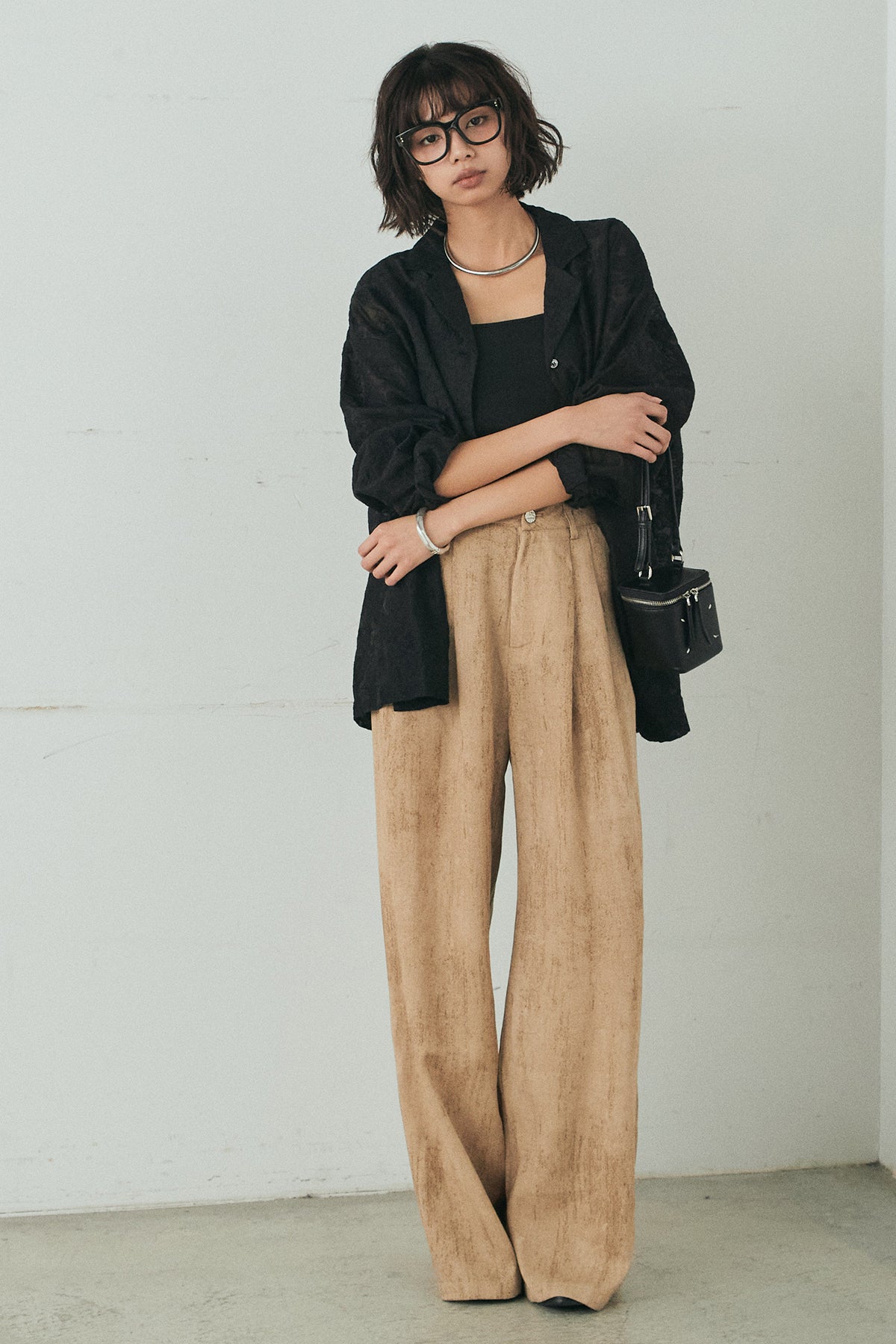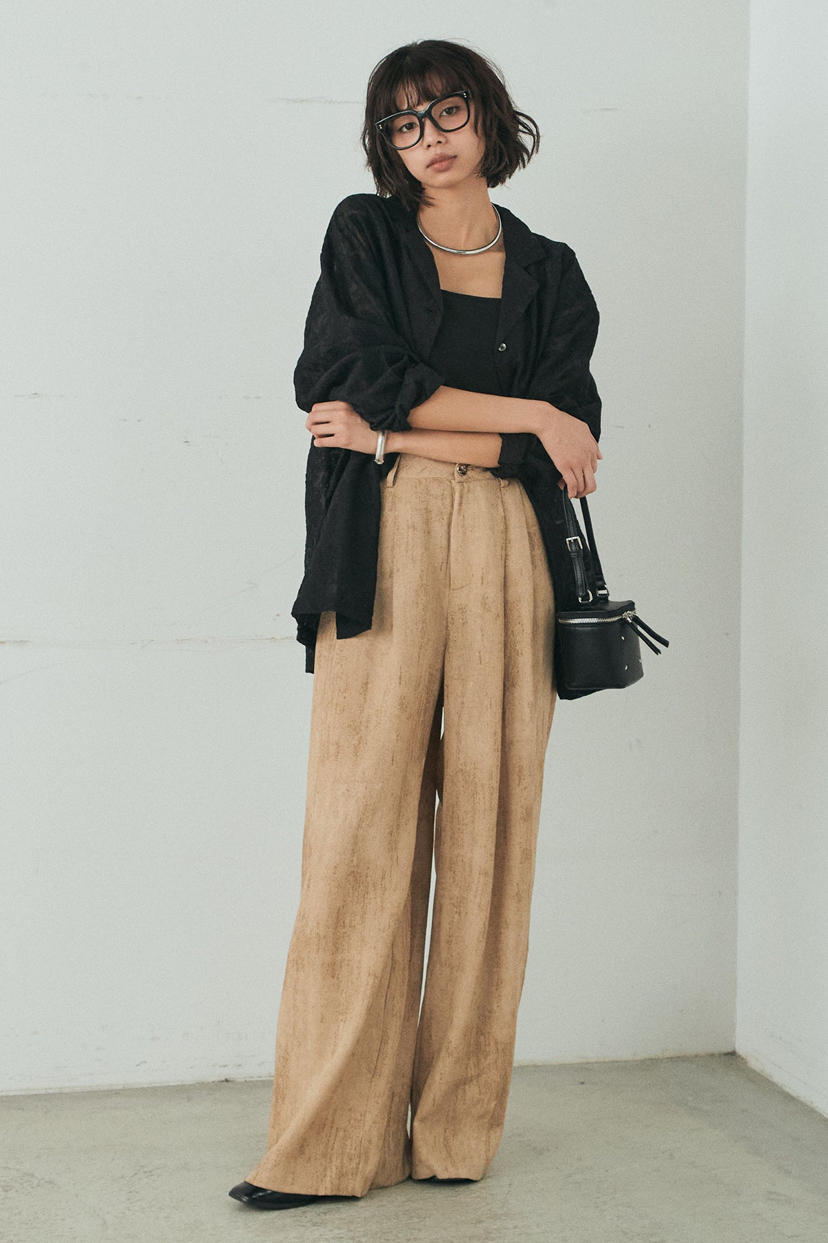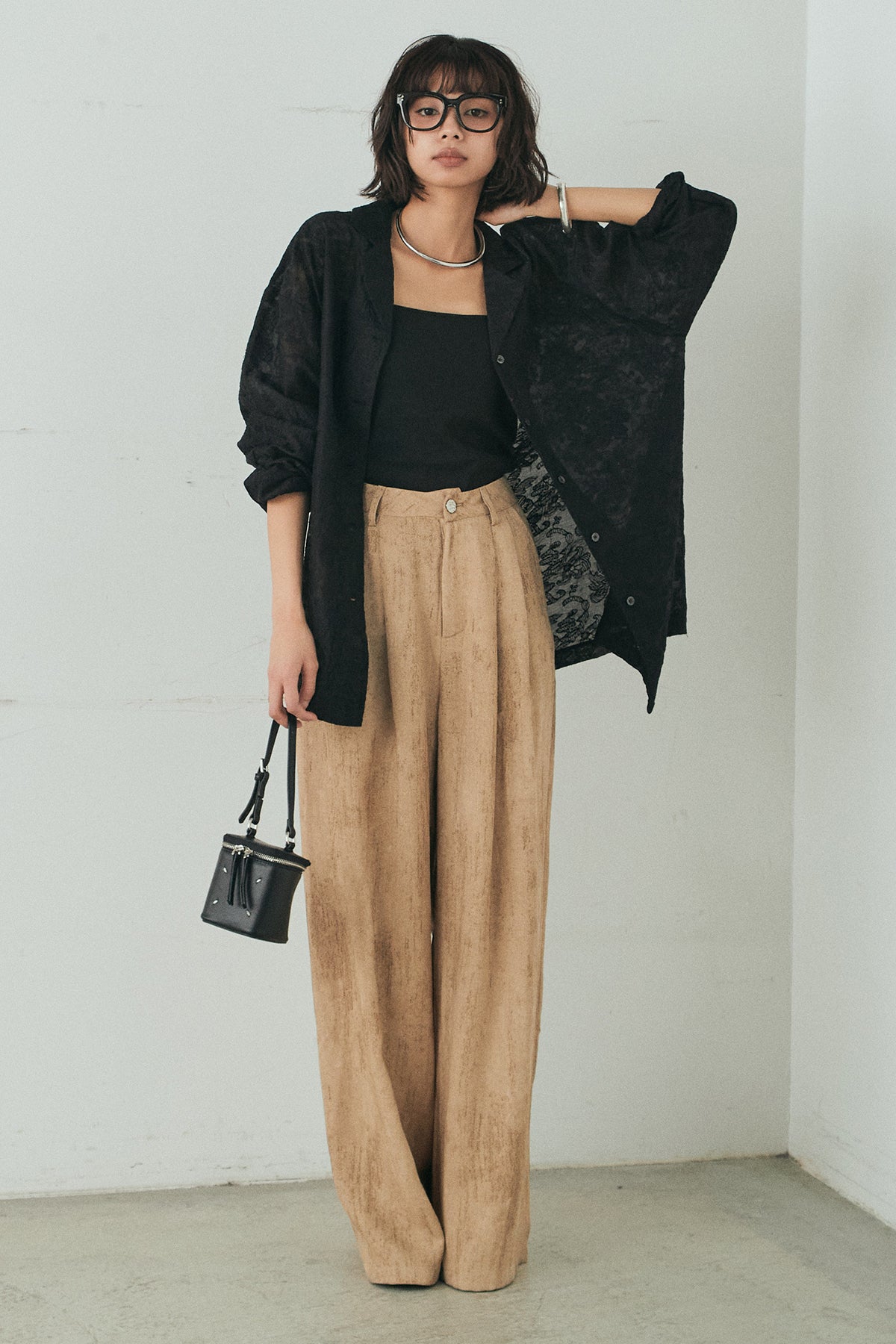 [SET]刺繍シアーオープンカラーシャツ+リネン混かすれ柄ワイドパンツ(2set)