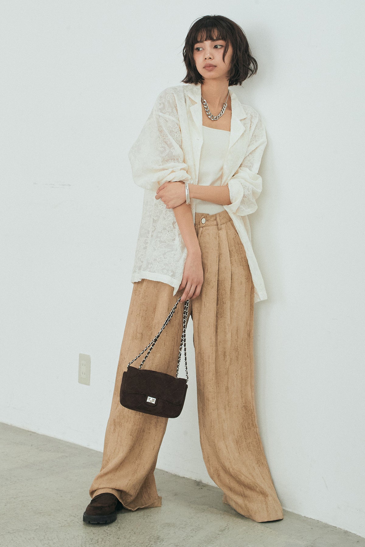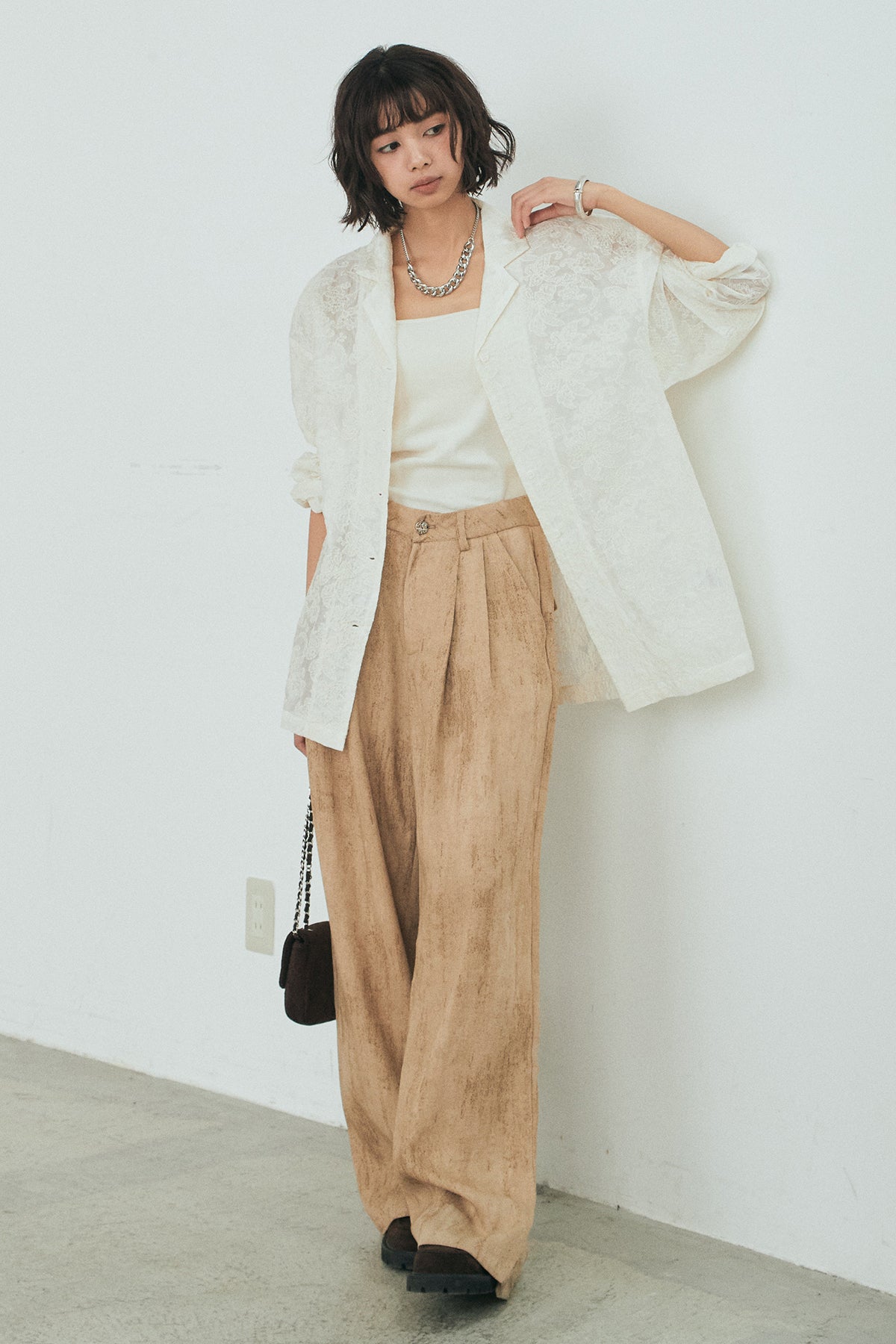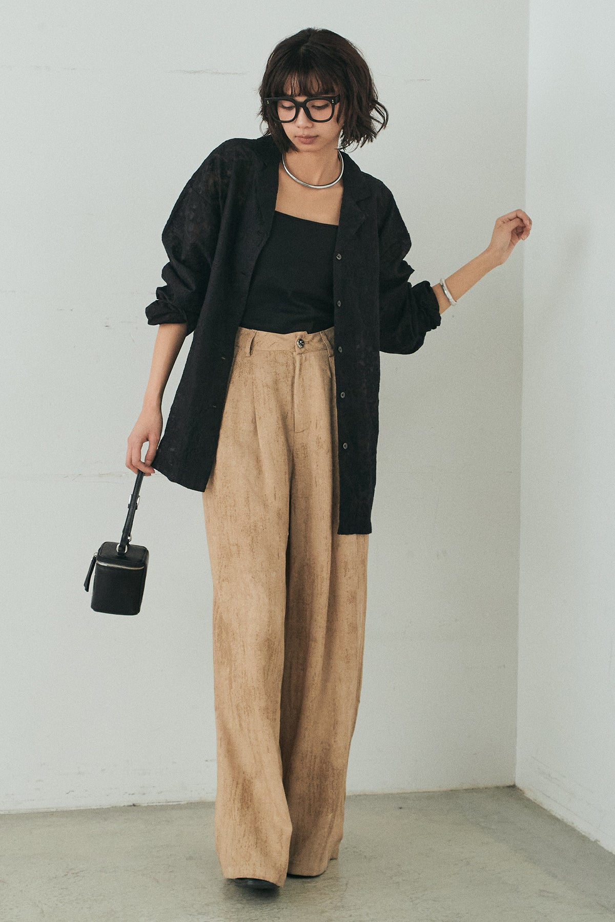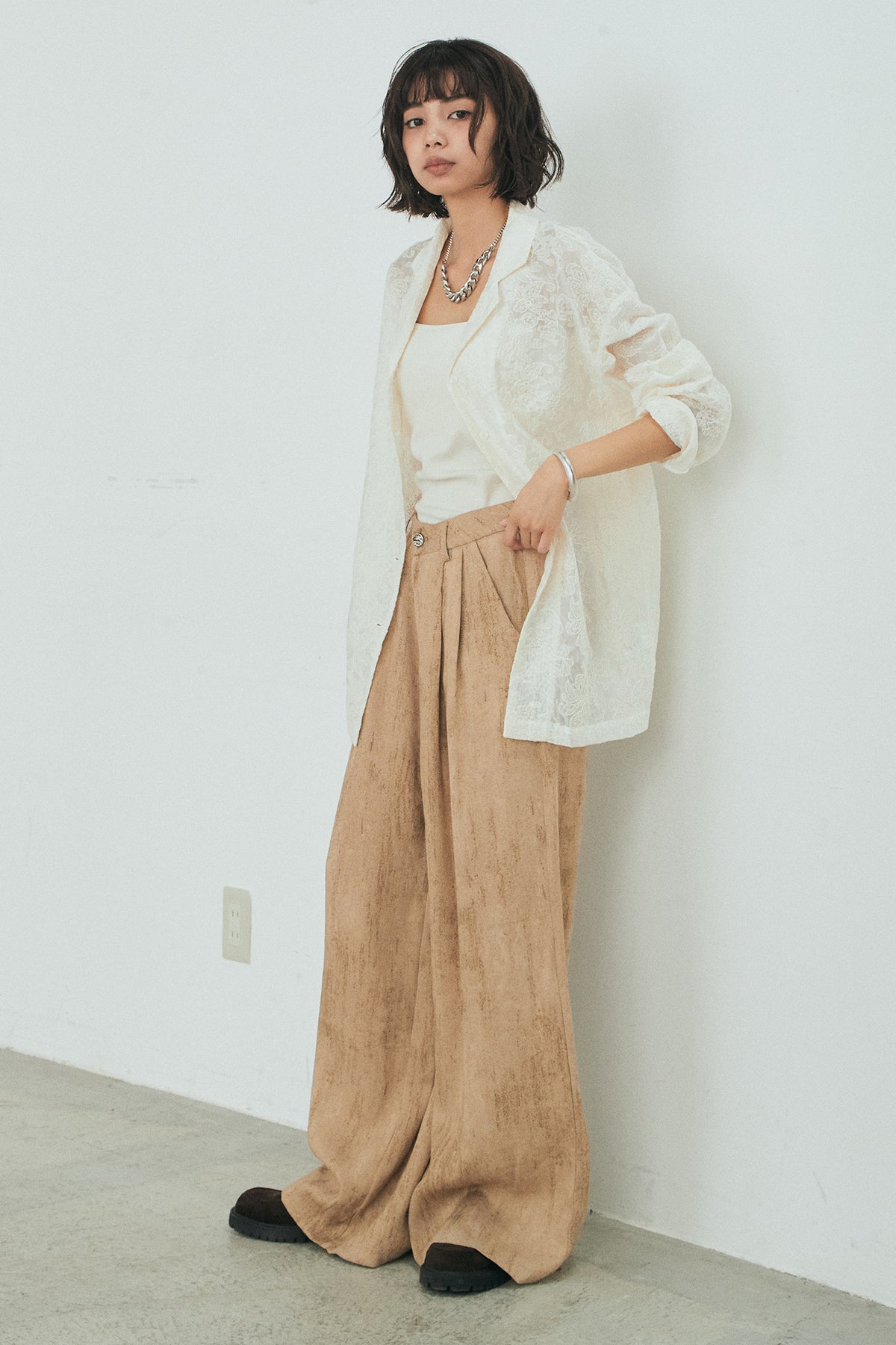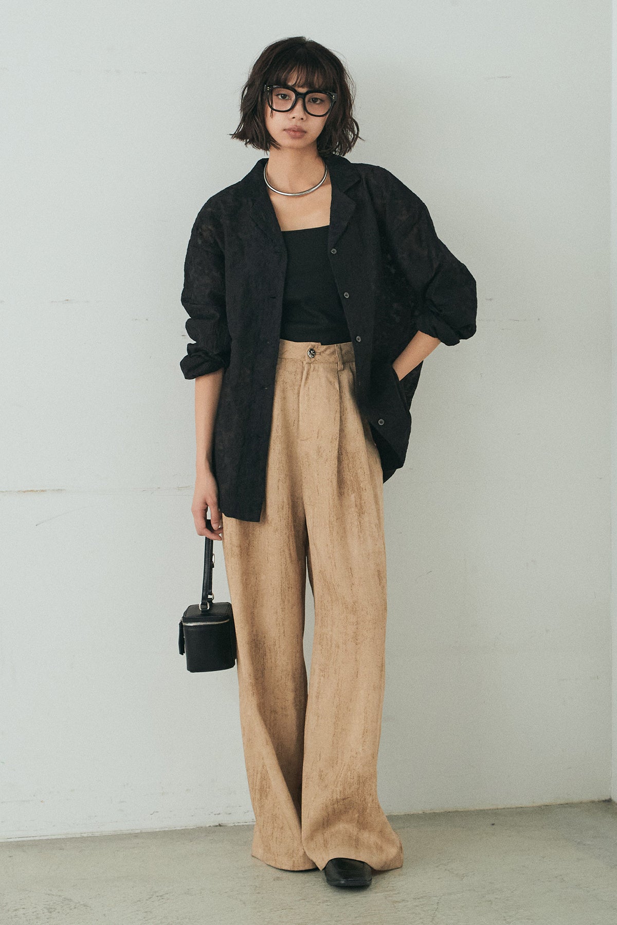[SET]刺繍シアーオープンカラーシャツ+リネン混かすれ柄ワイドパンツ(2set)
