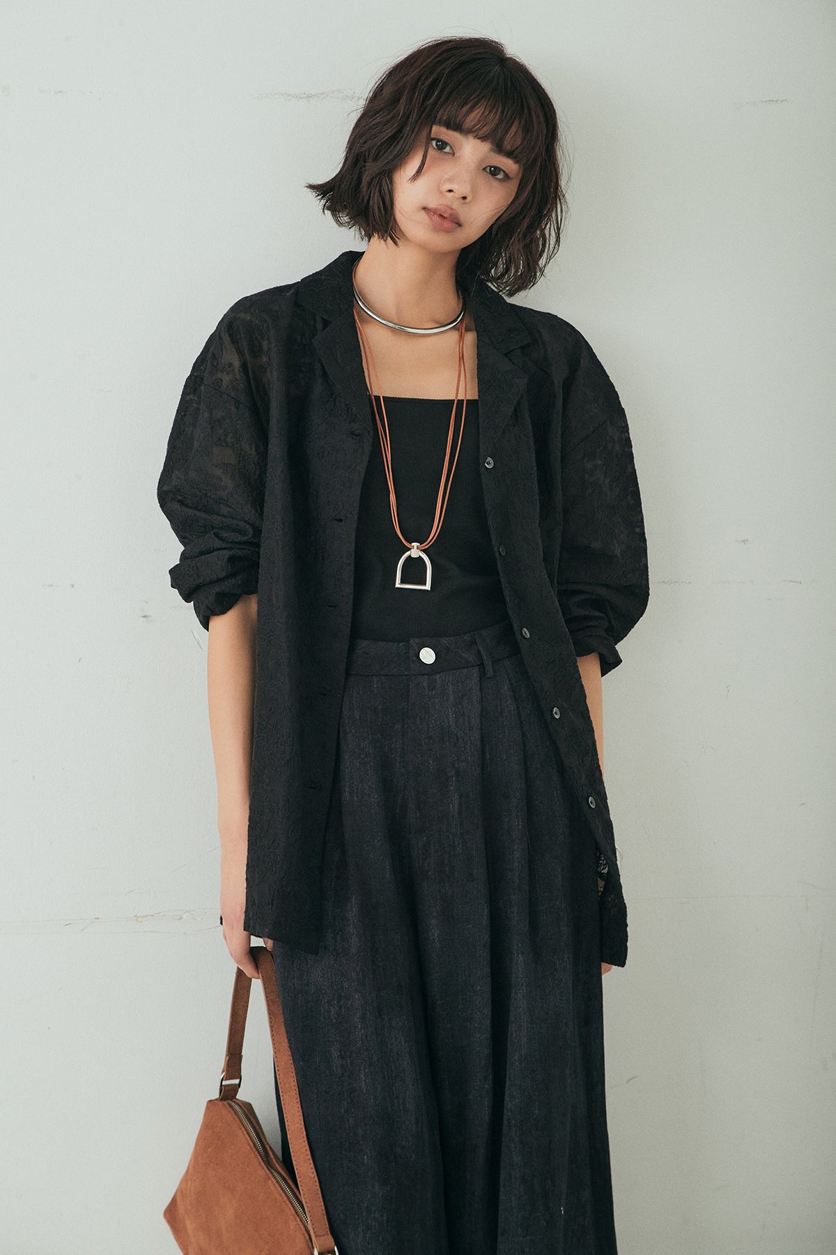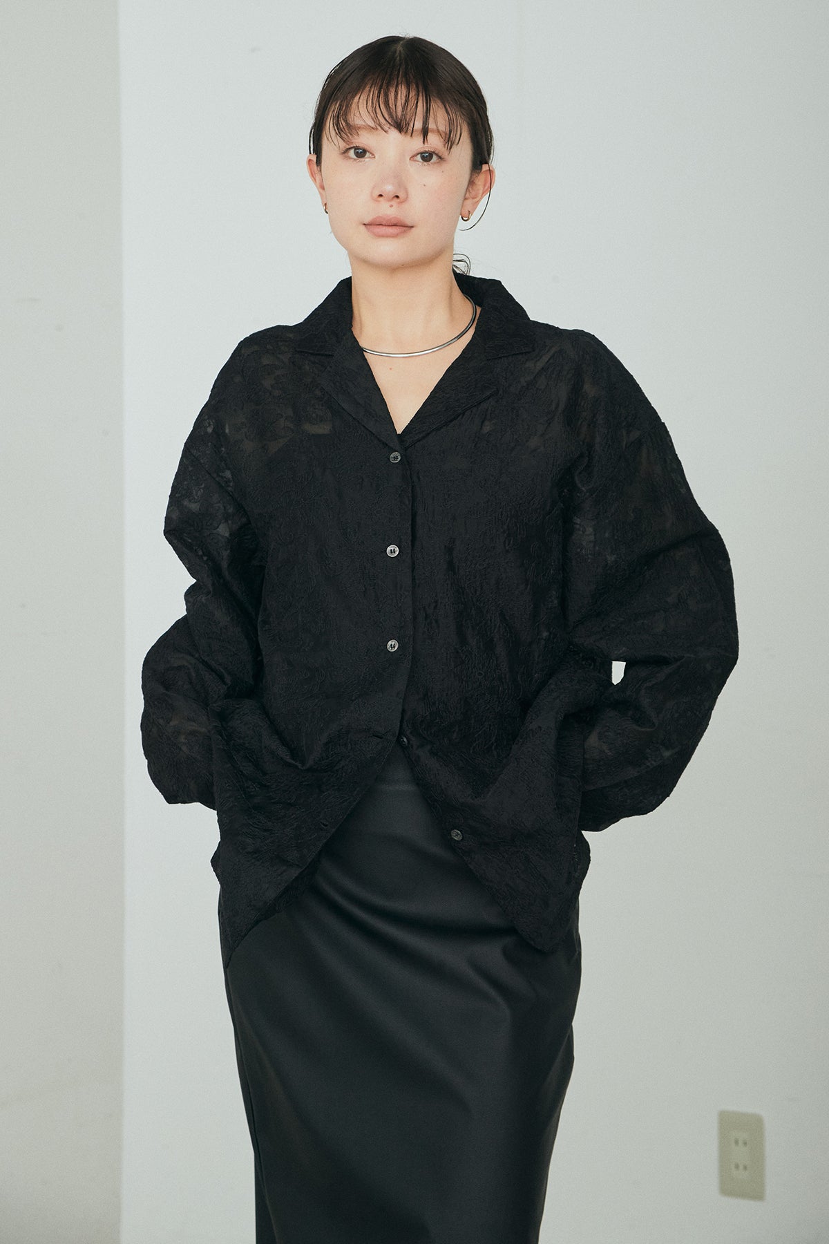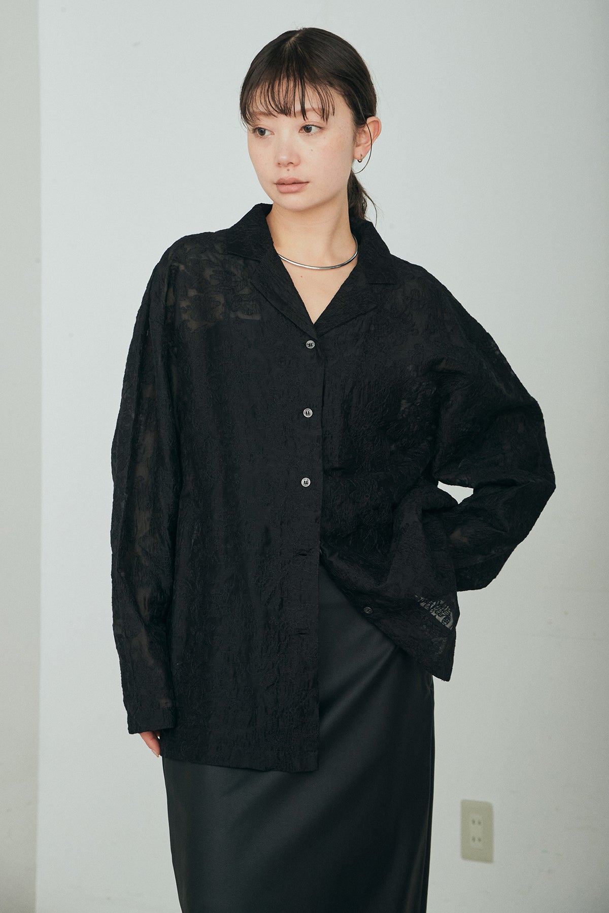 繊細な刺繍をあしらったシアー素材が印象的なオープンカラーシャツ。ほんのり透け感のある軽やかな風合いが、スタイリングに抜け感を添えます。ゆとりのあるシルエットでさらりと羽織りやすく、ボタンを閉じてトップスとしても活躍。インナーとのレイヤード次第で表情が変わり、幅広い着こなしを楽しめます。デイリーからきれいめなスタイルまで馴染む一着です。