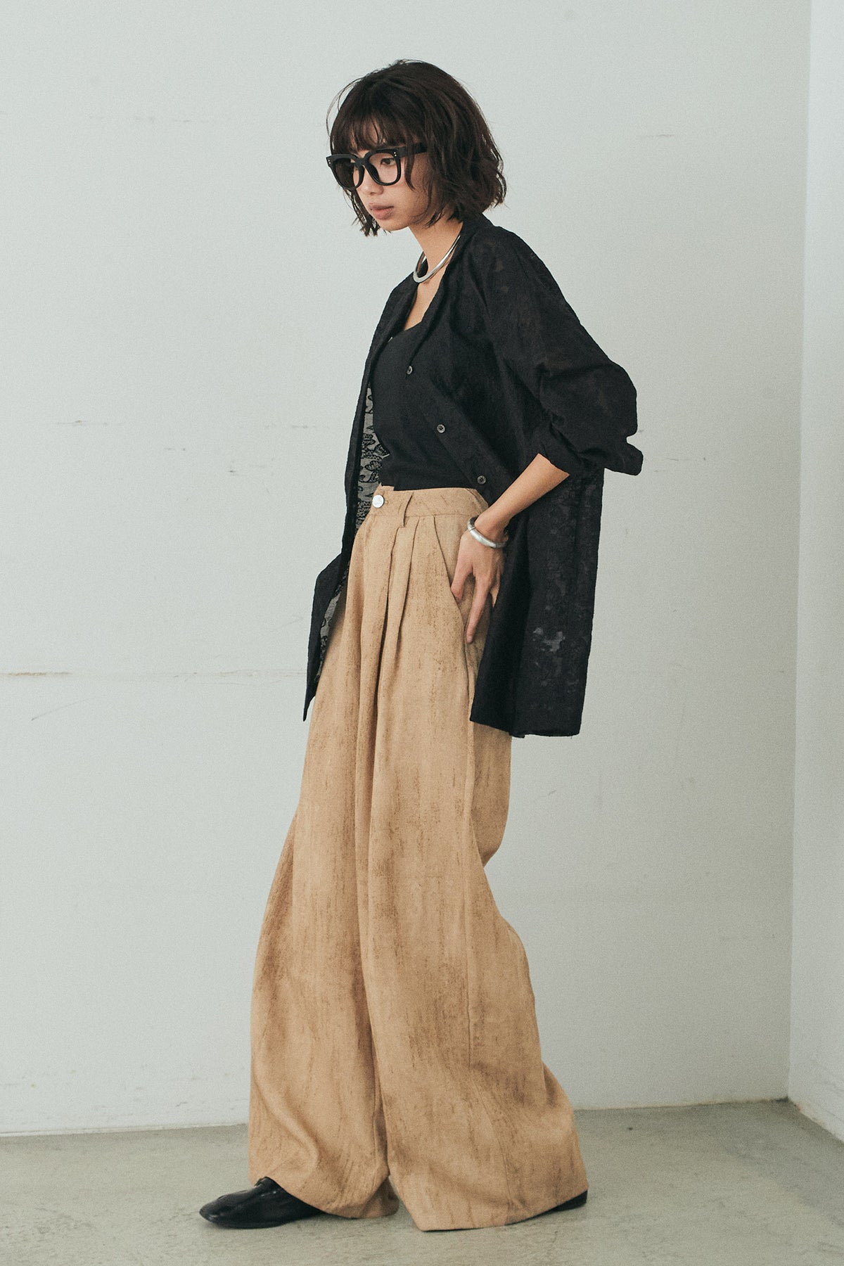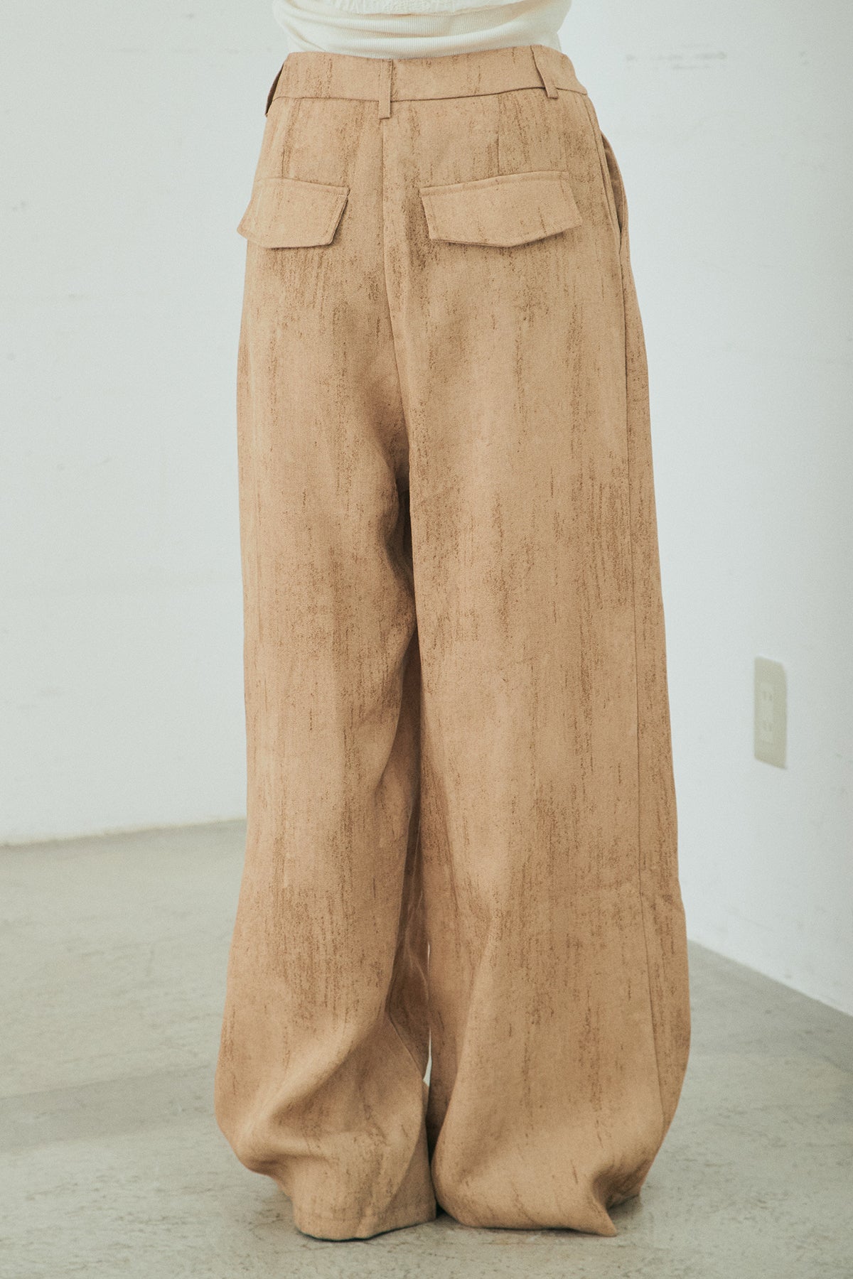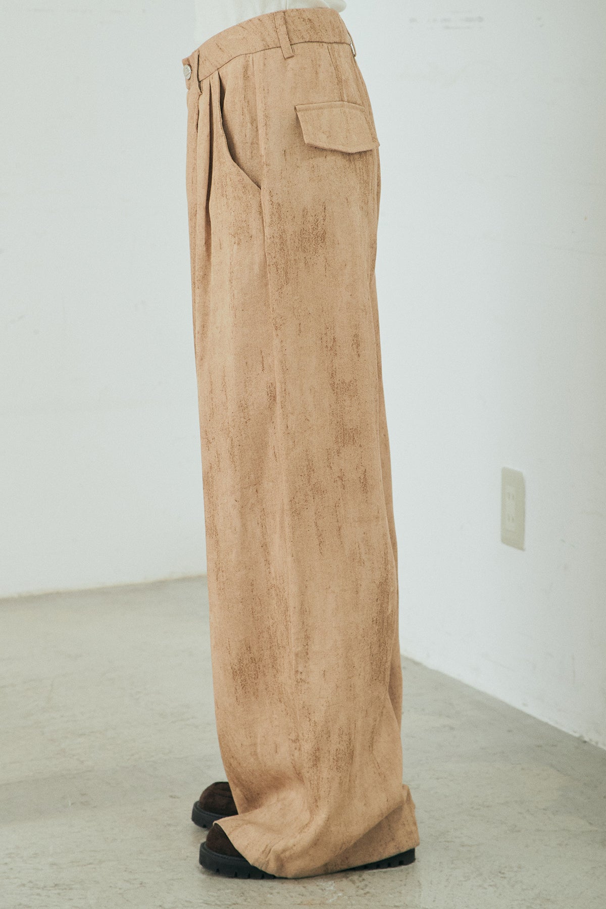 リネン混のナチュラルな風合いと、かすれた柄が印象的なワイドパンツ。ほどよいハリと落ち感があり、裾まで美しく広がるシルエットが存在感を引き立てます。フロントのタックが立体感を生み、ウエストまわりをすっきりとした印象に。シンプルなトップスと合わせるだけで、奥行きのあるスタイルが完成します。デイリーにも取り入れやすく、コーディネートの主役になる一本です。