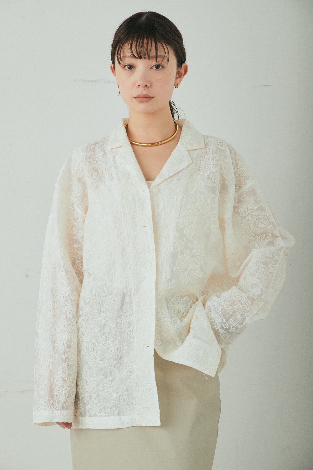 刺繍シアーオープンカラーシャツ