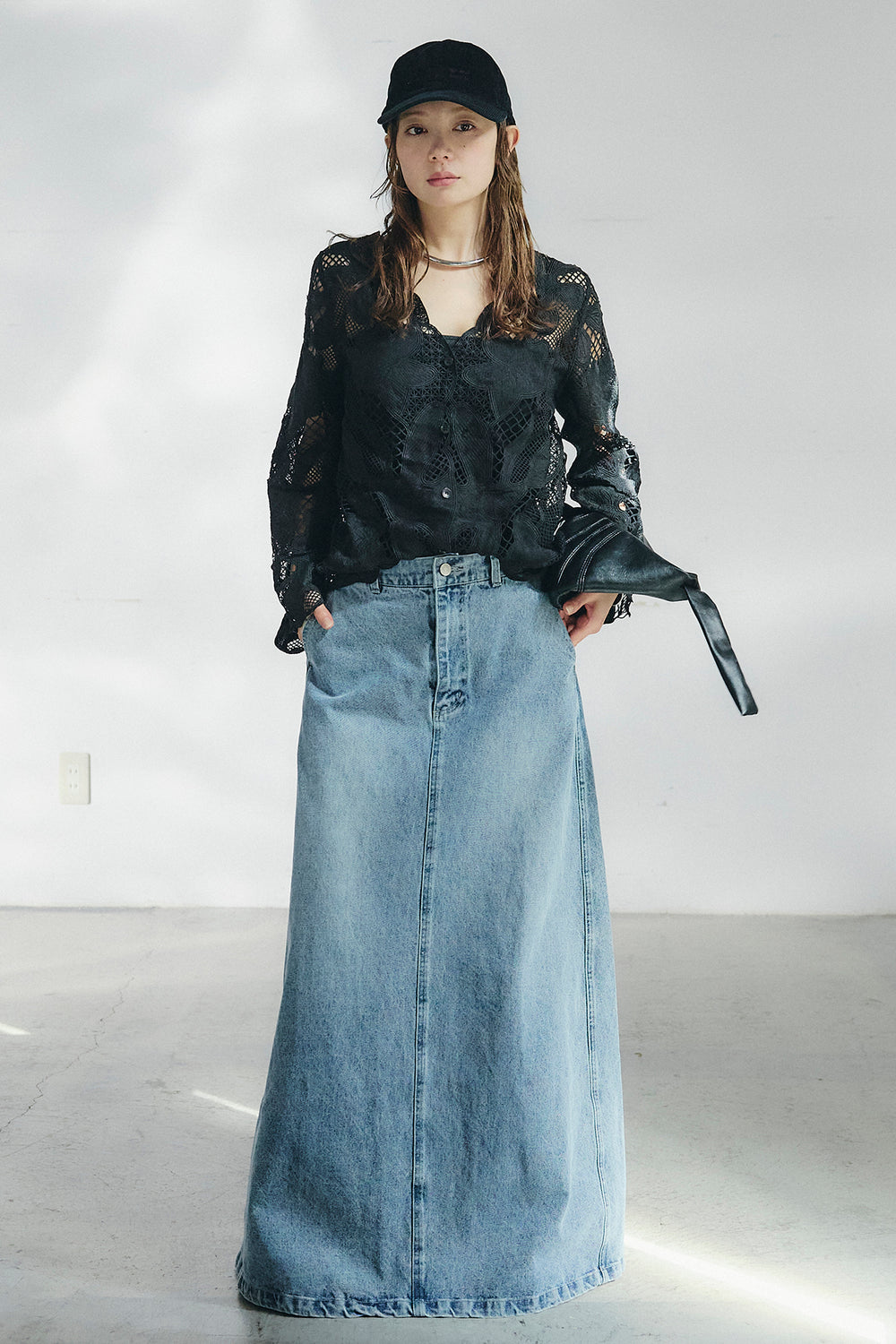 [SET]フラワー刺繍レースブラウス+デニムロングフレアスカート(2set)