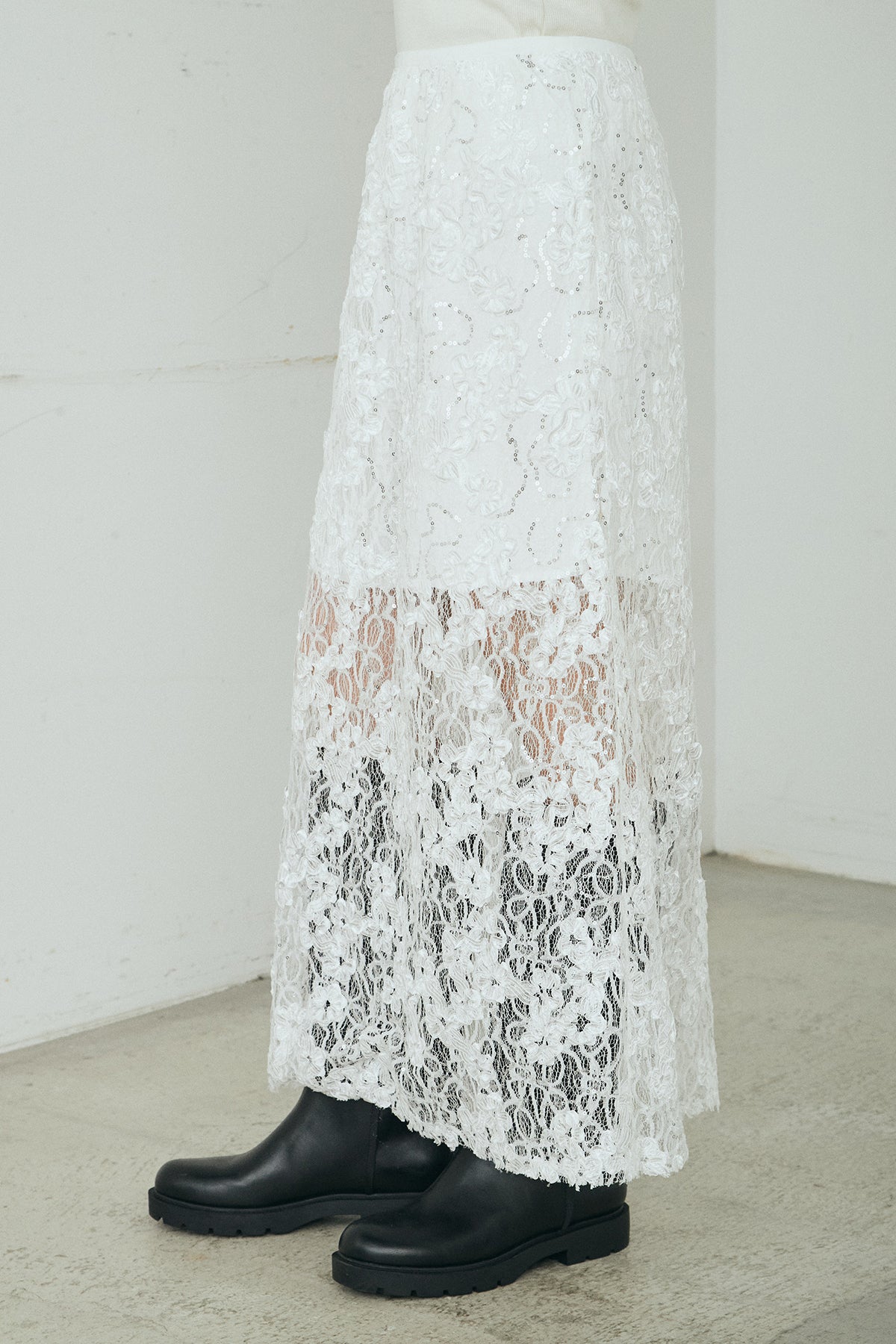 繊細なレースにラメ刺繍をあしらった、華やかさが際立つロングスカート。光を受けてほのかにきらめくディテールが、上品な存在感を引き立てます。すっきりとしたストレートシルエットが甘さを抑え、大人らしいバランスに。裾にかけて透け感を残したデザインが軽やかさを添え、ブーツやパンプスとも好相性です。シンプルなトップスと合わせるだけで、印象的なスタイルが完成します。