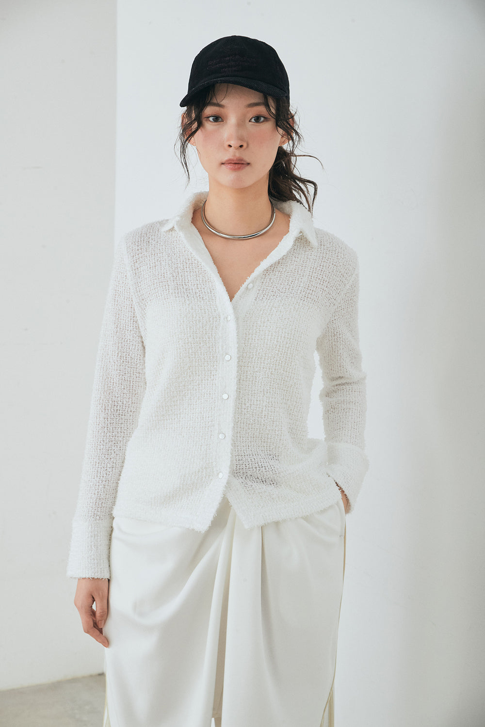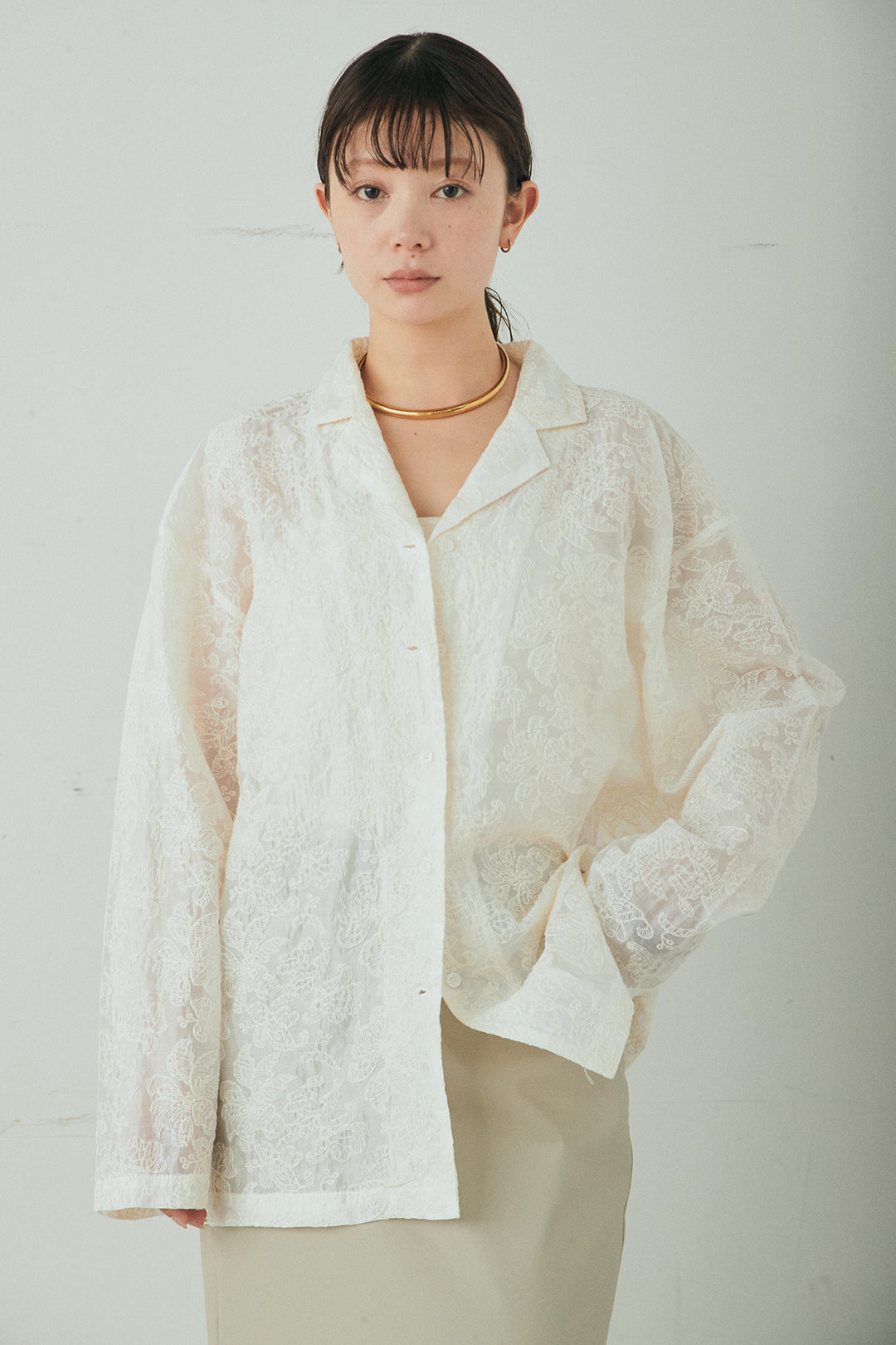 刺繍シアーオープンカラーシャツ
