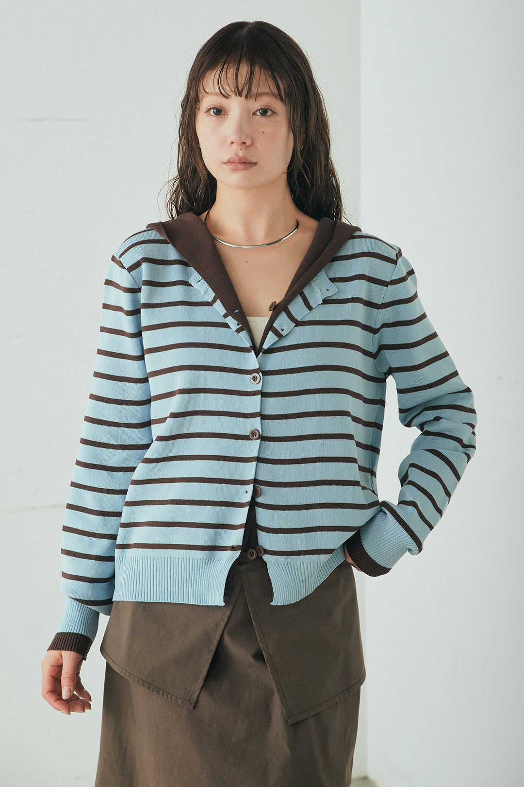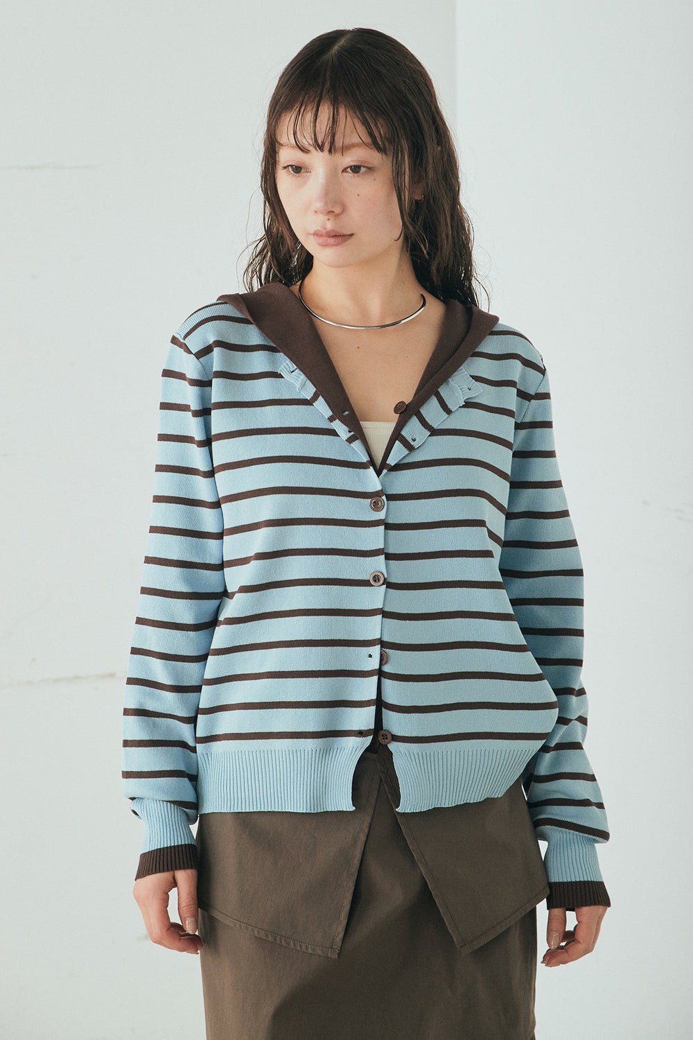 レイヤード風フード付ボーダーニットカーディガン