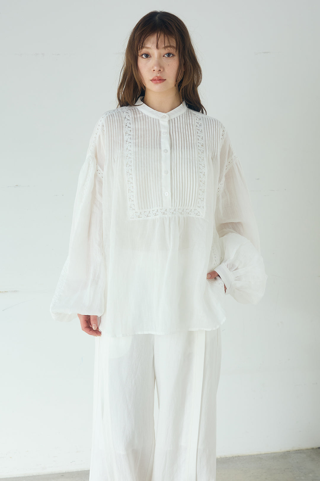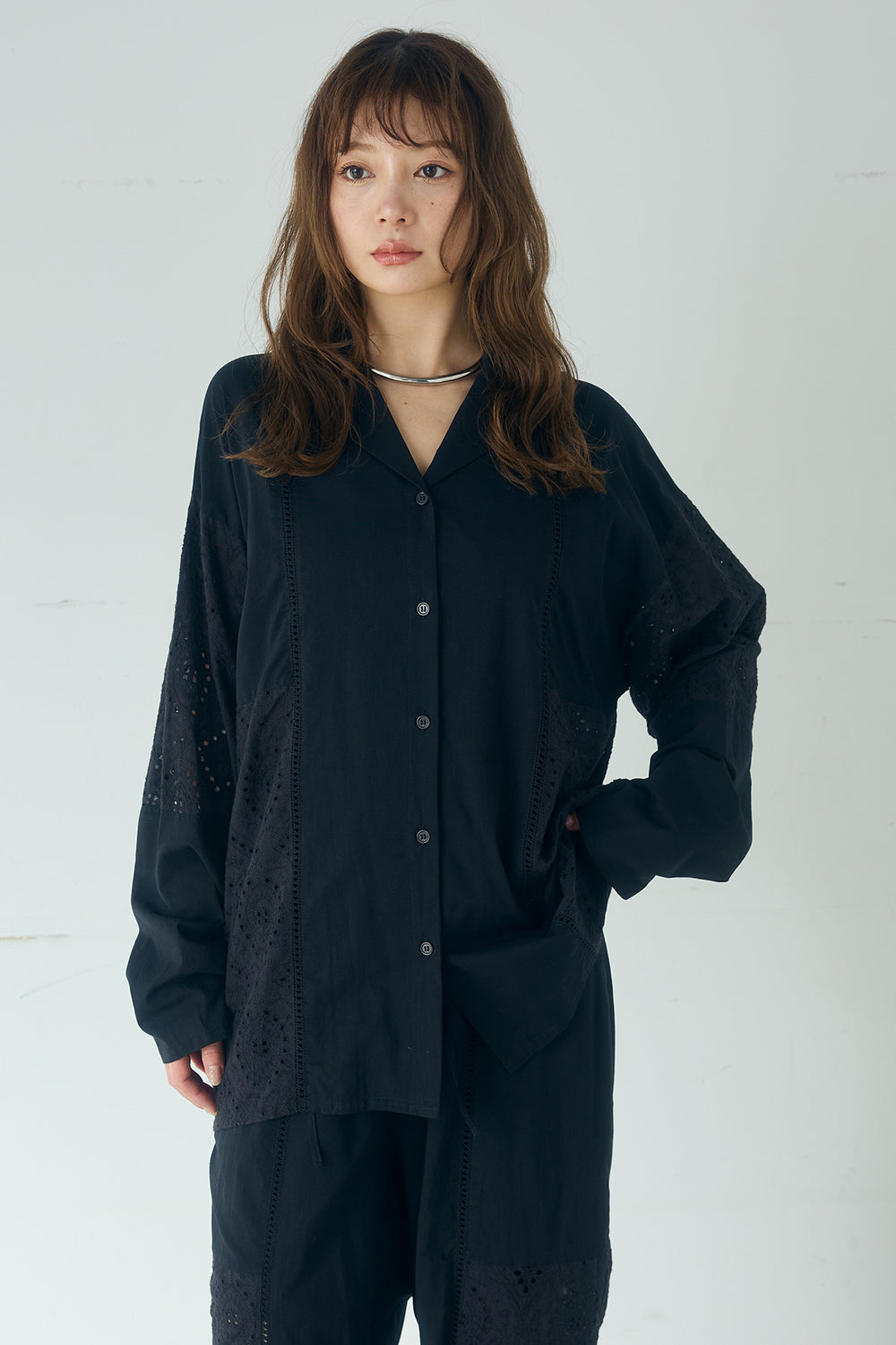 レース刺繍ラインバンドカラーシャツ