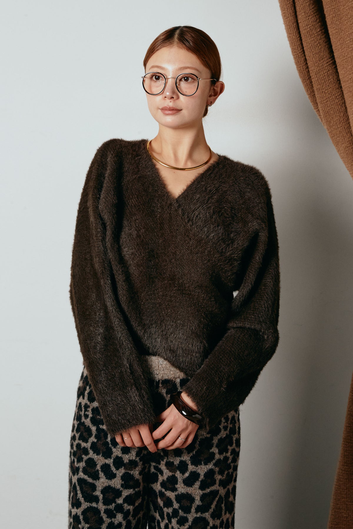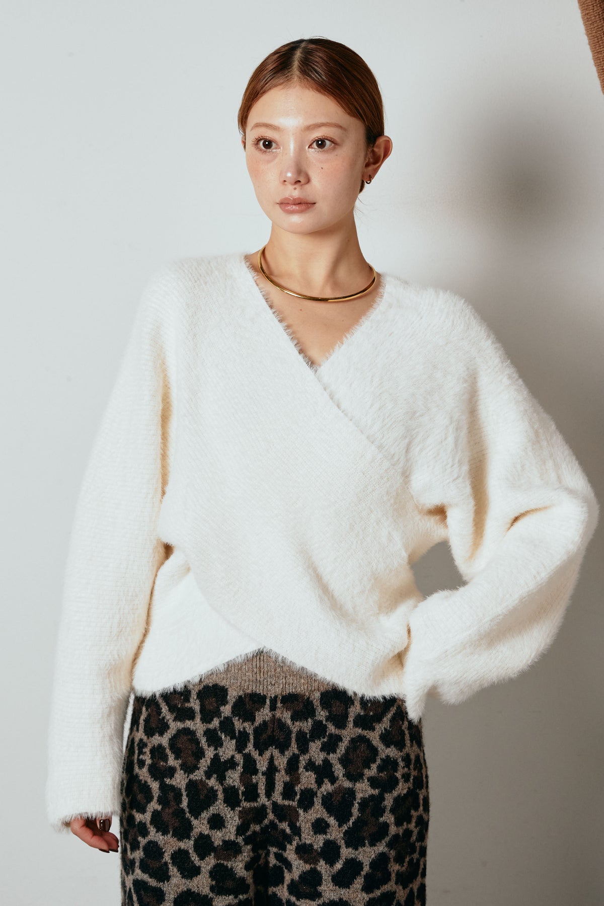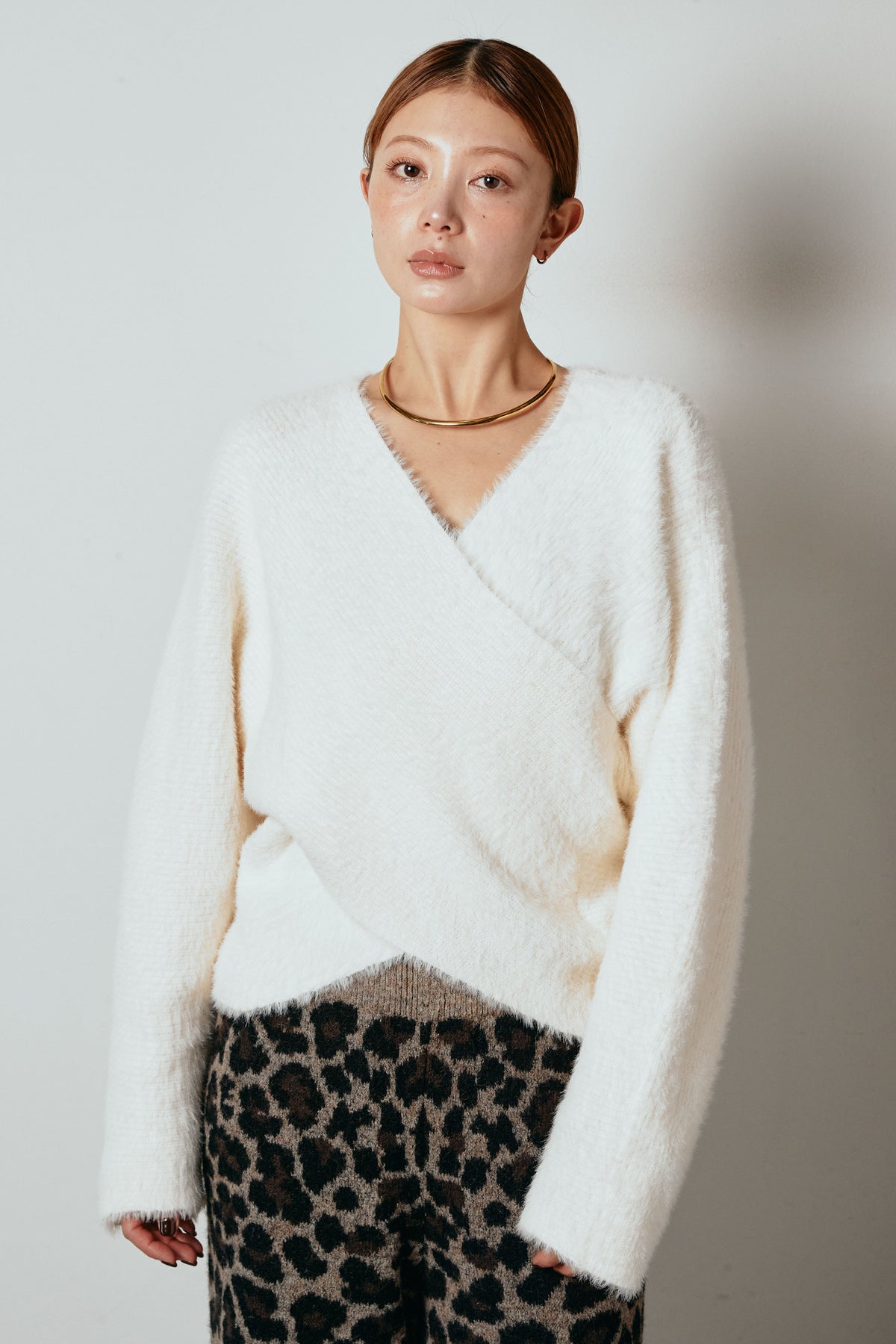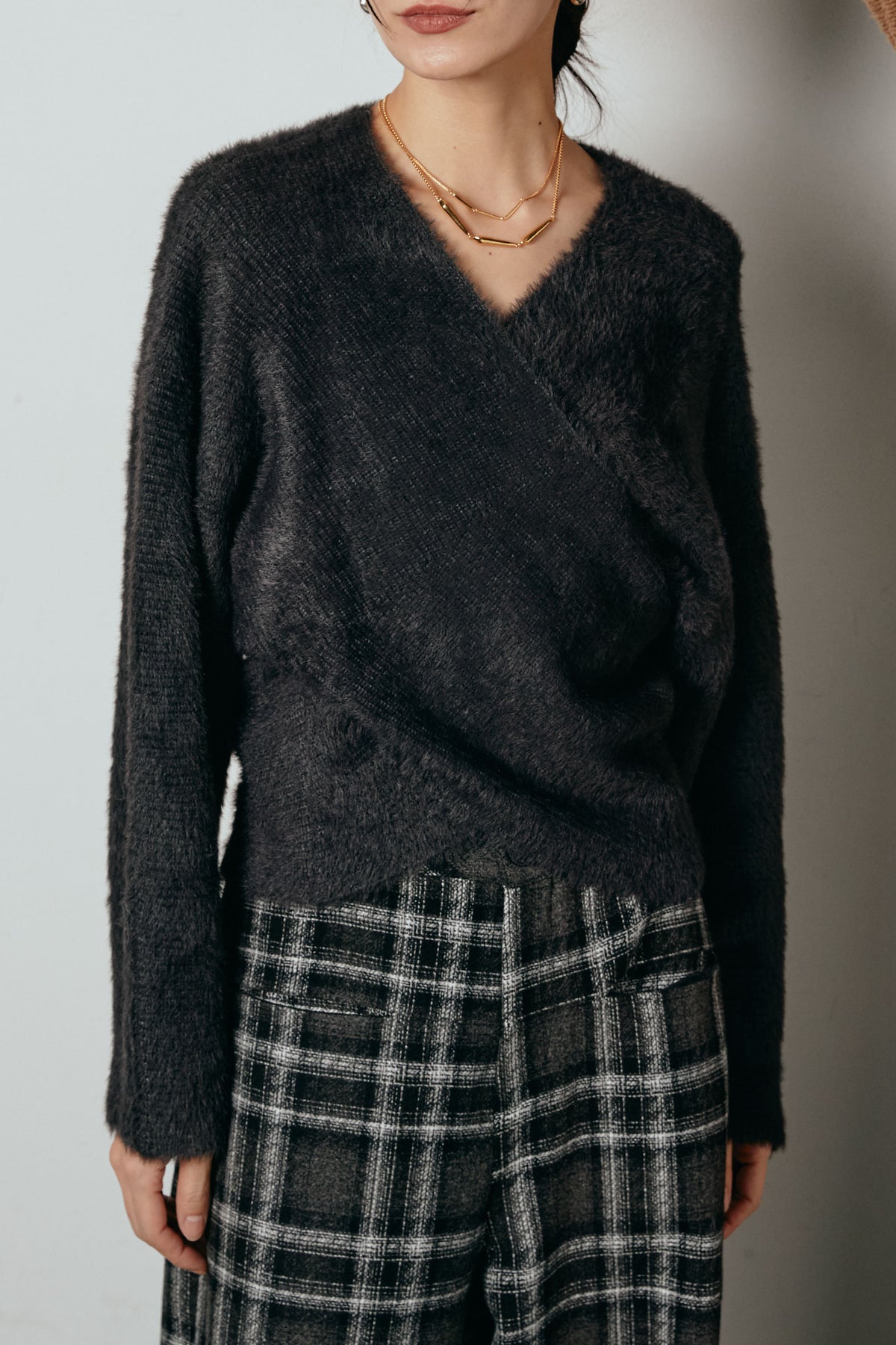 ふんわりとしたシャギーの質感が魅力のカシュクールニットトップス。 ラップ風のデザインが自然な立体感を生み、抜け感あるスタイルに仕上げます。 柔らかな肌ざわりで着心地も快適。 シンプルなボトム合わせでもこなれた印象になり、レイヤードスタイルにも活躍する万能アイテムです。