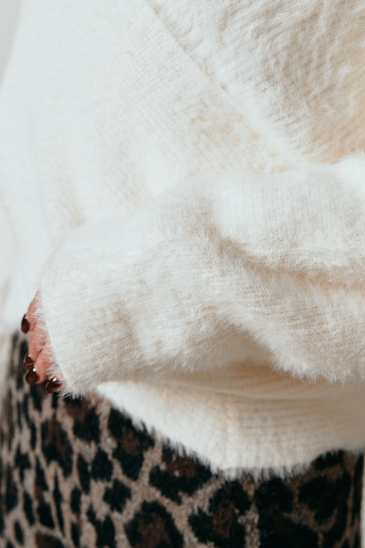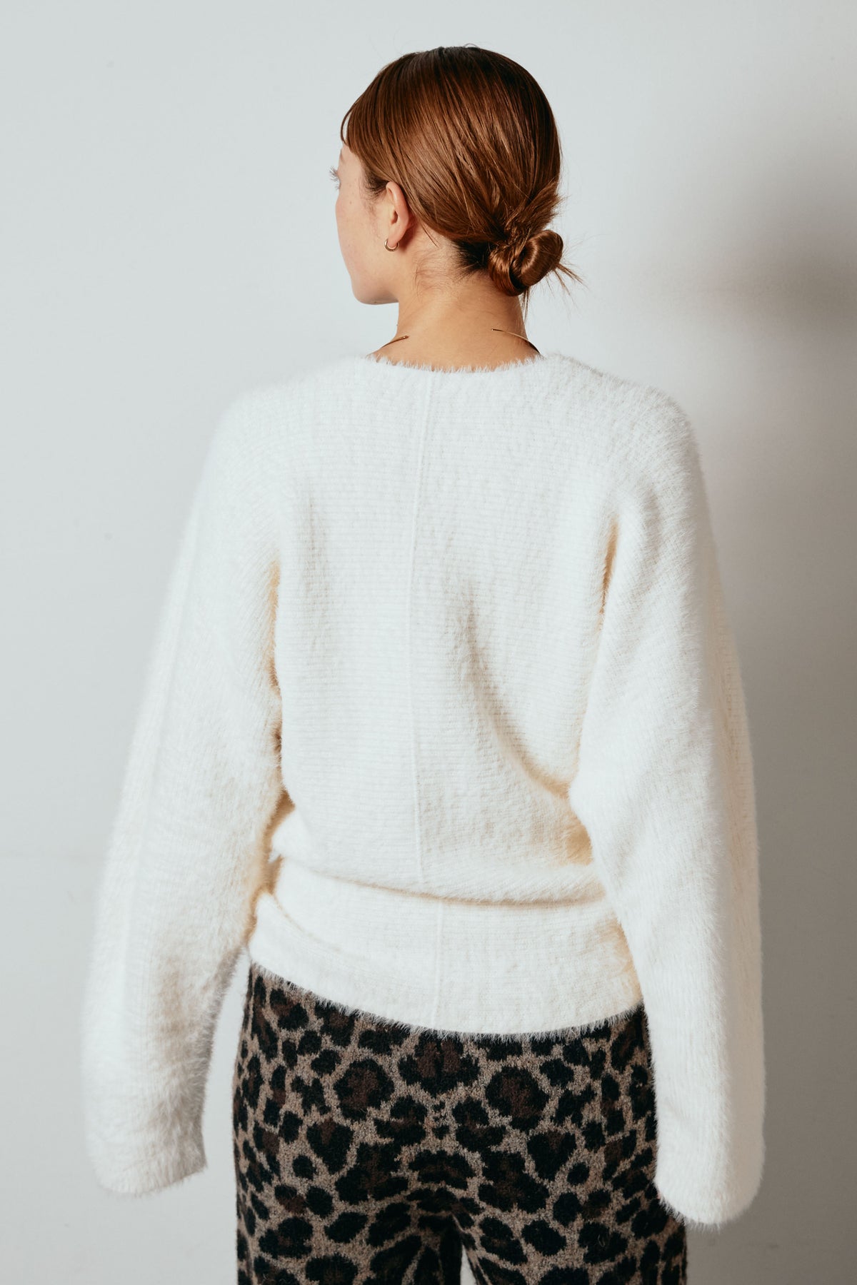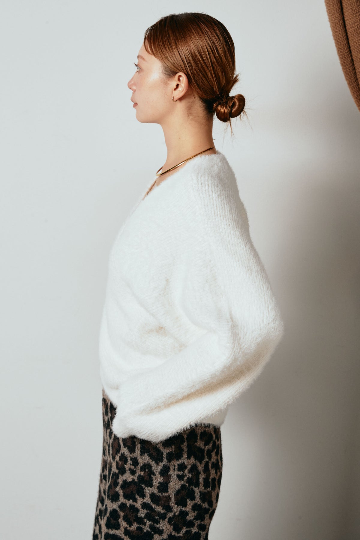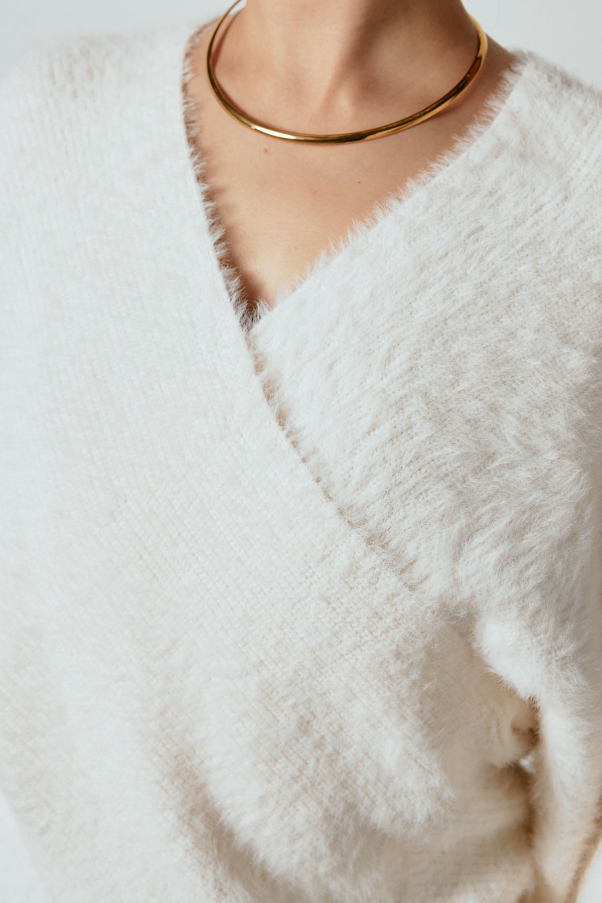 ふんわりとしたシャギーの質感が魅力のカシュクールニットトップス。 ラップ風のデザインが自然な立体感を生み、抜け感あるスタイルに仕上げます。 柔らかな肌ざわりで着心地も快適。 シンプルなボトム合わせでもこなれた印象になり、レイヤードスタイルにも活躍する万能アイテムです。
