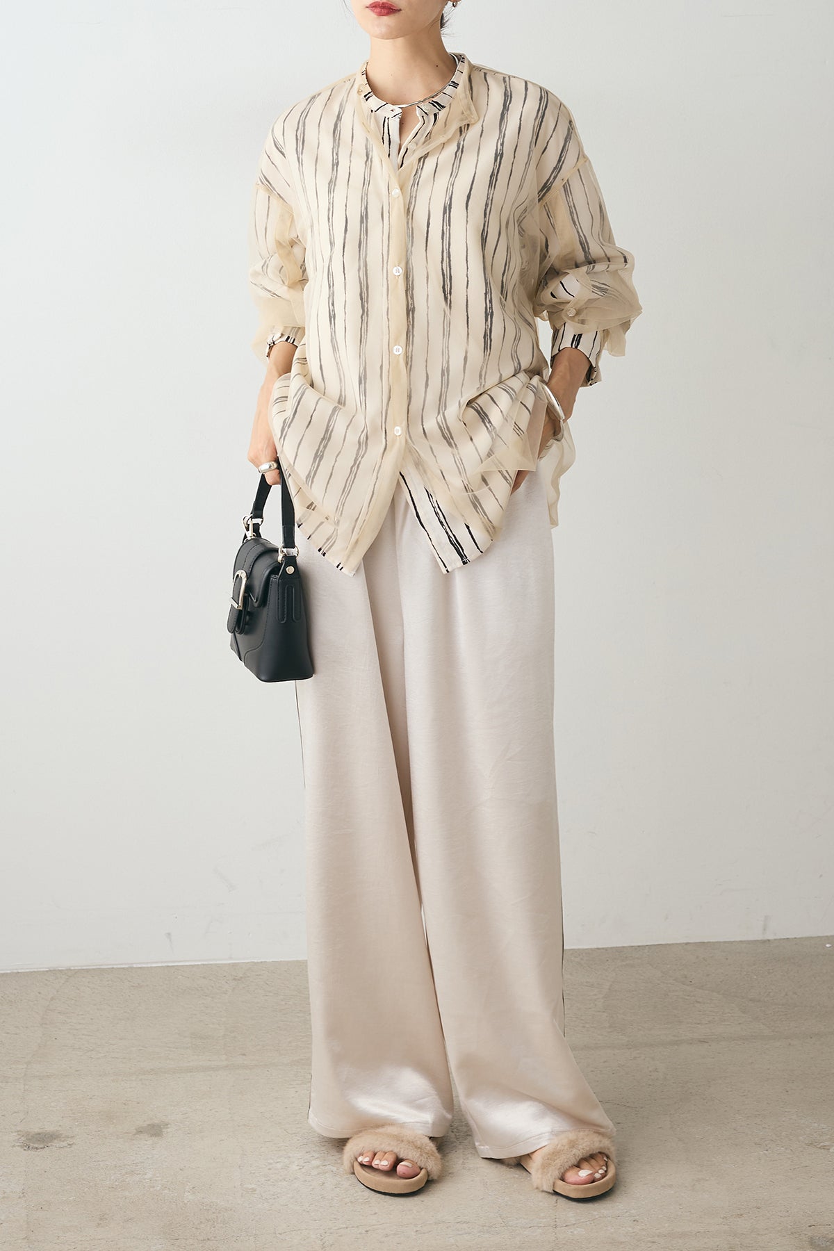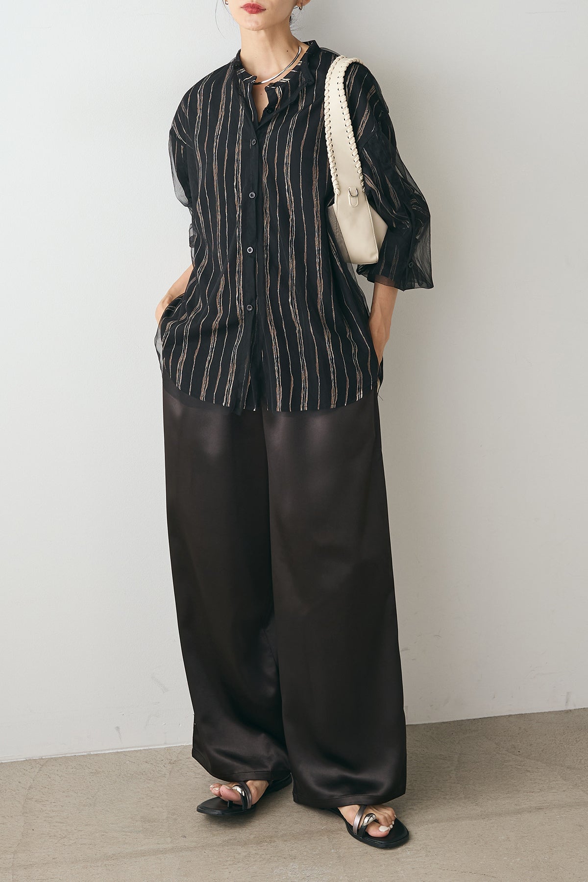 滑らかな光沢感が魅力のサテンサイドラインパンツ。リラックス感のあるワイドシルエットに、両サイドのラインが縦のラインを強調し、脚をすっきり見せます。ウエストは総ゴム仕様で着心地も快適。カジュアルにもきれいめにも合わせやすく、シンプルなトップスと合わせるだけで洗練された印象に仕上がります。