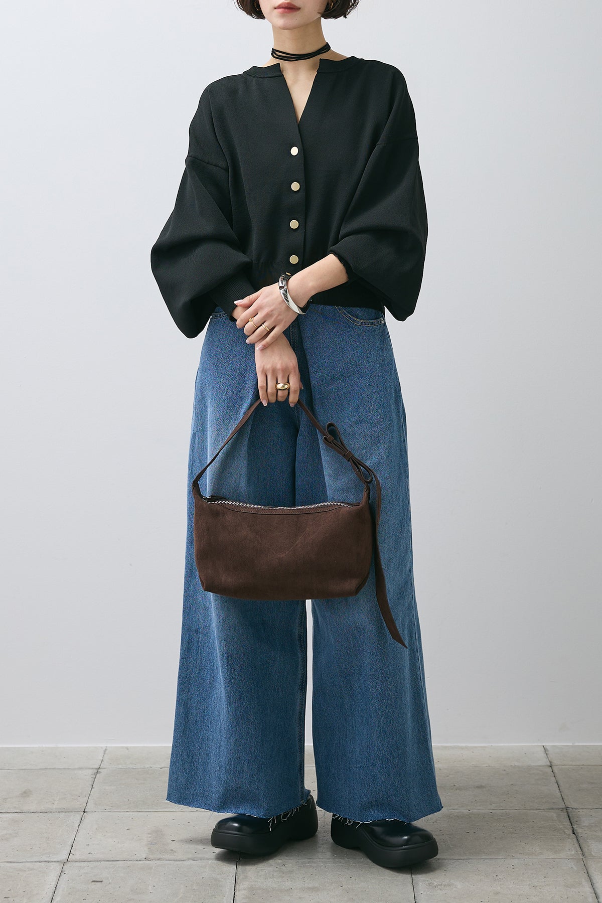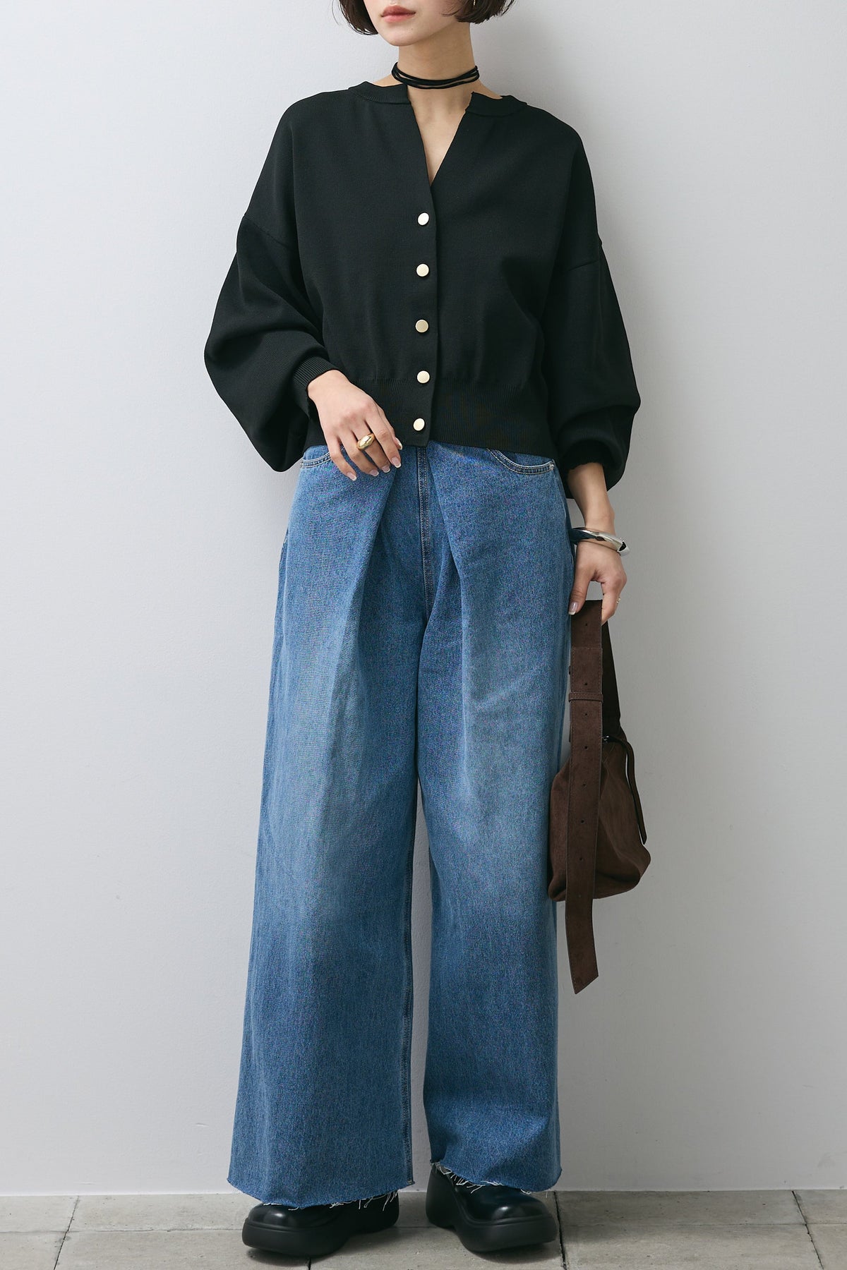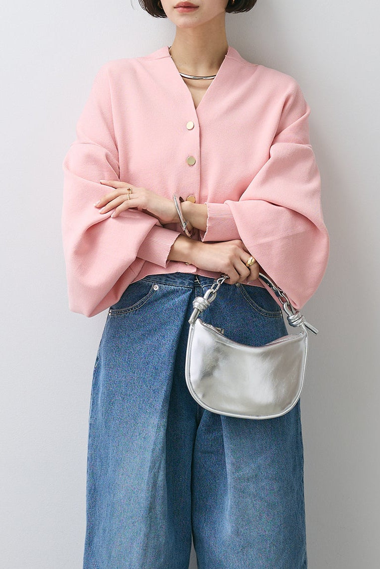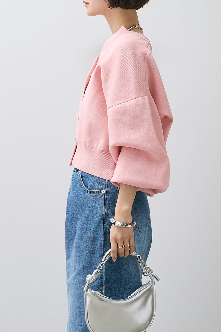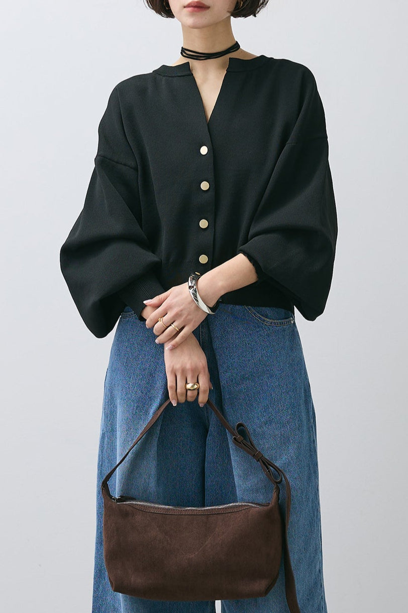 エレガントなゴールドボタンが目を引くカーディガン。クルーネックのシンプルなデザインながら、袖に程よいボリュームを持たせることで女性らしいシルエットを演出します。コーディネートの主役にも羽織りとしても活躍し、カジュアルからきれいめまで幅広く使える万能な一着です。