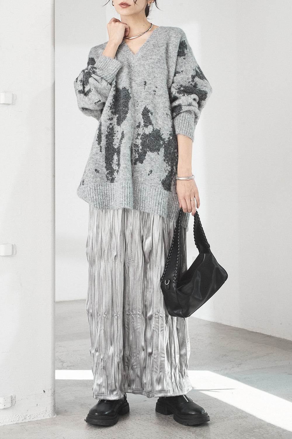 [SET]アブストラクト柄ニットプルオーバー+ベロアロングプリーツスカート(2set)