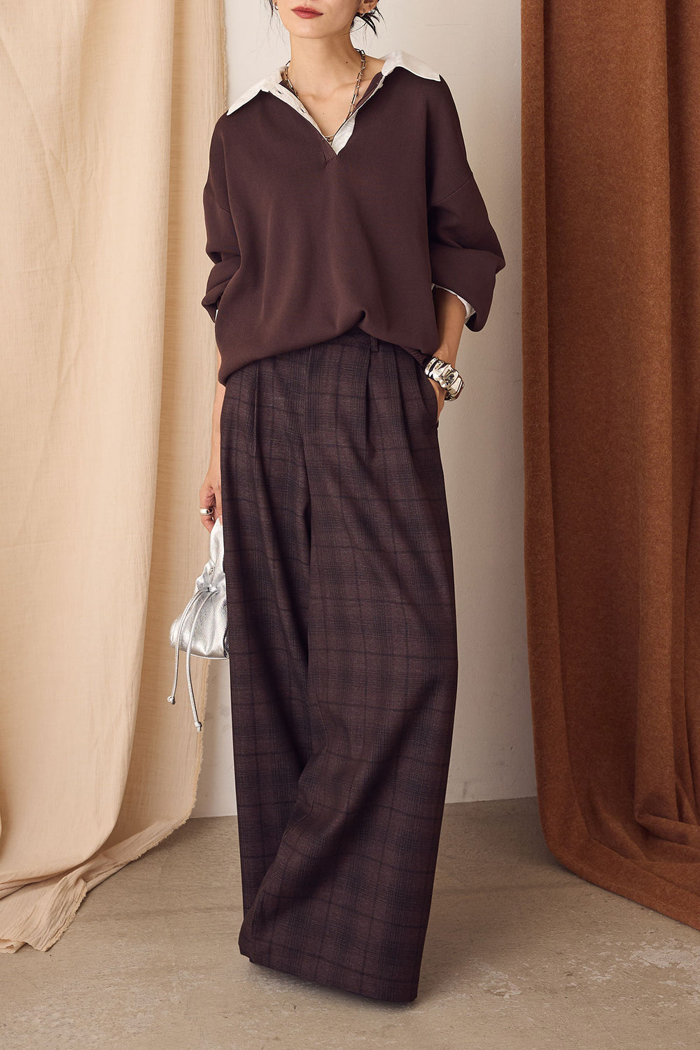 [SET]襟付きポロトップス+タック入りタータンチェックワイドパンツ(2set)