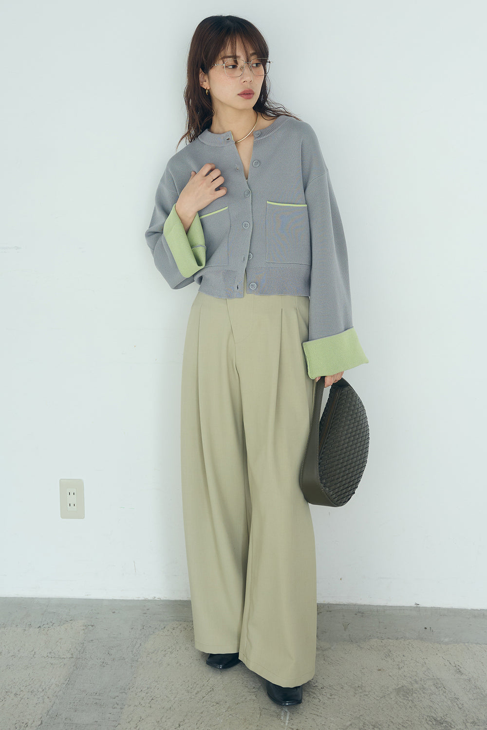 【着回しセット】[SET]ミックスメッシュキーネックプルオーバー+モチーフ付きシアーブルゾン+ベルト付きツータックワイドパンツ(3set)