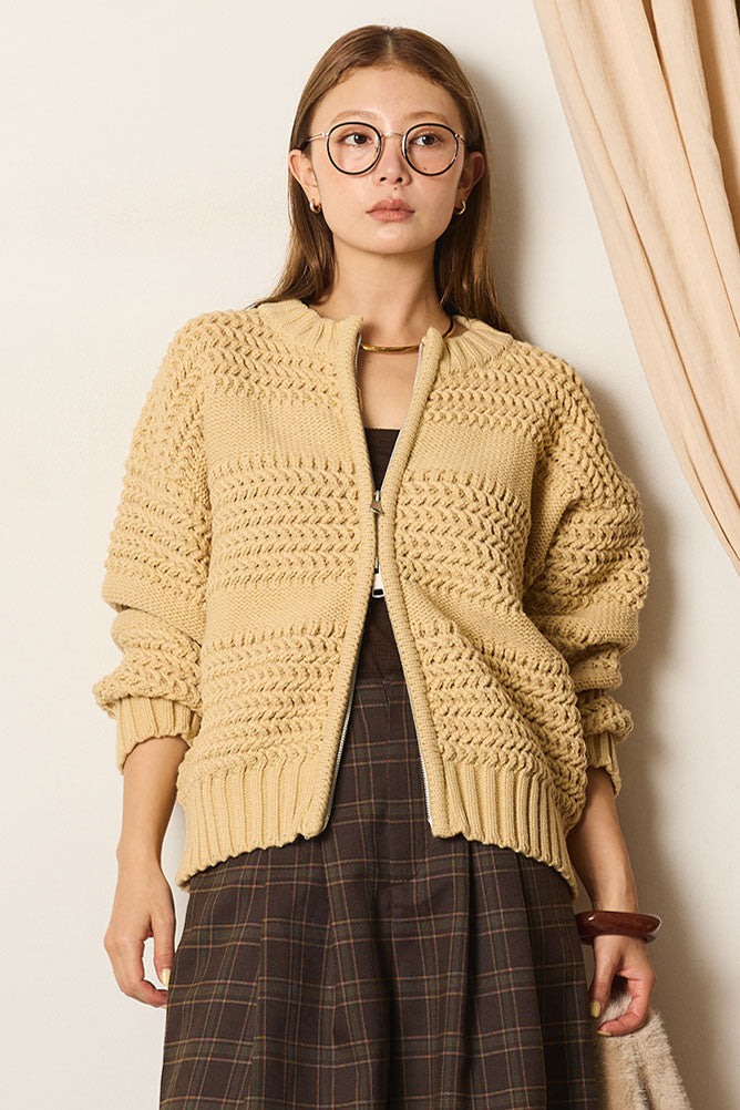 立体感のあるライン編みが目を引くダブルジップニットカーディガン。厚みのある編地が温かみをプラスし、ジップの開閉でシルエットや着こなしに変化をつけられます。カジュアルなデニムからスカートスタイルまで幅広く合わせやすく、秋冬のワードローブに欠かせない一枚です。
