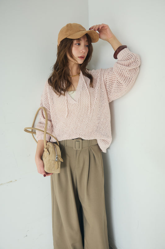 異なる編み地をミックスした表情のある素材感が印象的なキーネックプルオーバー。 程よく透け感のあるメッシュ編みが軽やかさを演出し、シンプルながらも奥行きのあるスタイリングに仕上がります。 首元のキーネックデザインが抜け感をプラスし、インナーとのレイヤードも楽しめる一枚。 ゆったりとしたシルエットで、パンツにもスカートにも合わせやすく、季節の変わり目にも活躍します。