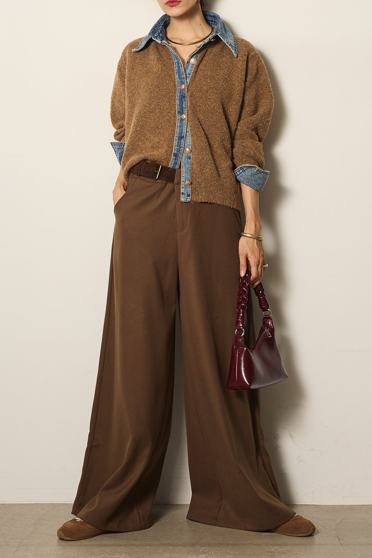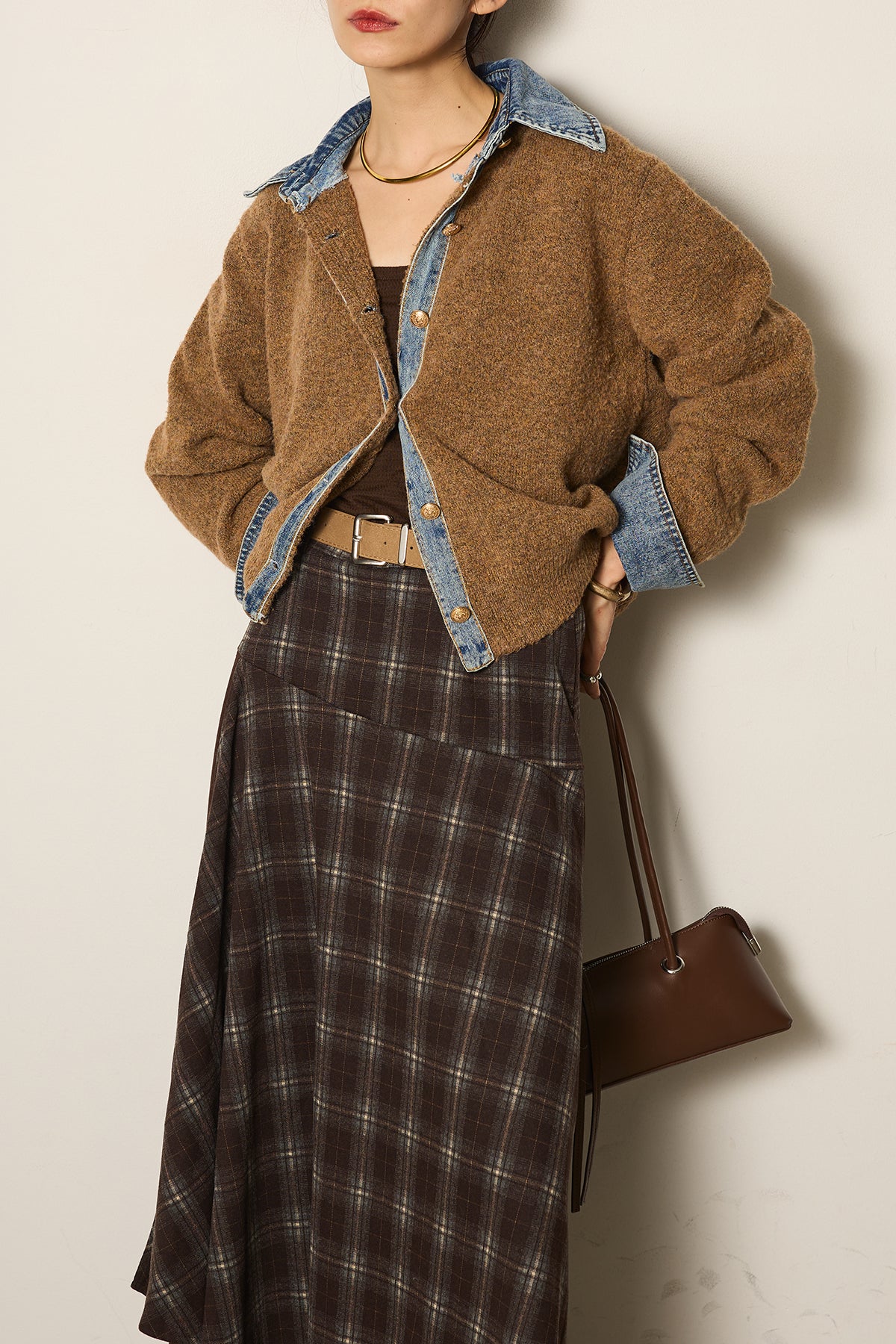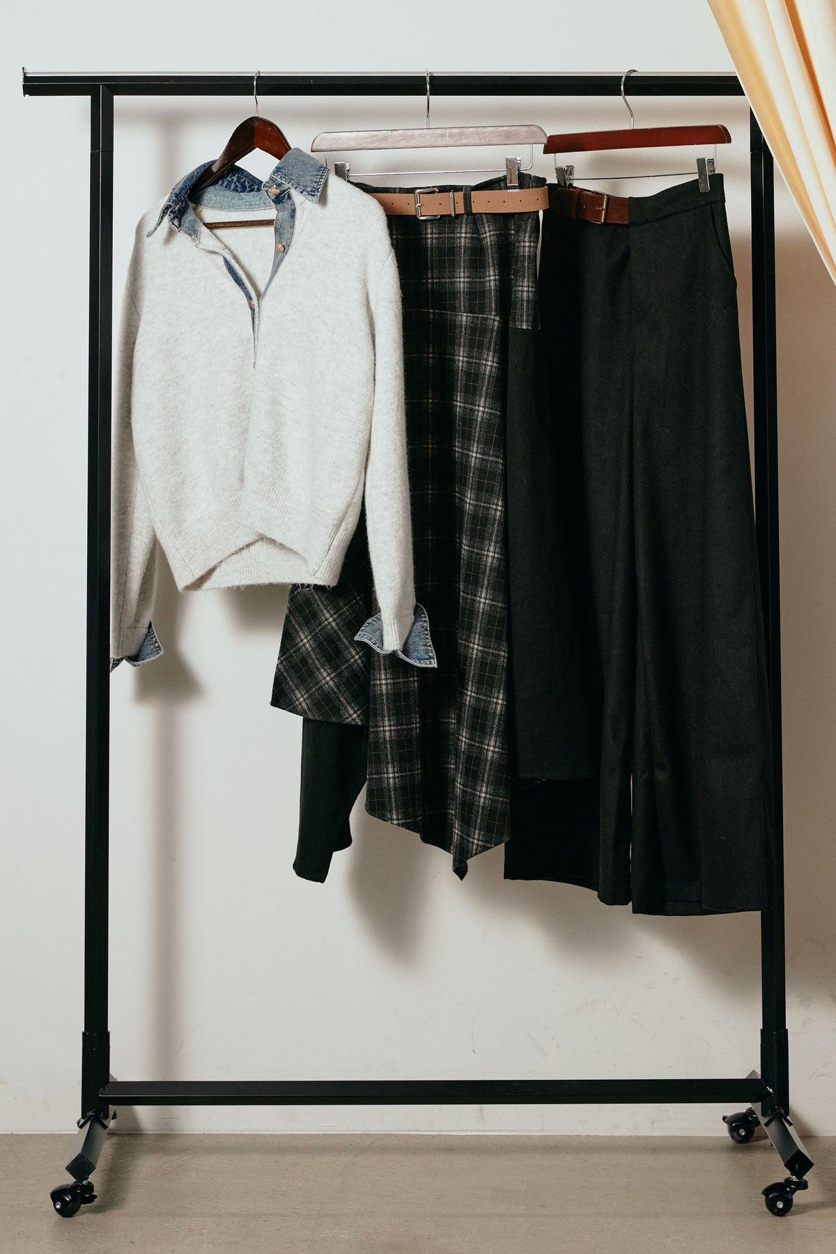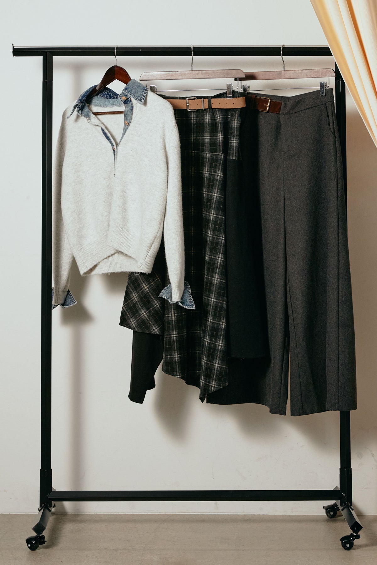 [SET]ニットドッキングデニムシャツ+フェイクレザーサイドベルトワイドパンツ+フェイクレザーベルト付き切り替えタータンチェックスカート(3set)