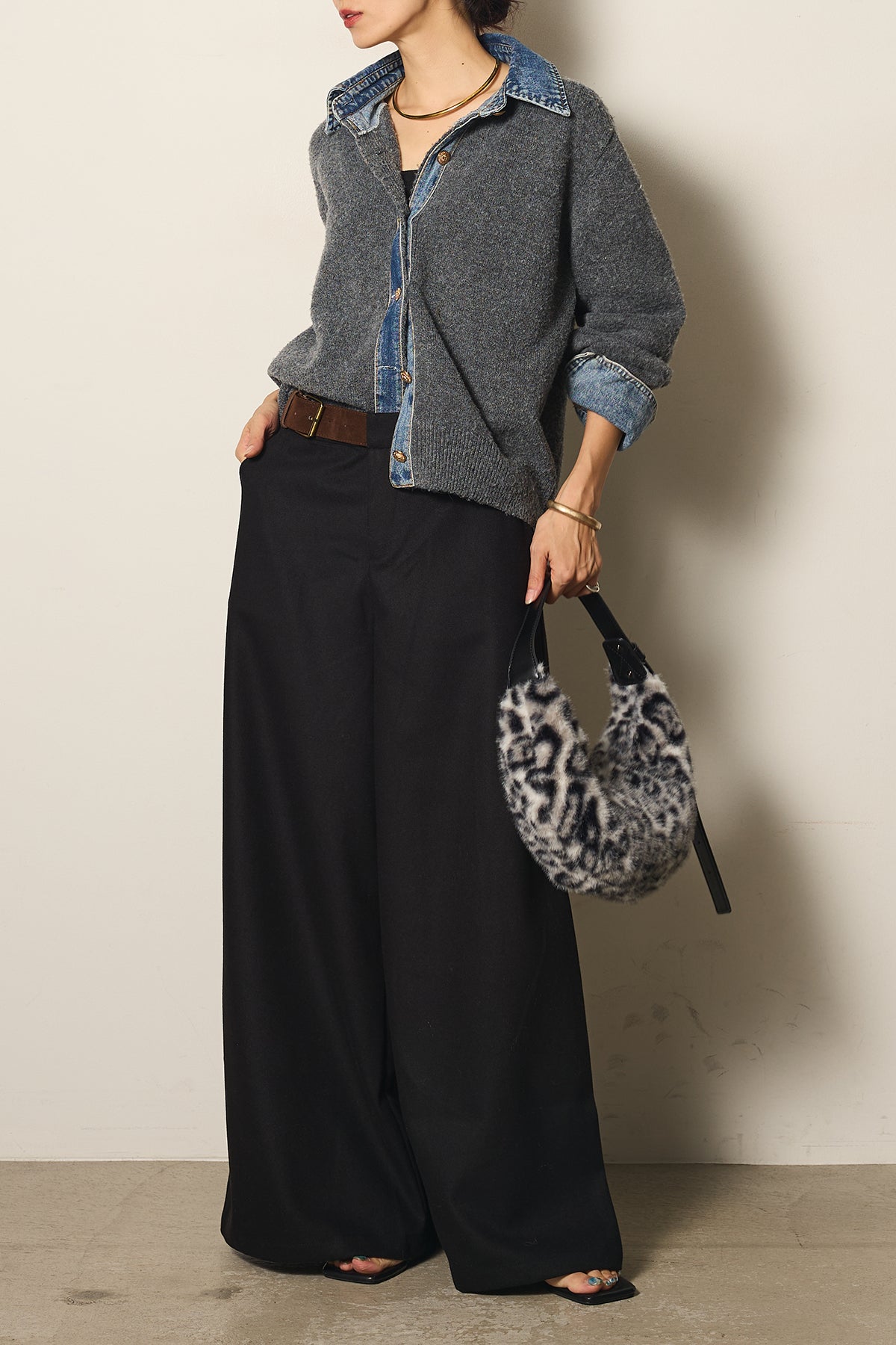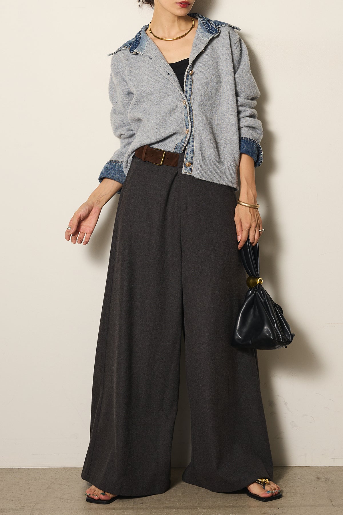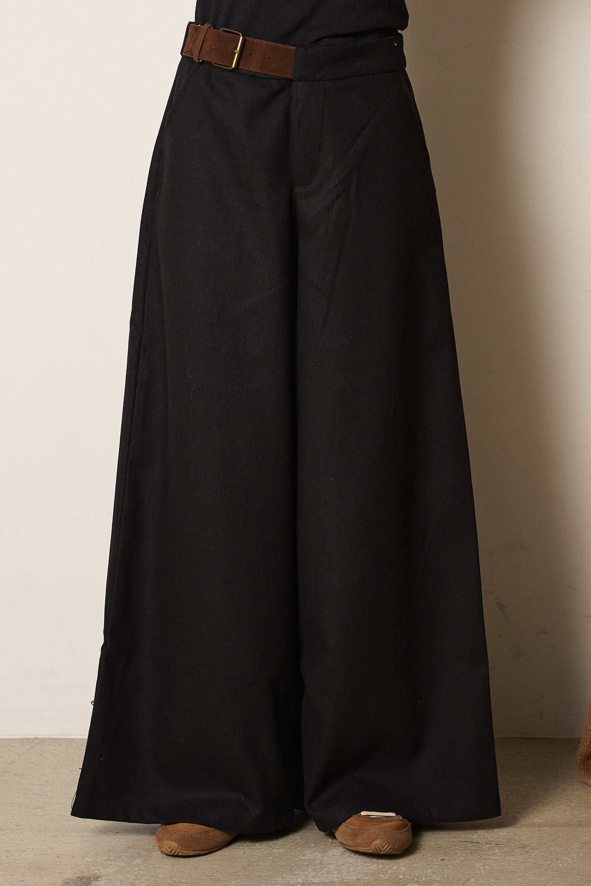 サイドにフェイクレザーベルトをあしらったワイドパンツ。ハリ感のある素材がシルエットを美しく保ち、落ち感のあるラインが脚をすらりと見せてくれます。シンプルながらもモードなアクセントを効かせたデザインで、デイリーからきれいめスタイルまで幅広く活躍する一本です。