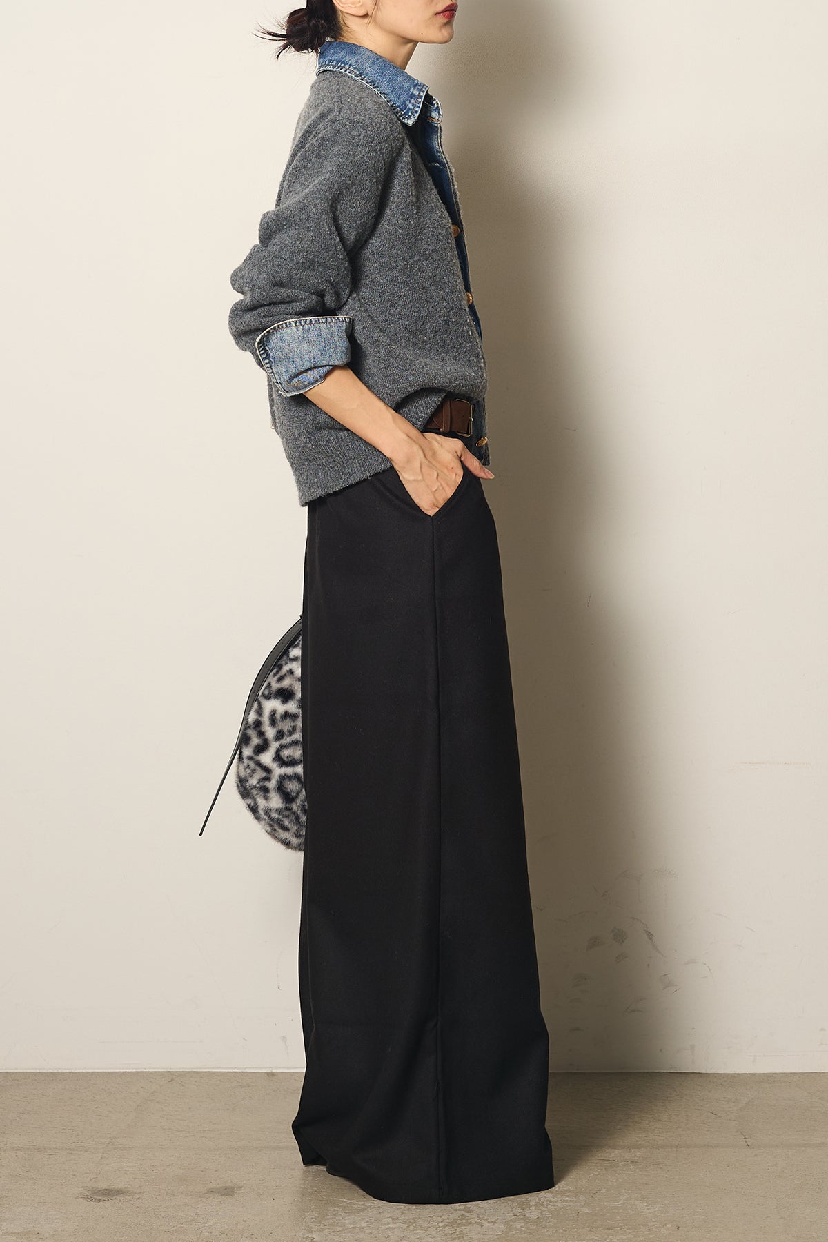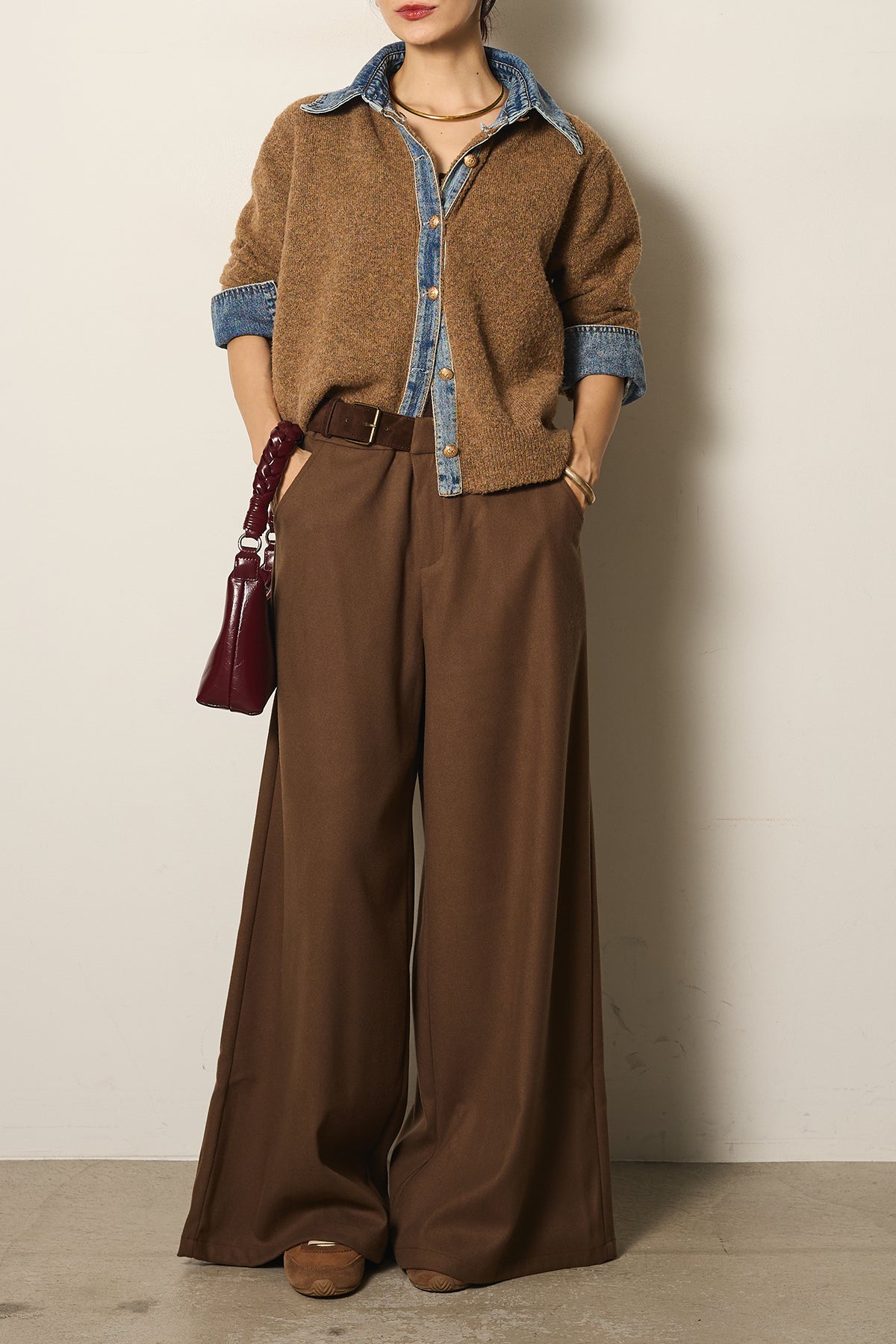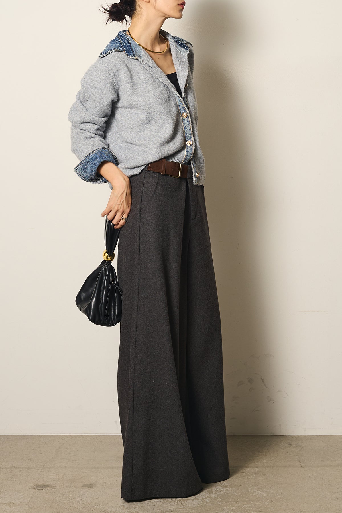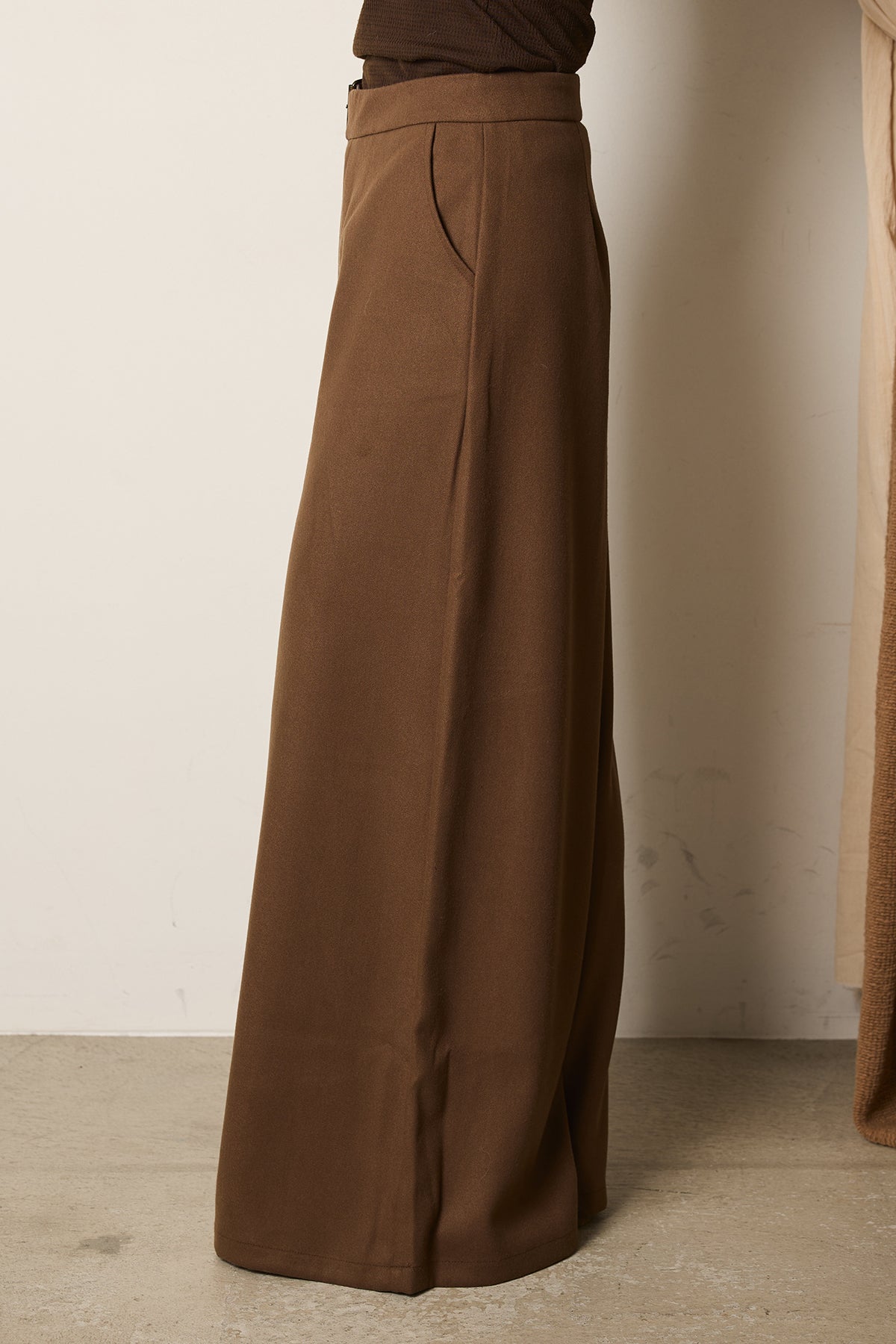 サイドにフェイクレザーベルトをあしらったワイドパンツ。ハリ感のある素材がシルエットを美しく保ち、落ち感のあるラインが脚をすらりと見せてくれます。シンプルながらもモードなアクセントを効かせたデザインで、デイリーからきれいめスタイルまで幅広く活躍する一本です。