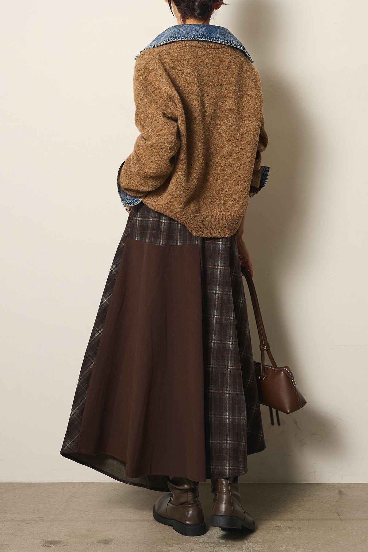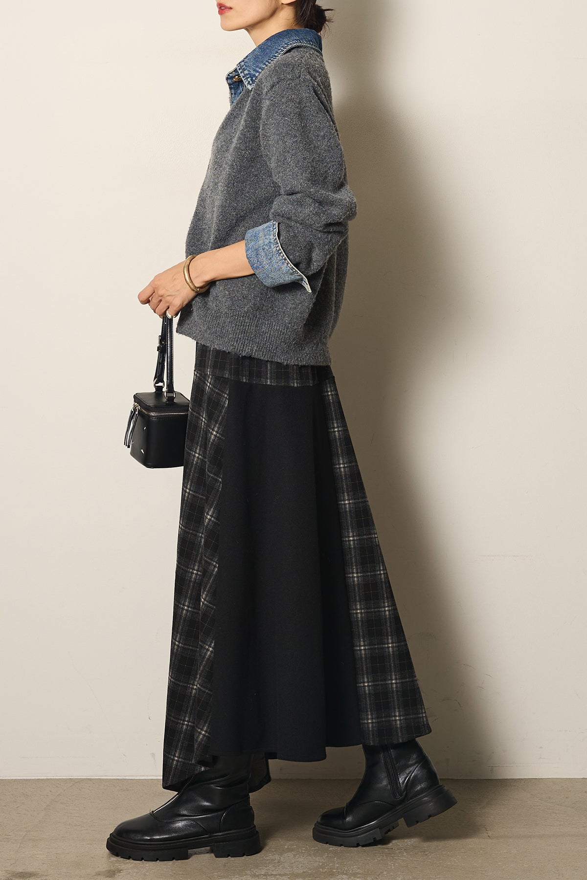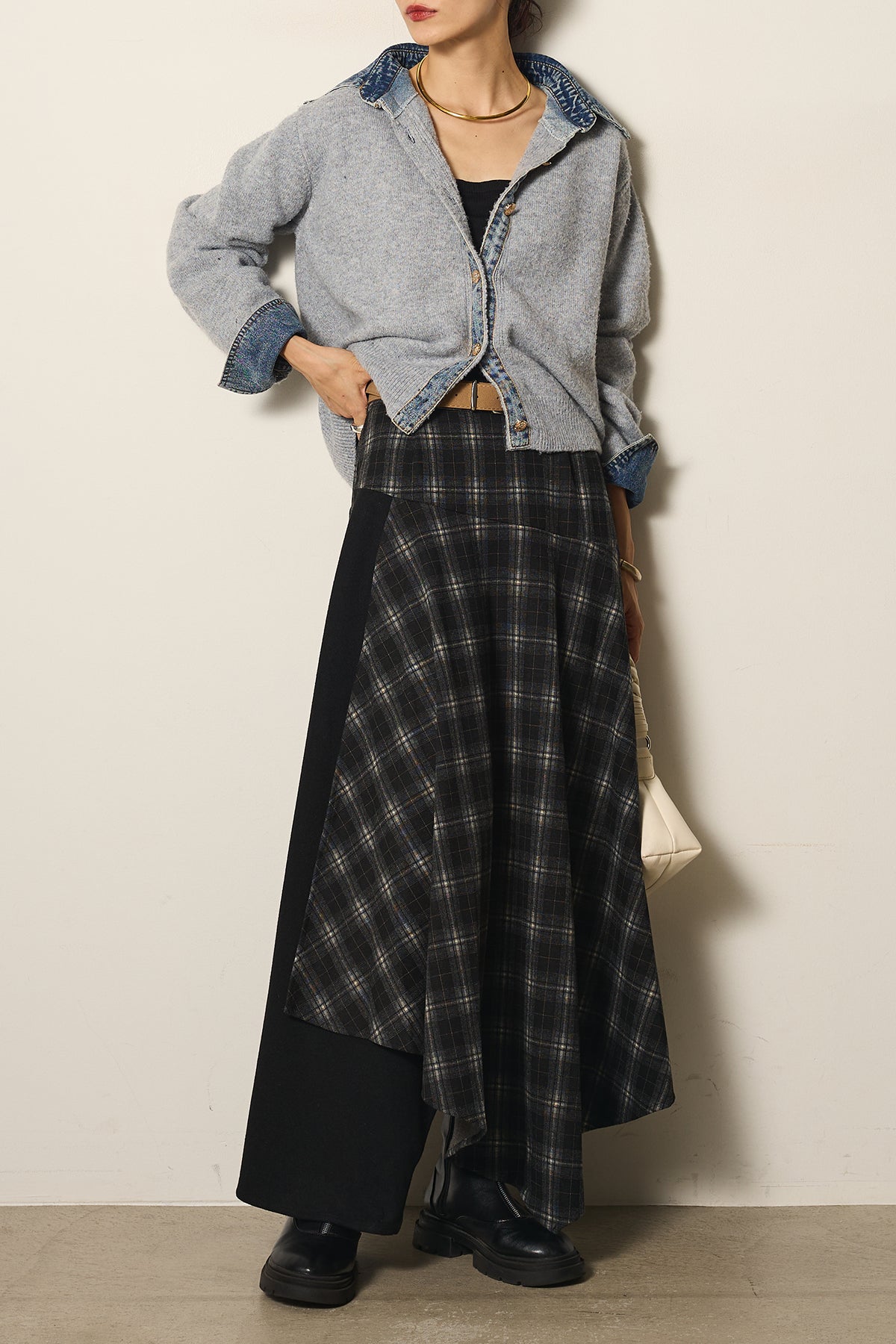 クラシカルなタータンチェック柄に、フェイクレザーベルトを組み合わせた切り替えデザインスカート。 異素材のコンビネーションがモードな印象を与え、スタイリングにアクセントをプラスします。 広がりすぎないシルエットで大人っぽく着こなせ、ブーツ合わせもバランス良く決まる一枚。 シンプルなトップスを合わせるだけで、存在感のあるスタイルが完成します。