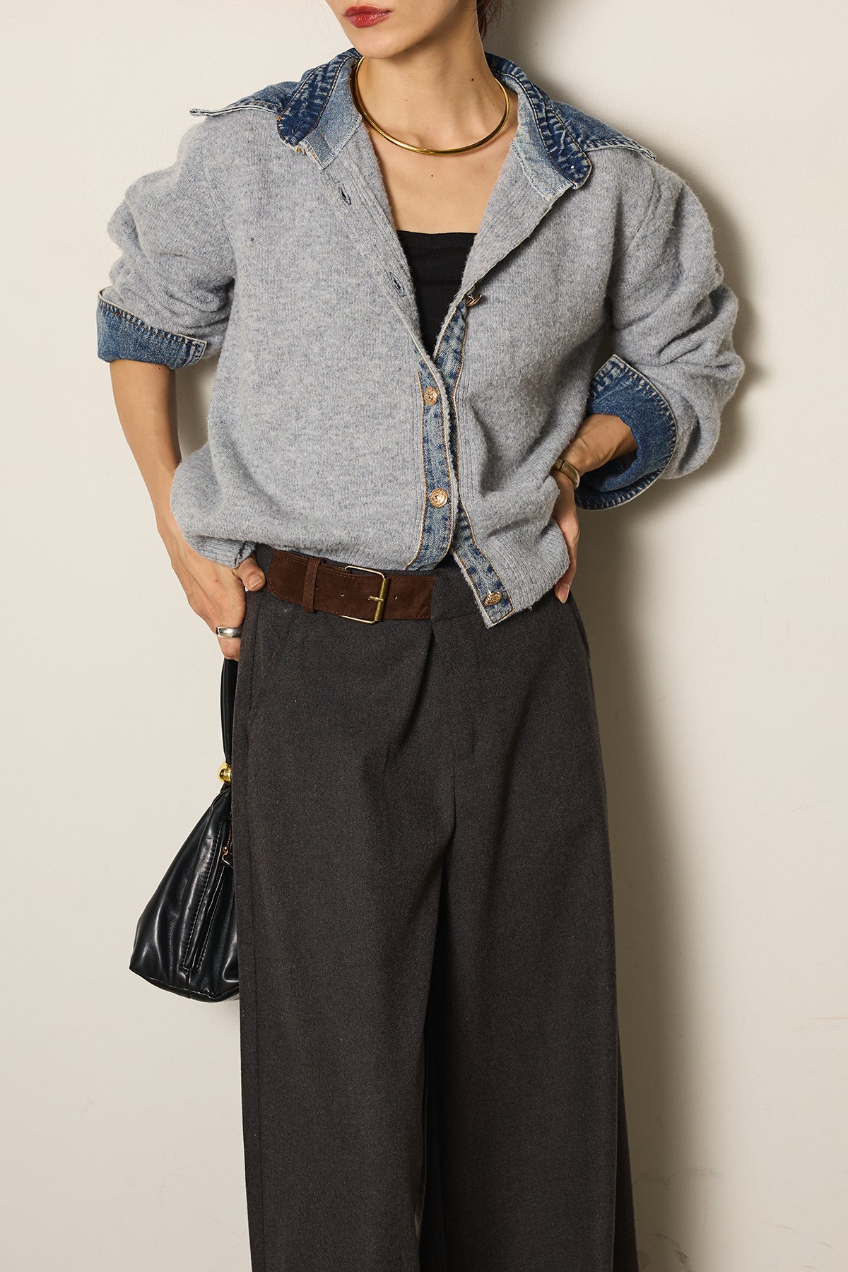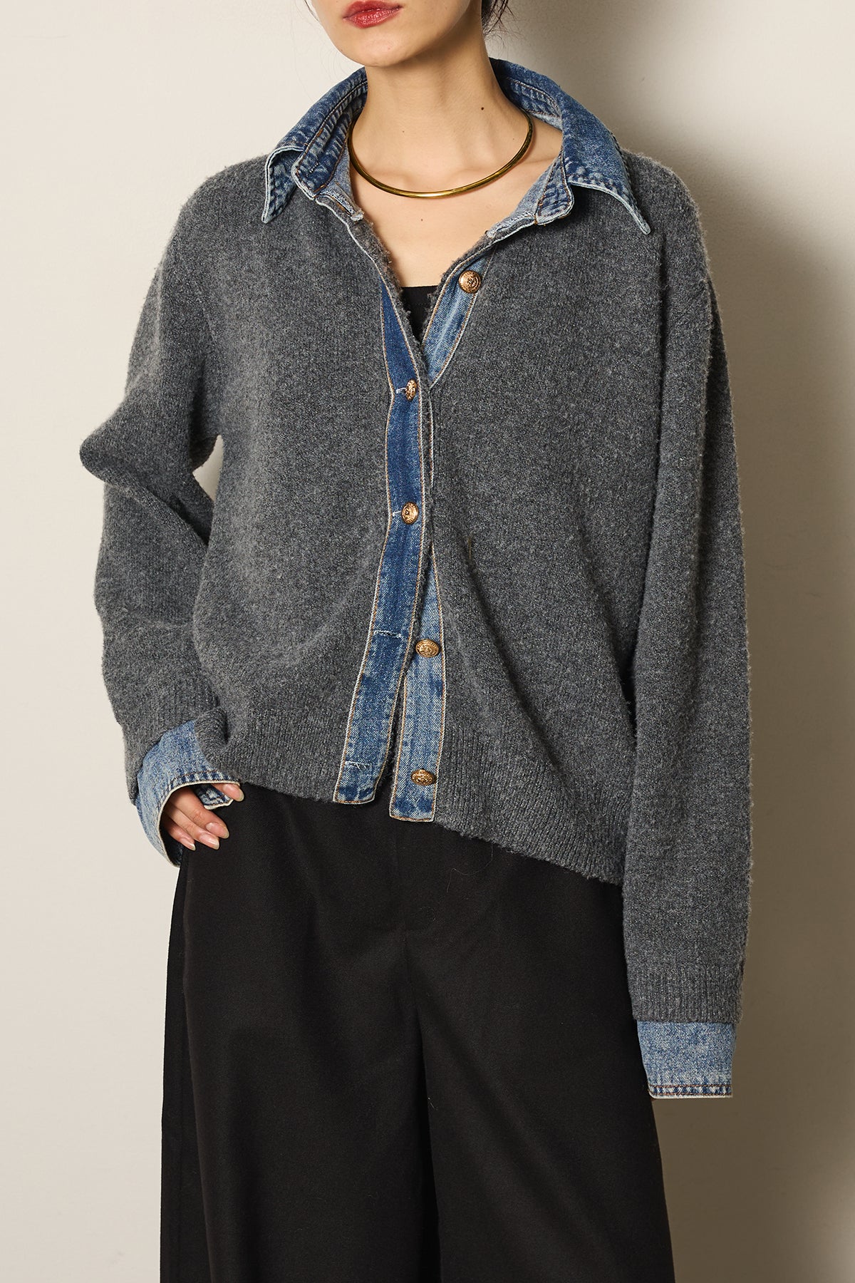 異素材の組み合わせが魅力のニットドッキングデニムシャツ。カジュアルなデニムに柔らかなニットを組み合わせ、程よい抜け感と温かみをプラスしました。襟や前立て、袖口のデニムディテールがアクセントになり、一枚で主役級の存在感を放ちます。シンプルなボトムと合わせるだけでこなれたスタイルが完成するアイテムです。