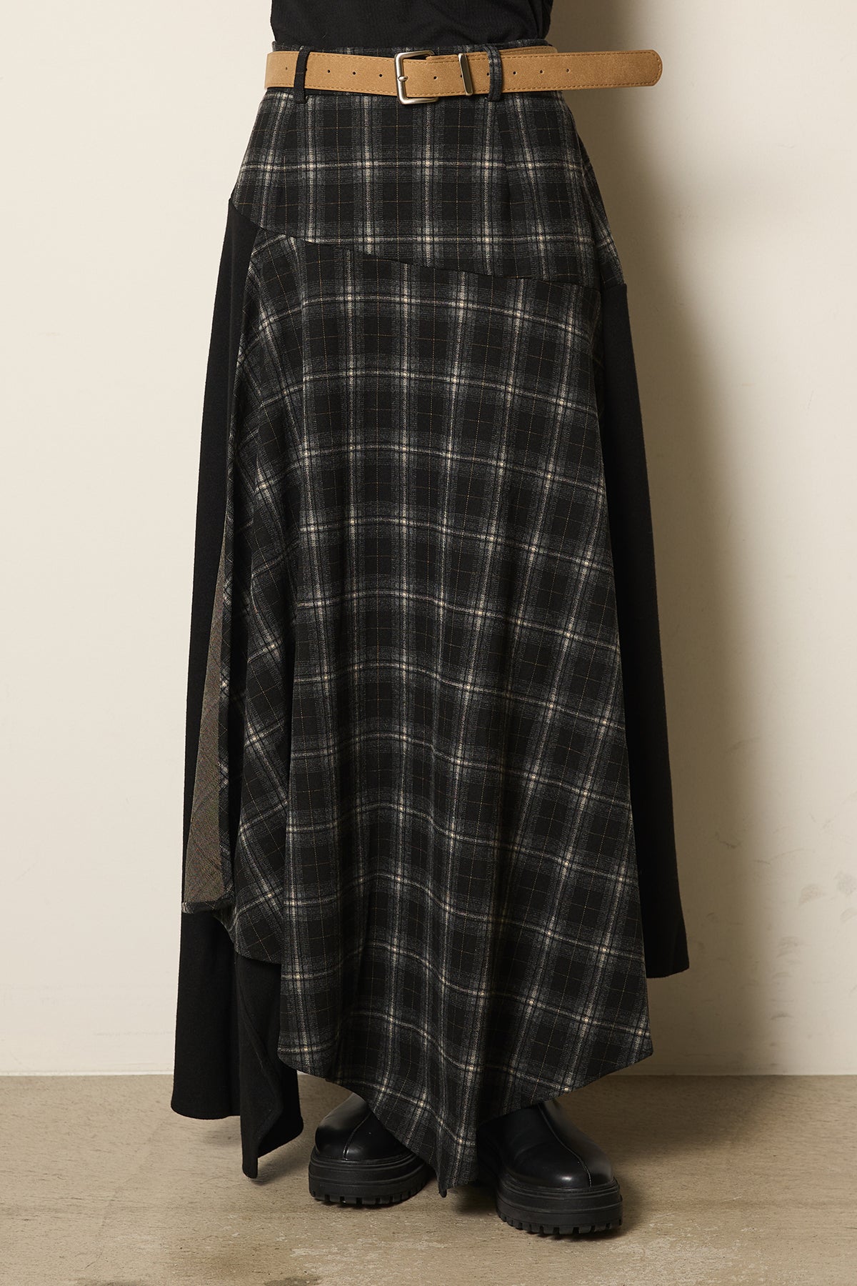 ◆ フェイクレザーベルト付き切り替えタータンチェックスカート