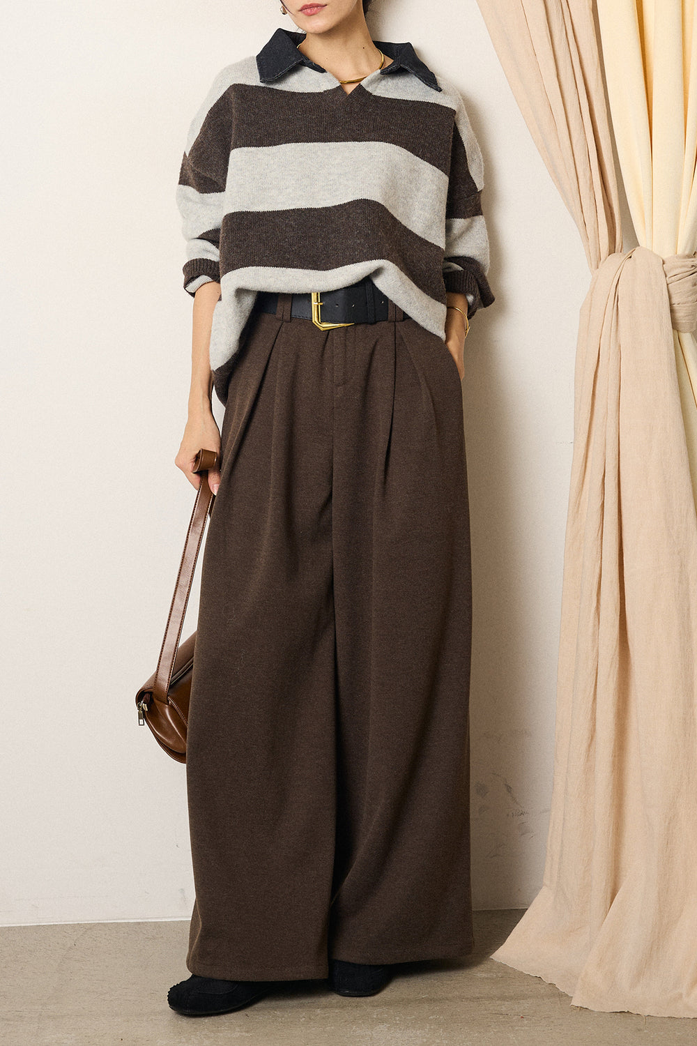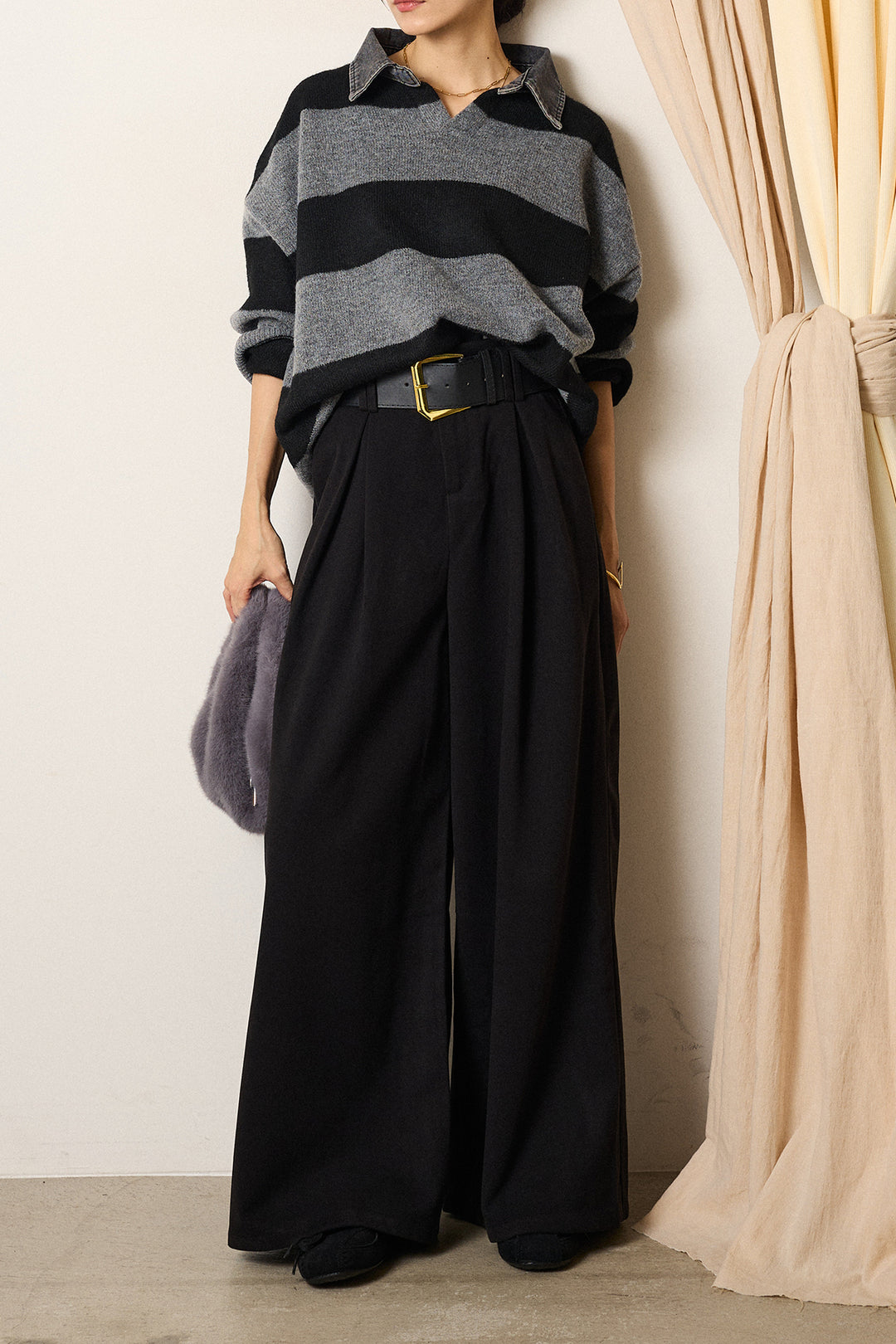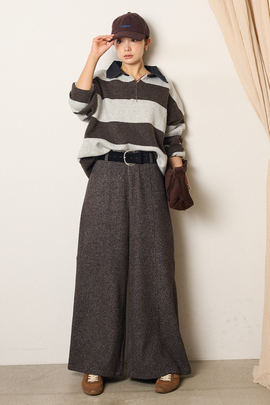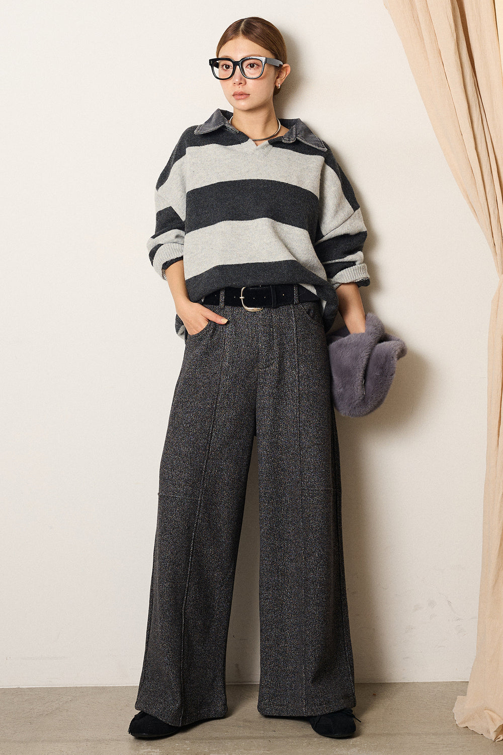 [SET]デニムカラーボーダールーズニット+太ベルト付きツイードワイドパンツ(2set)