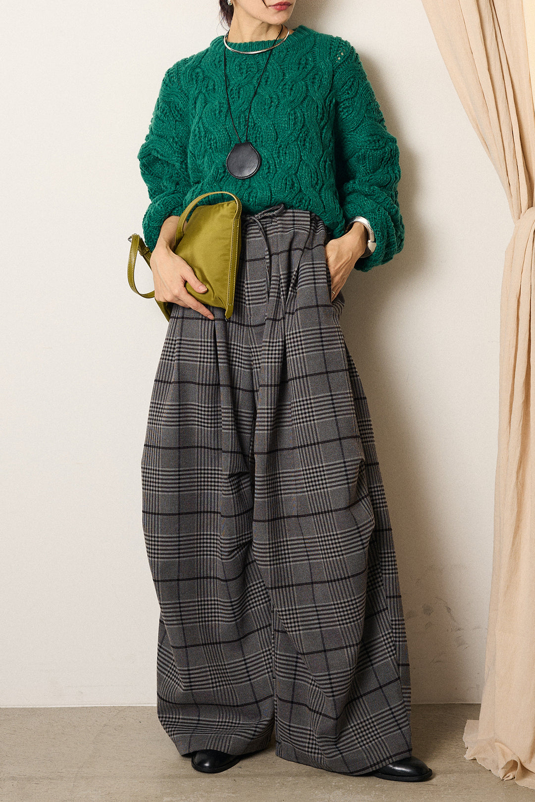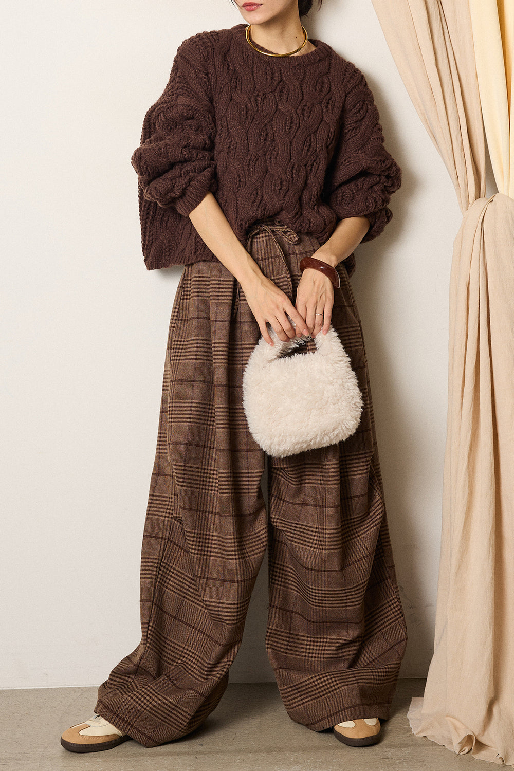 [SET]ケーブルリラックスショートニット+グレンチェックルーズタックパンツ(2set)