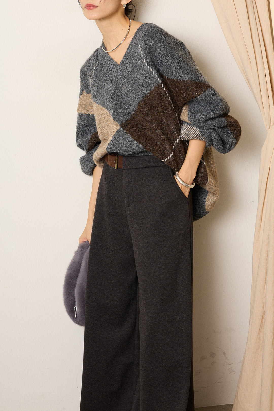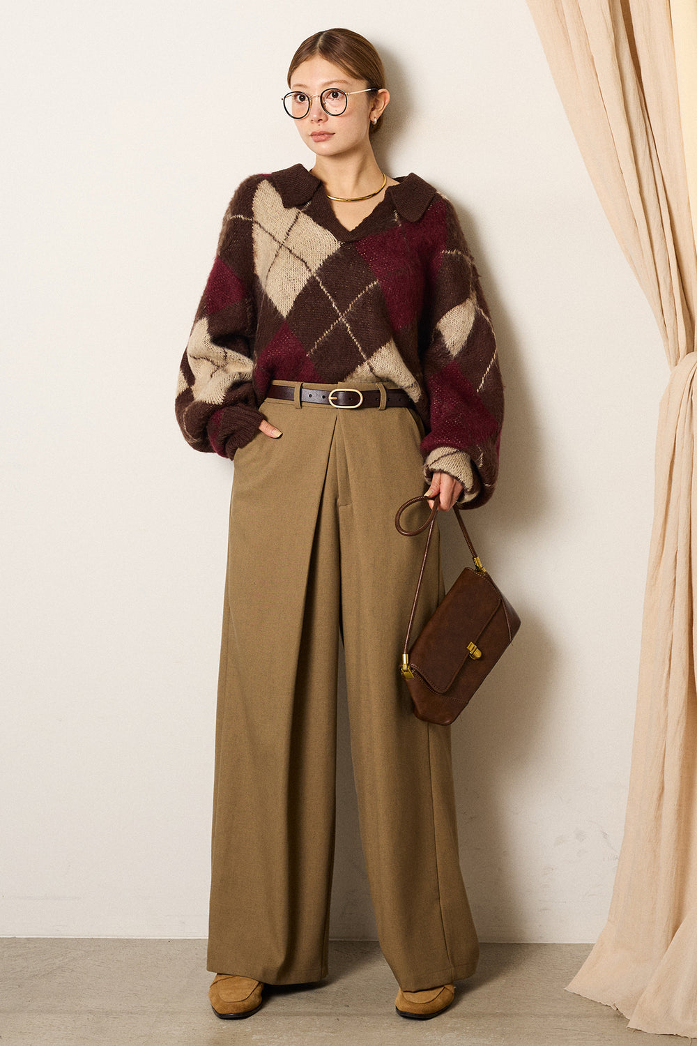 [SET]アクリルモヘアアーガイルキーネックプルオーバー+フロントワイドタックネップ入ワイドパンツ(2set)