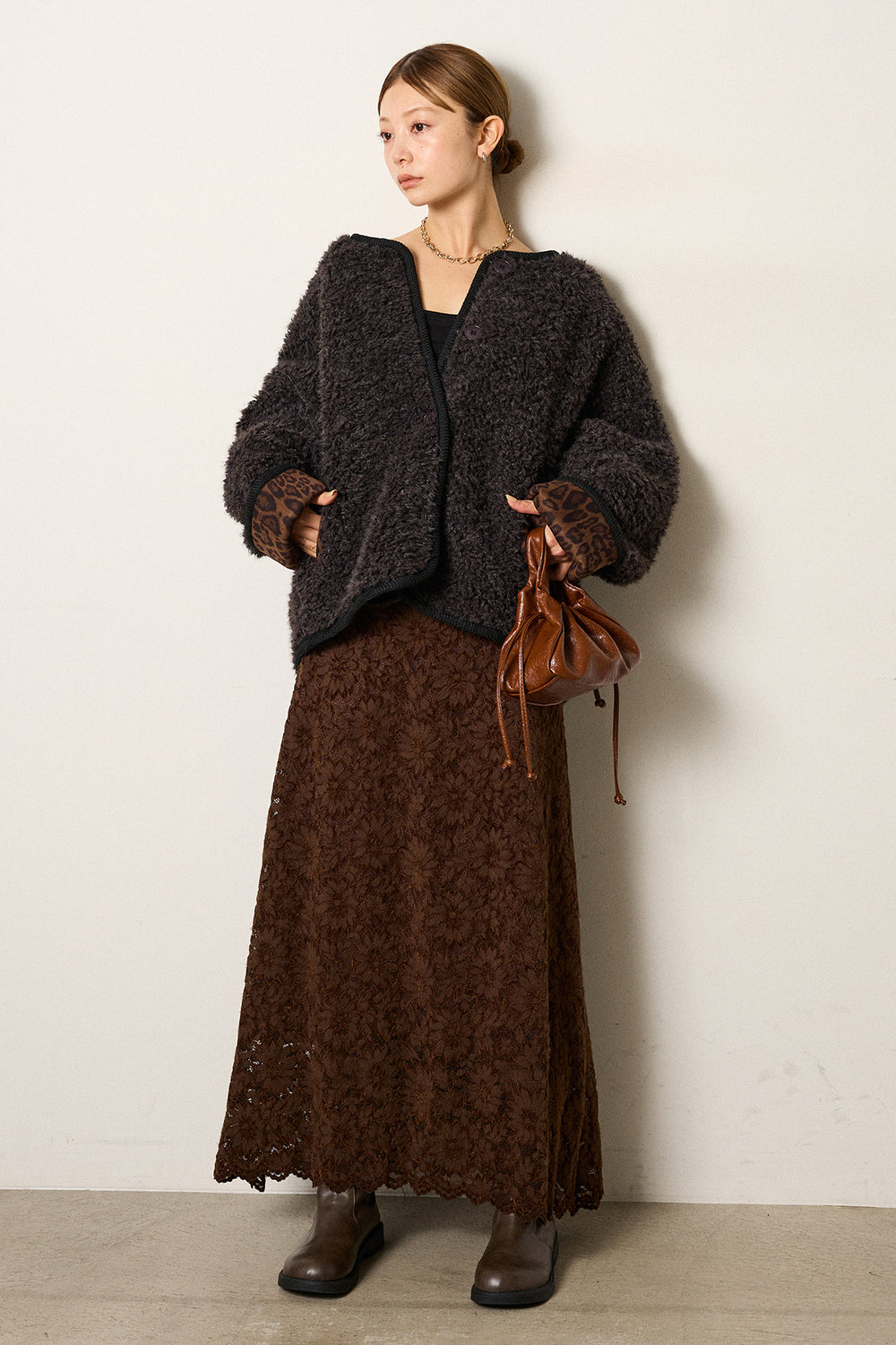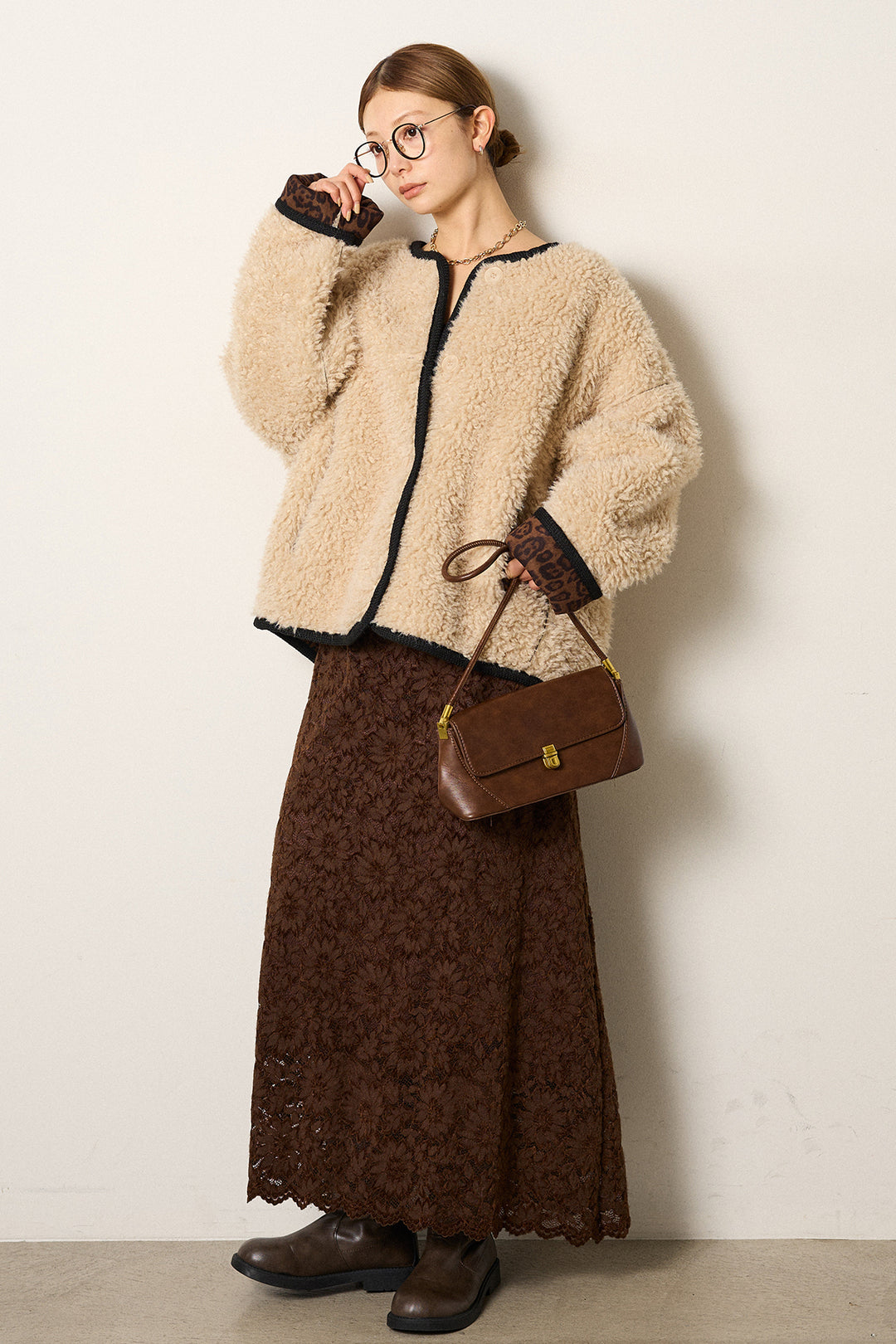 [SET]ノーカラー裏地レオパードボアアウター+花柄刺繍ベロアフレアスカート(2set)