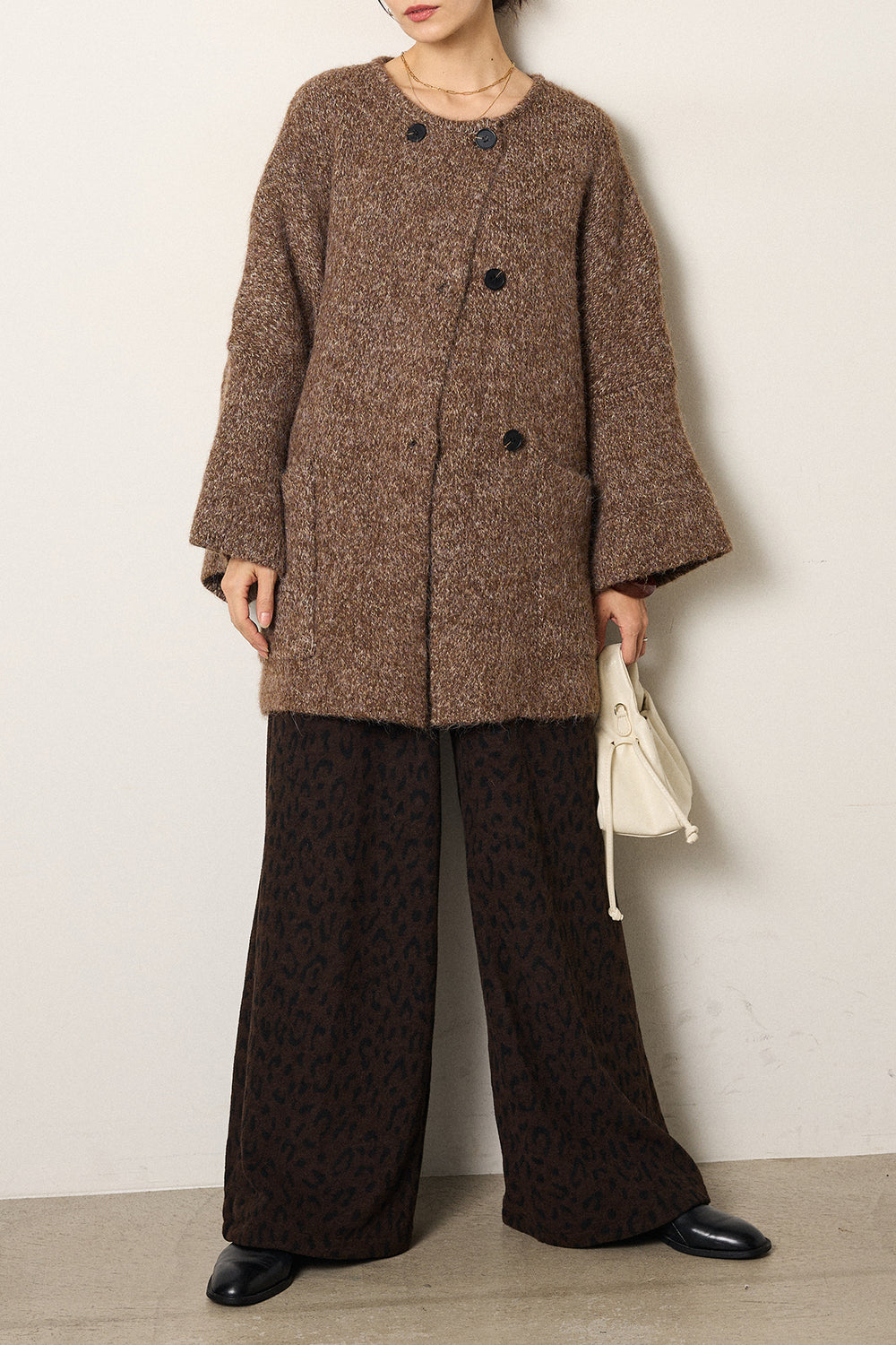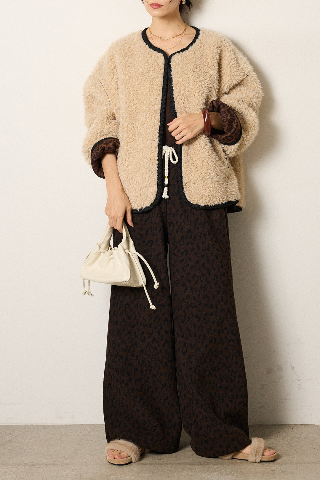 [SET]ノーカラー裏地レオパードボアアウター+レオパードジャガードニットパンツ(2set)
