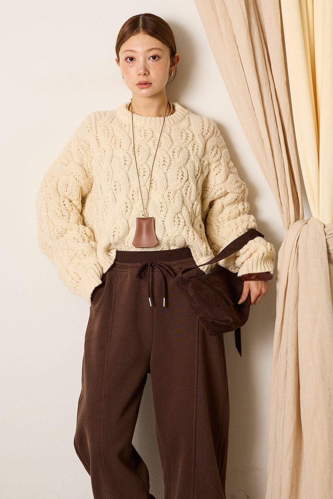 [SET]ケーブルリラックスショートニット+スウェットワイドカーブパンツ(2set)