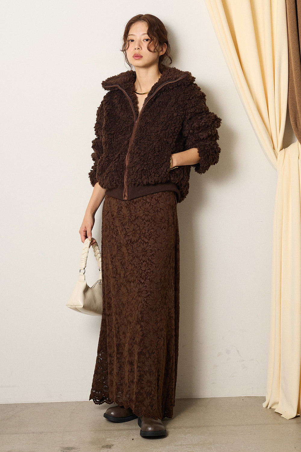 [SET]スタンドカラー裾リブボアブルゾン+花柄刺繍ベロアフレアスカート(2set)