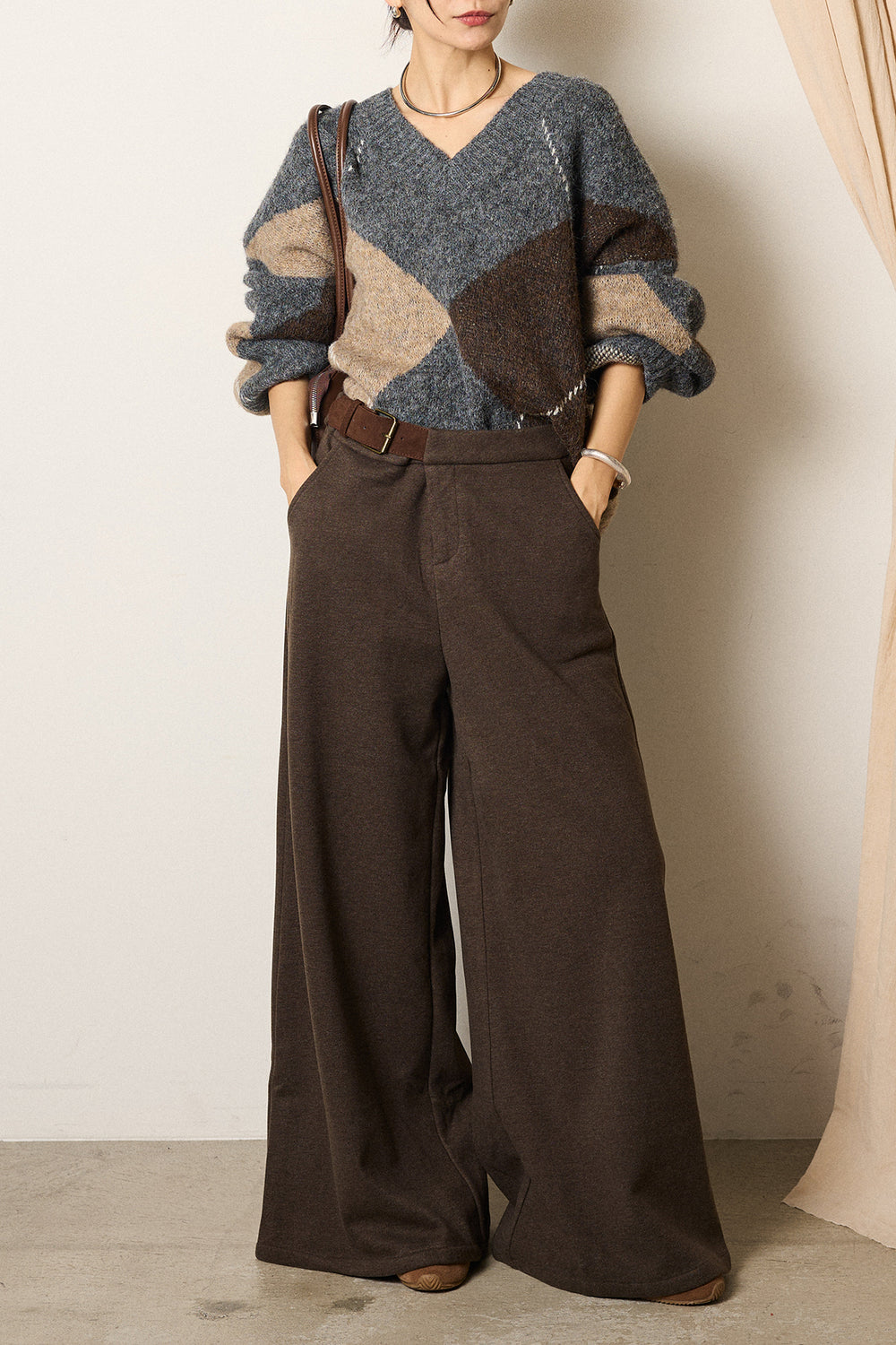 [SET]ルーズアーガイルVネックニット+サイドベルトパンツ(2set)