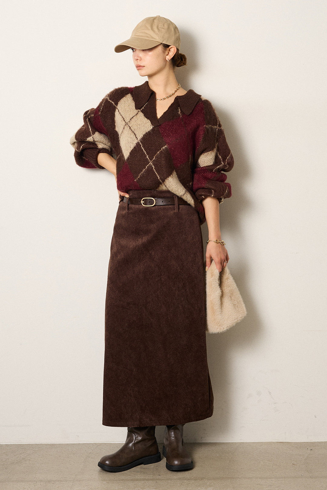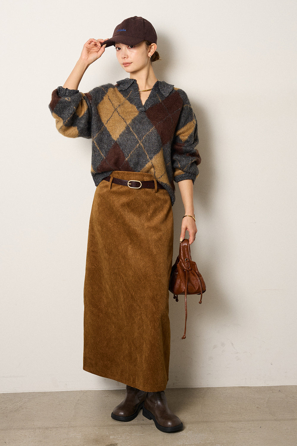 [SET]アクリルモヘアアーガイルキーネックプルオーバー+ロープベルト付きスウェード調スカート(2set)