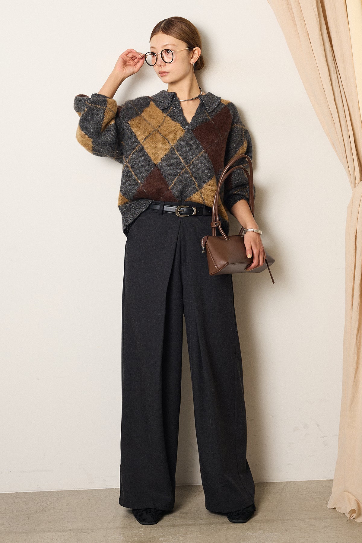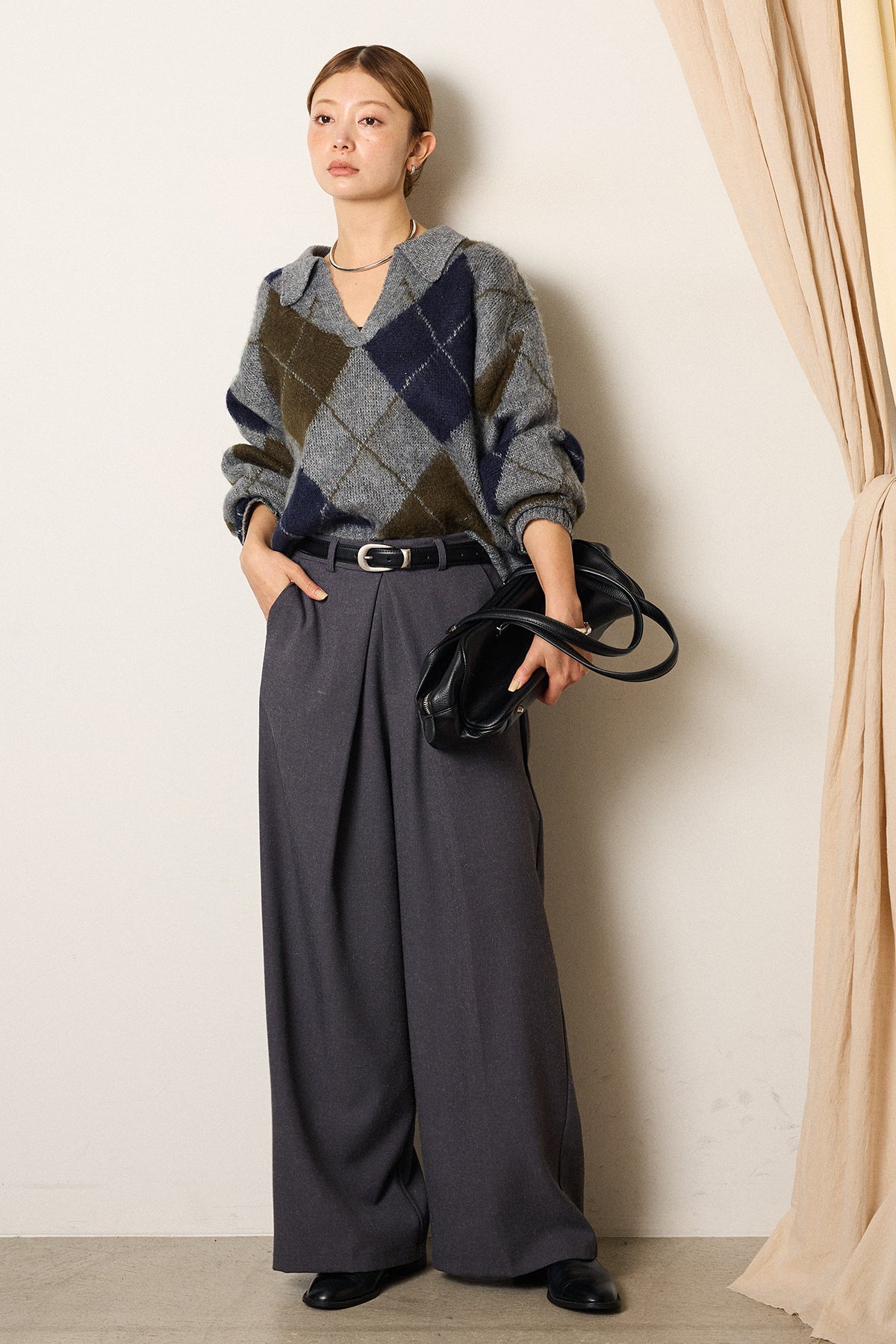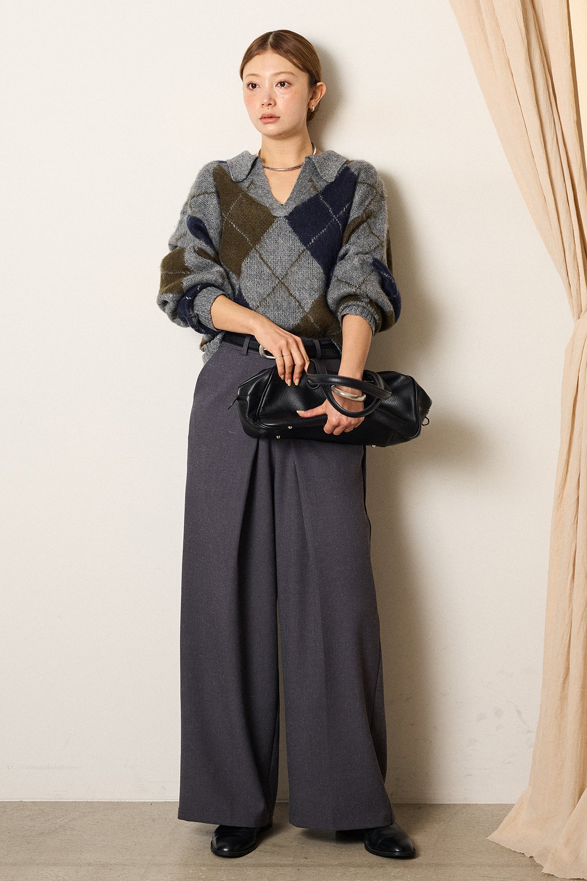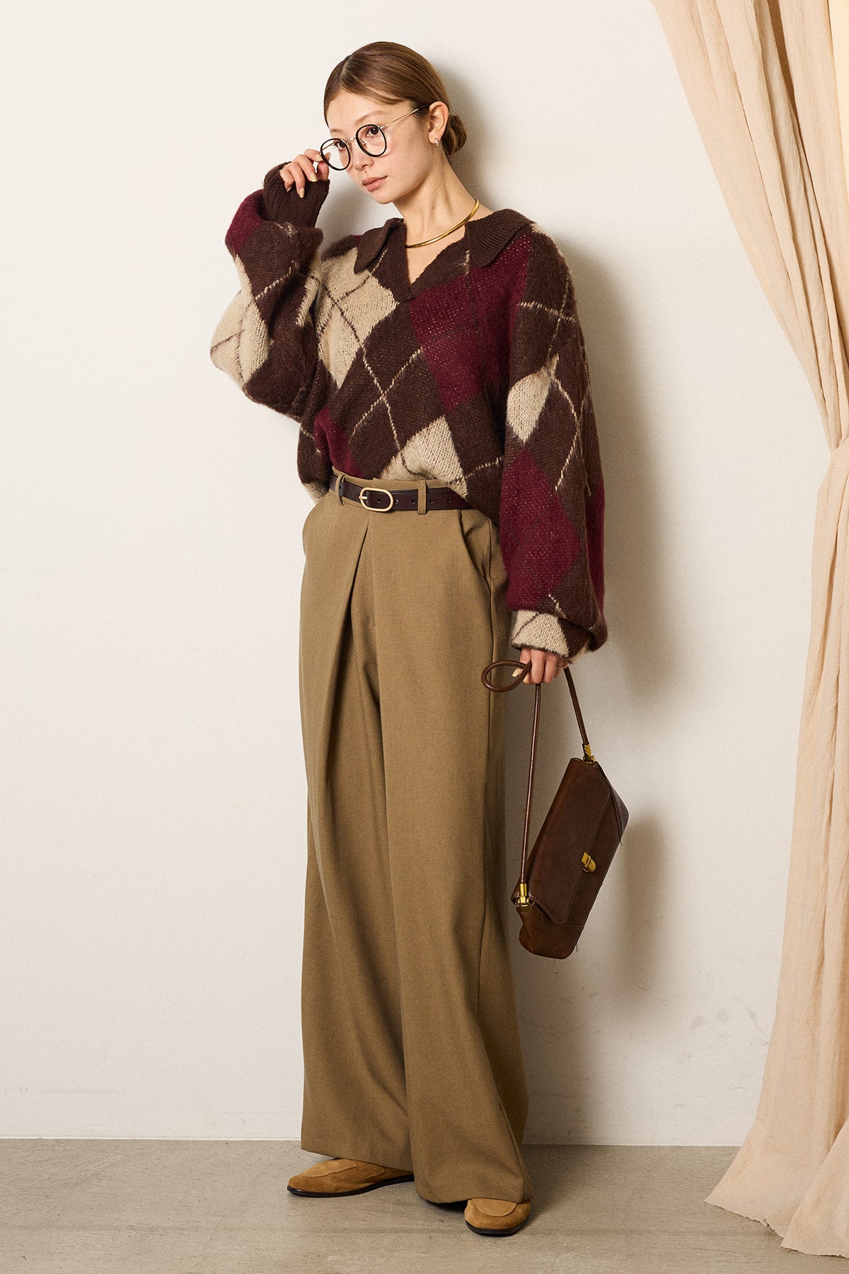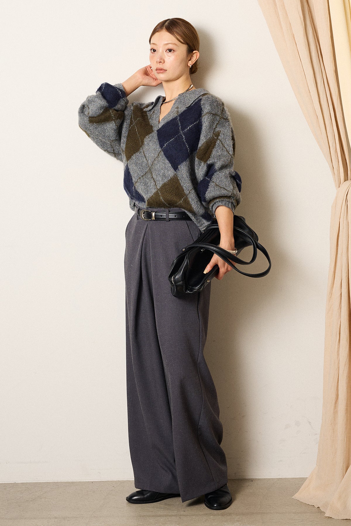 [SET]アクリルモヘアアーガイルキーネックプルオーバー+フロントワイドタックネップ入ワイドパンツ(2set)