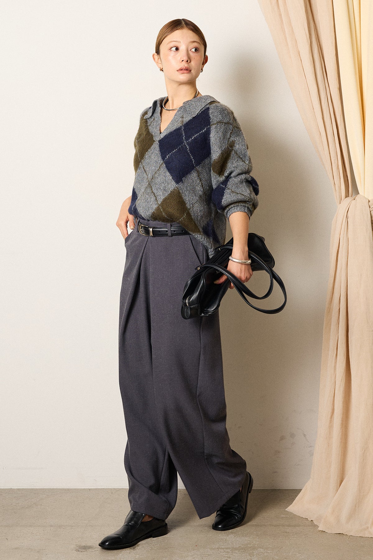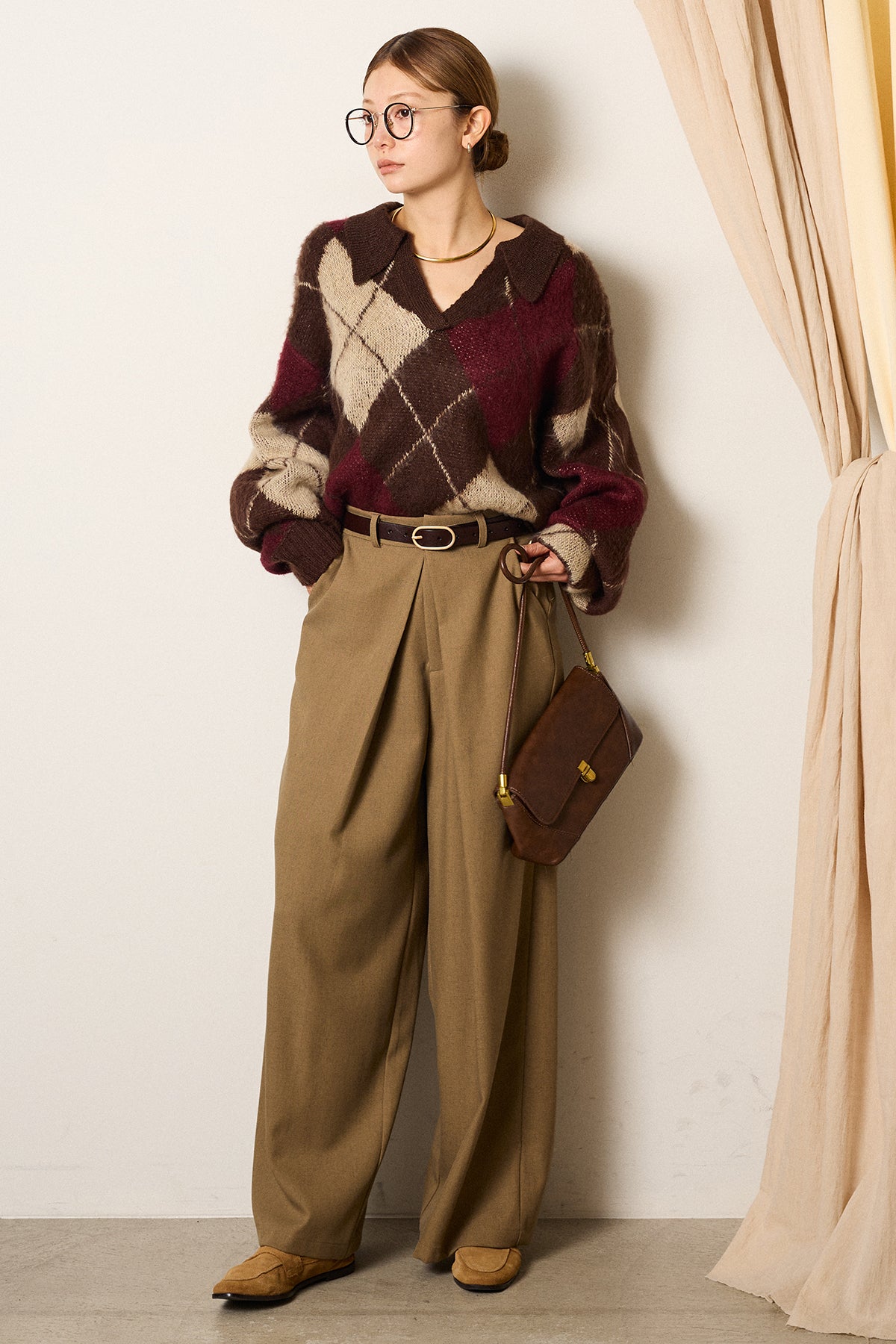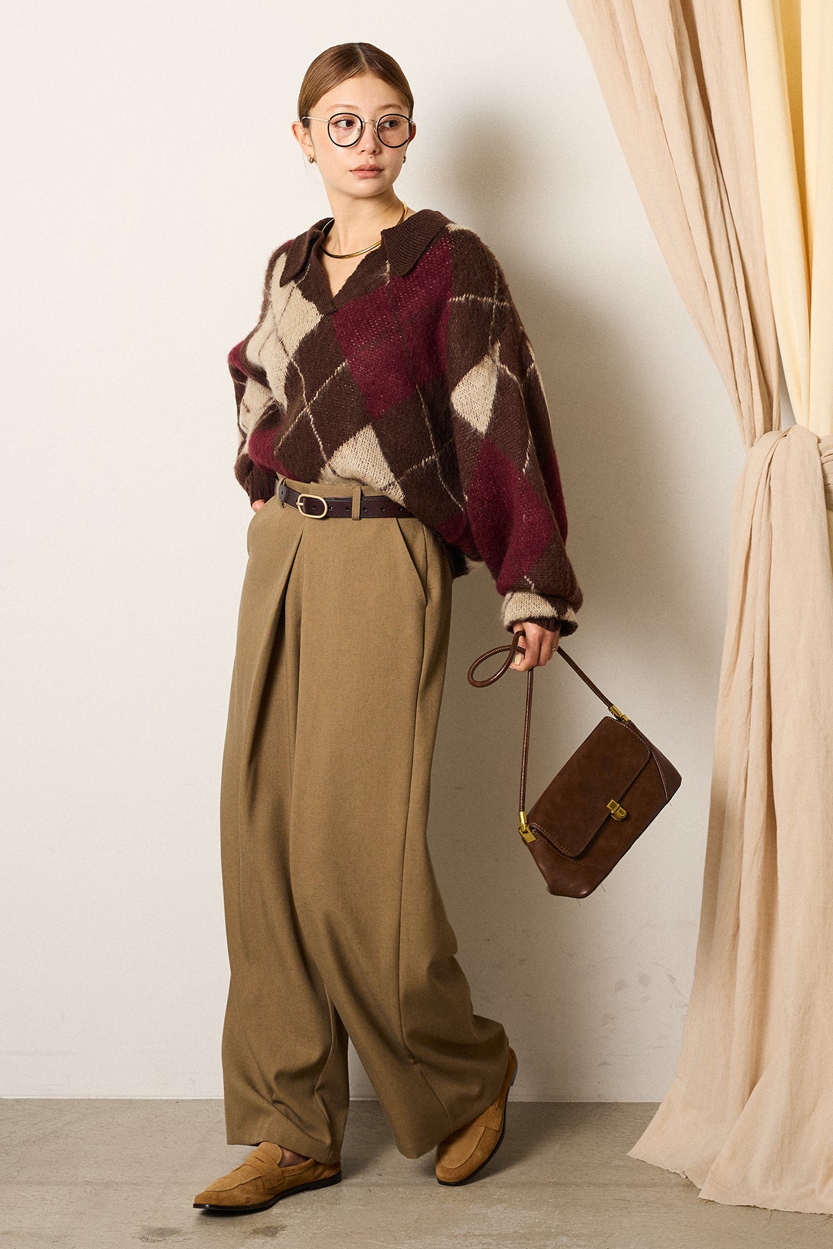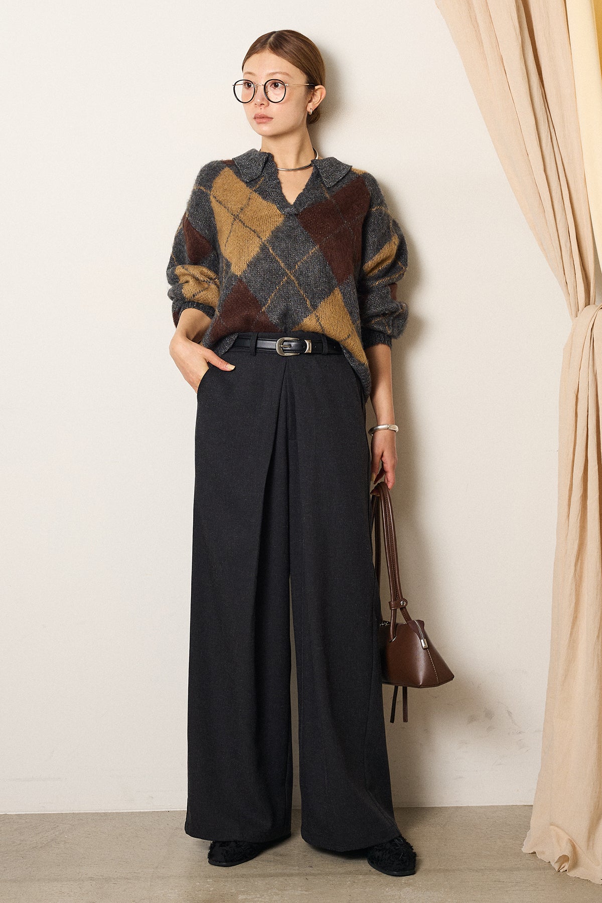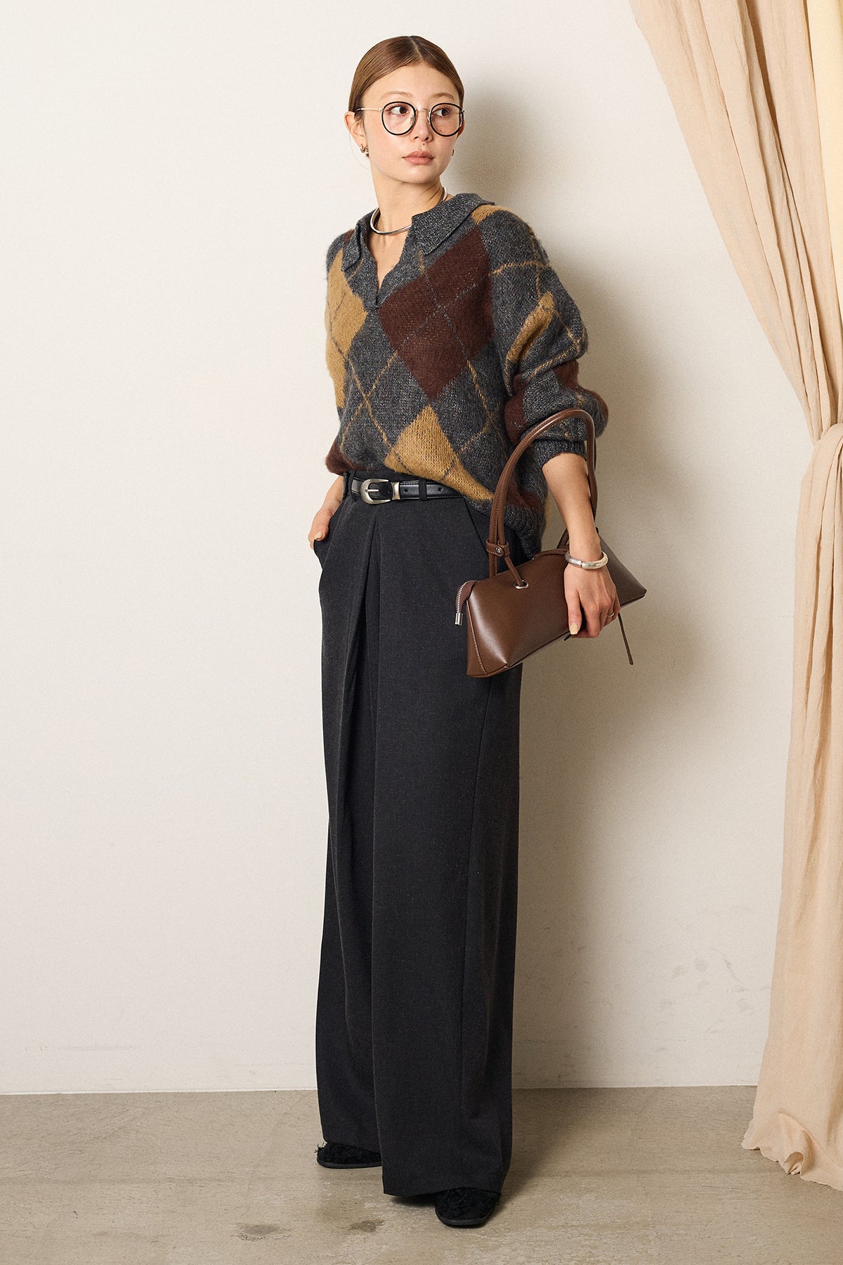 [SET]アクリルモヘアアーガイルキーネックプルオーバー+フロントワイドタックネップ入ワイドパンツ(2set)