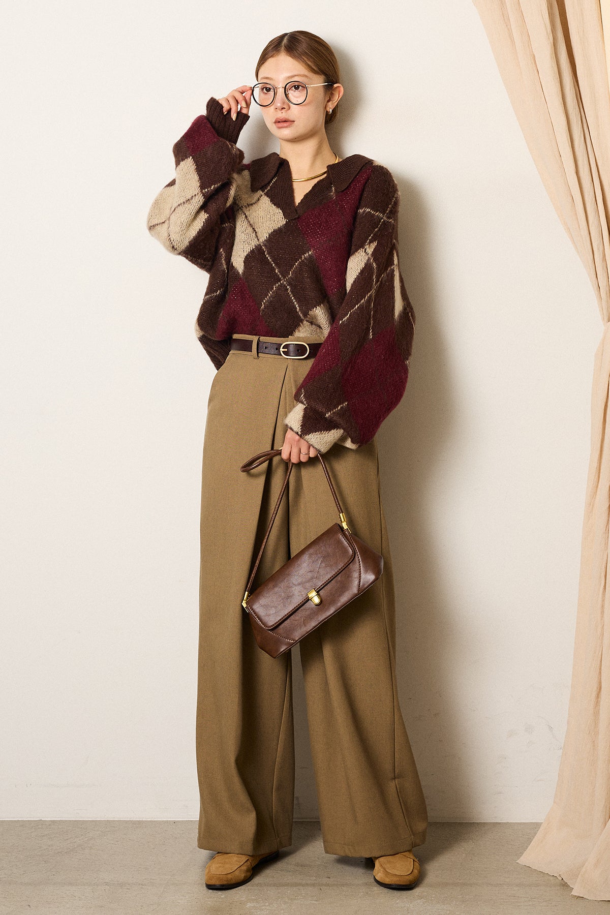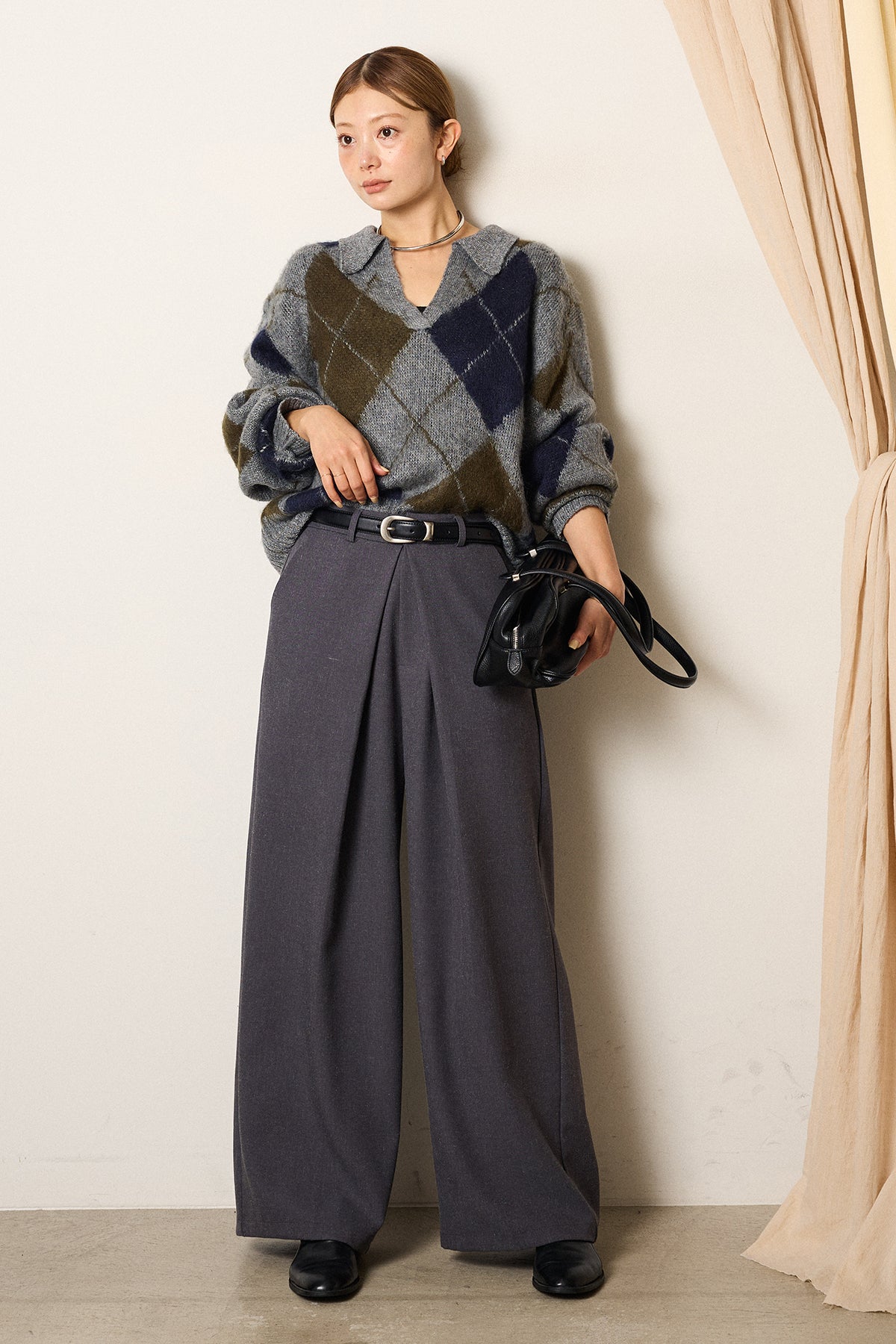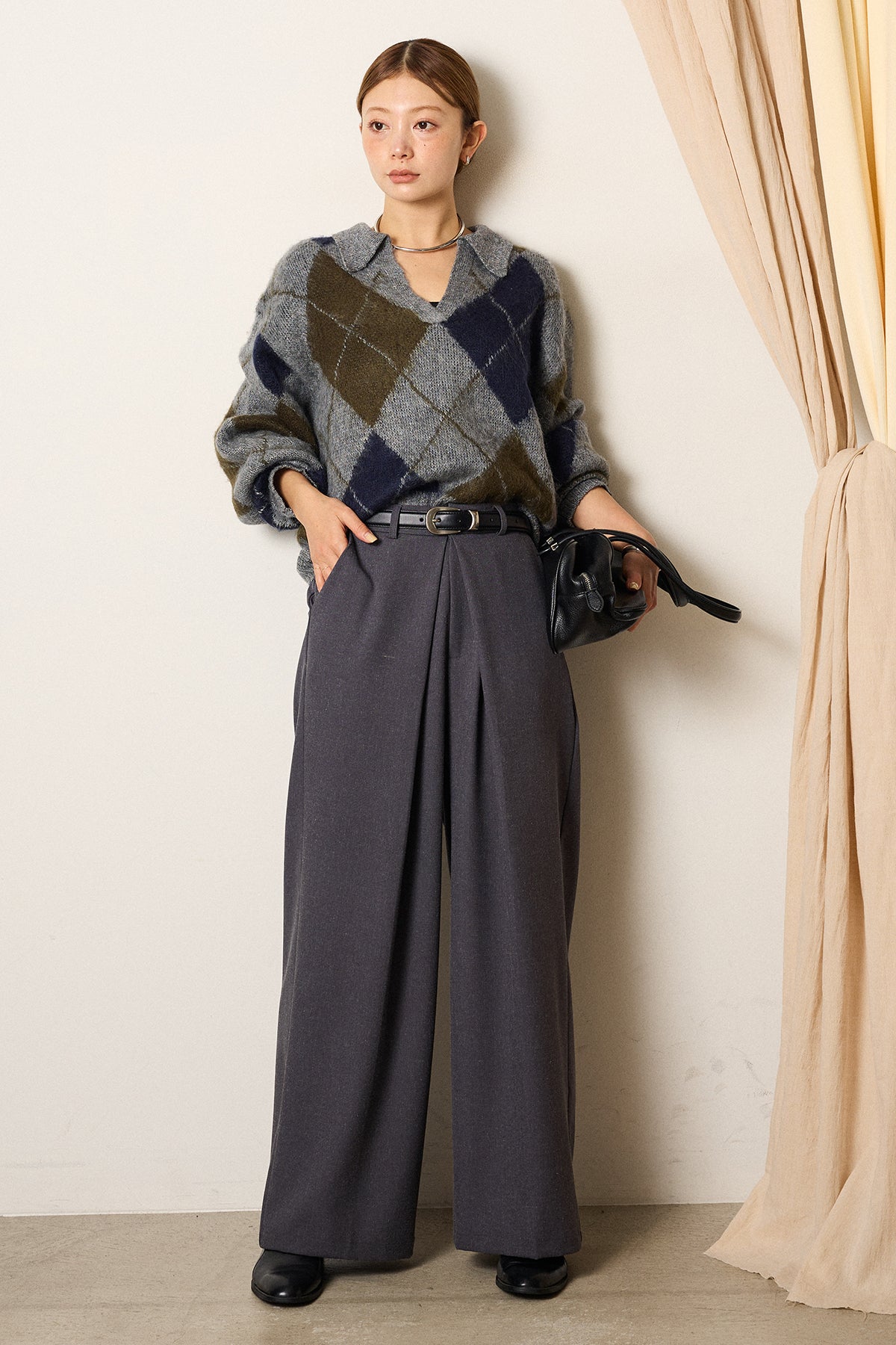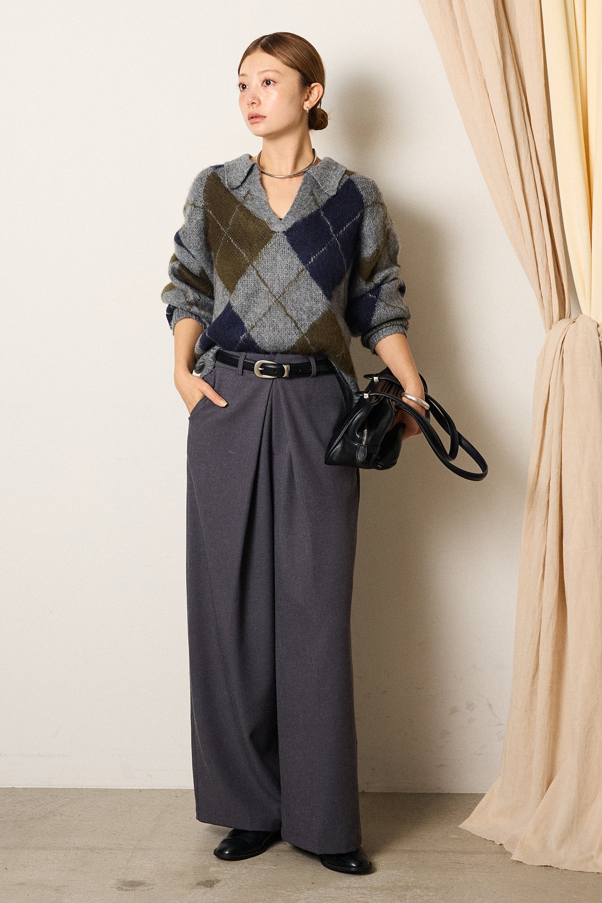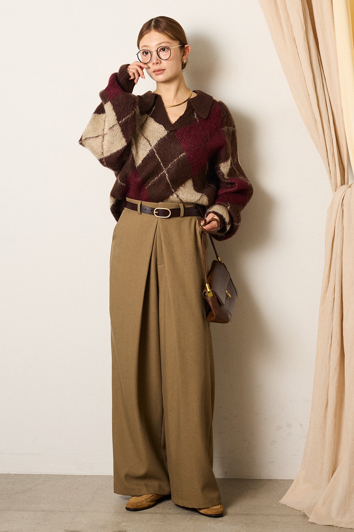 [SET]アクリルモヘアアーガイルキーネックプルオーバー+フロントワイドタックネップ入ワイドパンツ(2set)